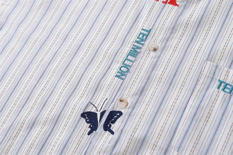 Wiaofellas - Men Streetwear Harajuku Shirt Retro Fun Embroiderey Striped Shirt Loose Hip Hop Oversize Shirts Summer Couple Short Sleeve