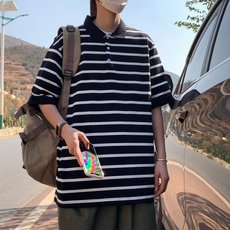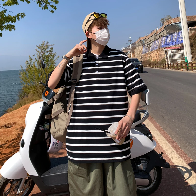 Wiaofellas - New Men's Summer Stripe Short Sleeve Polo T-shirt Japanese Casual Men's Top Clothes for Men Turn-down Collar Loose A126