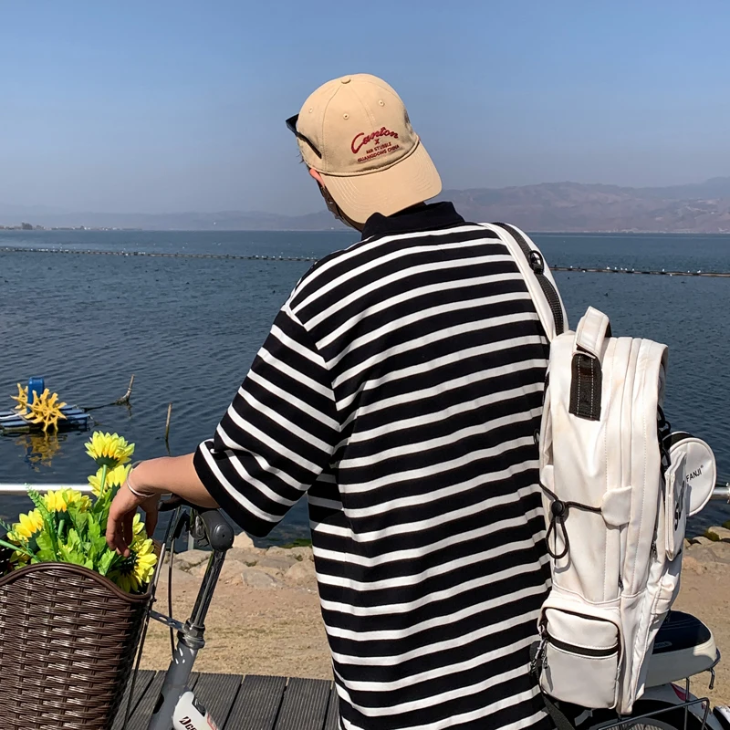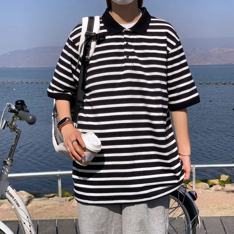 Wiaofellas  -  New Men's Summer Stripe Short Sleeve Polo T-shirt Japanese Casual Men's Top Clothes for Men Turn-down Collar Loose A126