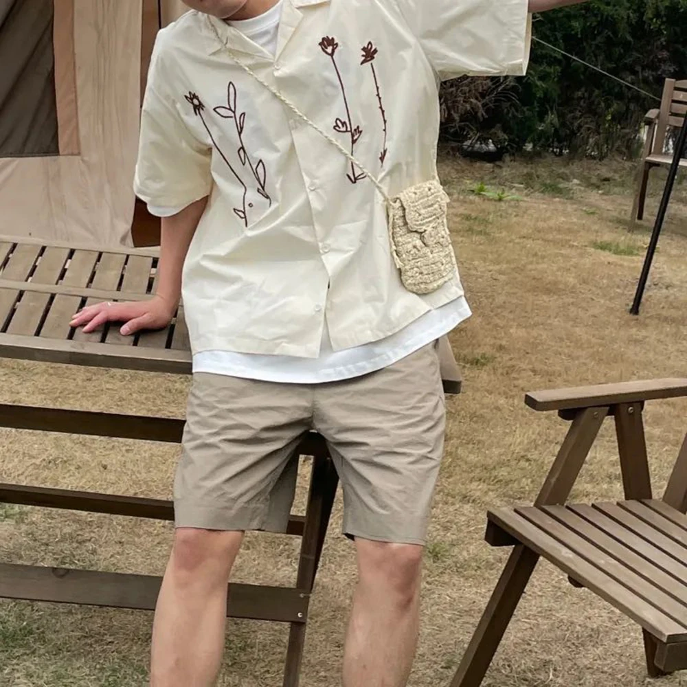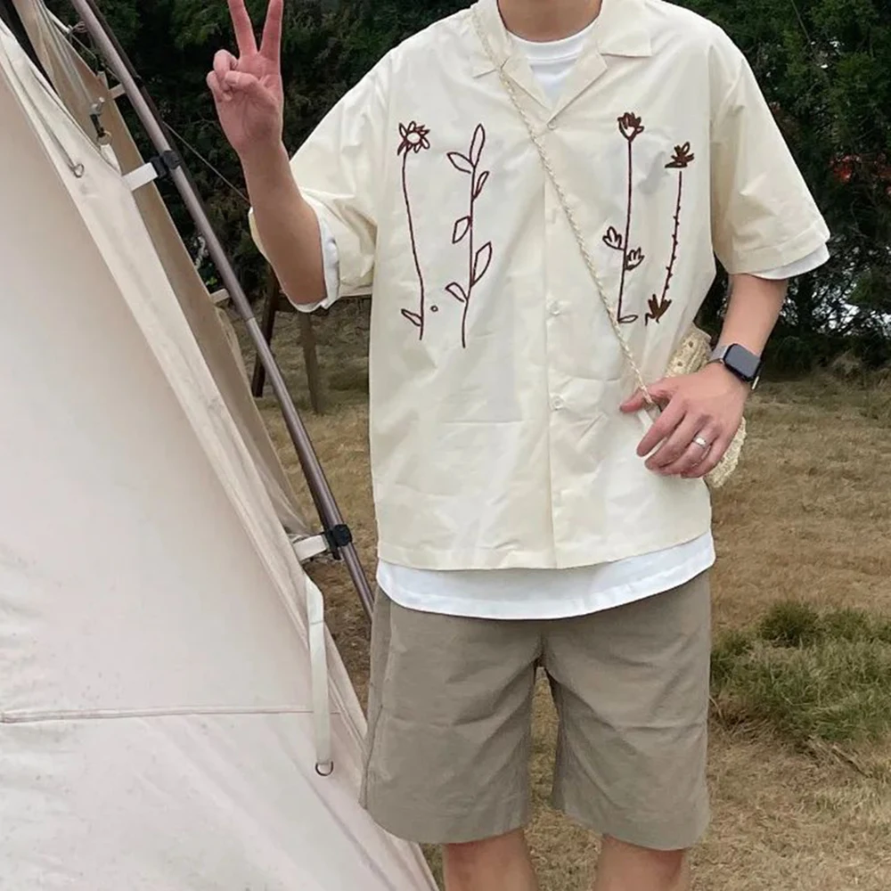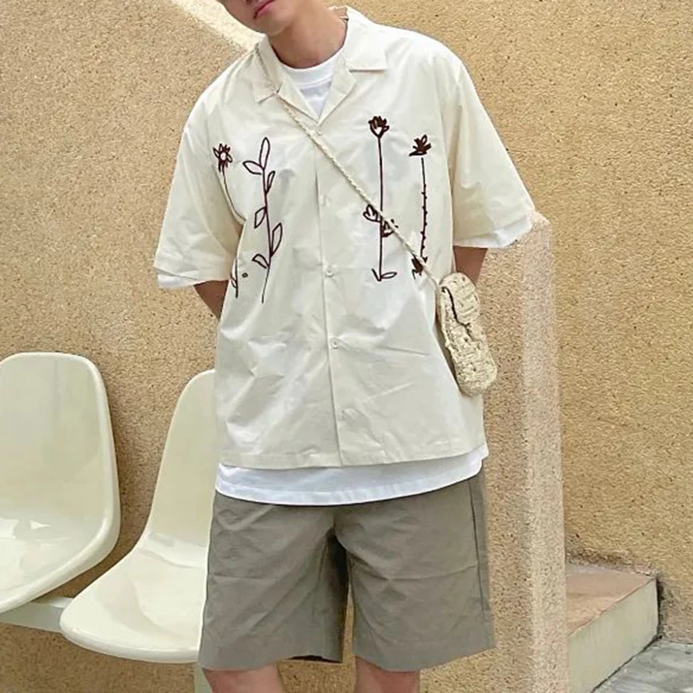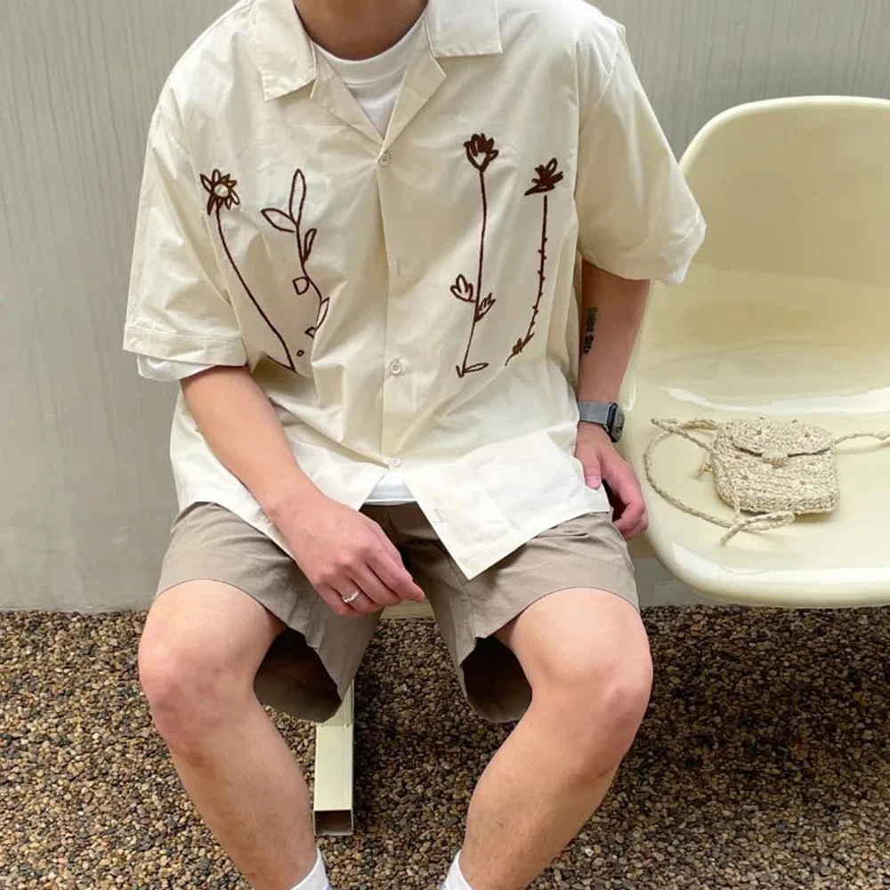 Wiaofellas  -  New Summer Mens High Quality Flower Embroidered Short Sleeve Shirt Short Sleeve Fashion Elegant Genderless Retro Lapel Top