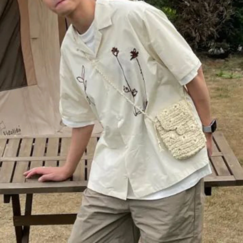 Wiaofellas - New Summer Mens High Quality Flower Embroidered Short Sleeve Shirt Short Sleeve Fashion Elegant Genderless Retro Lapel Top
