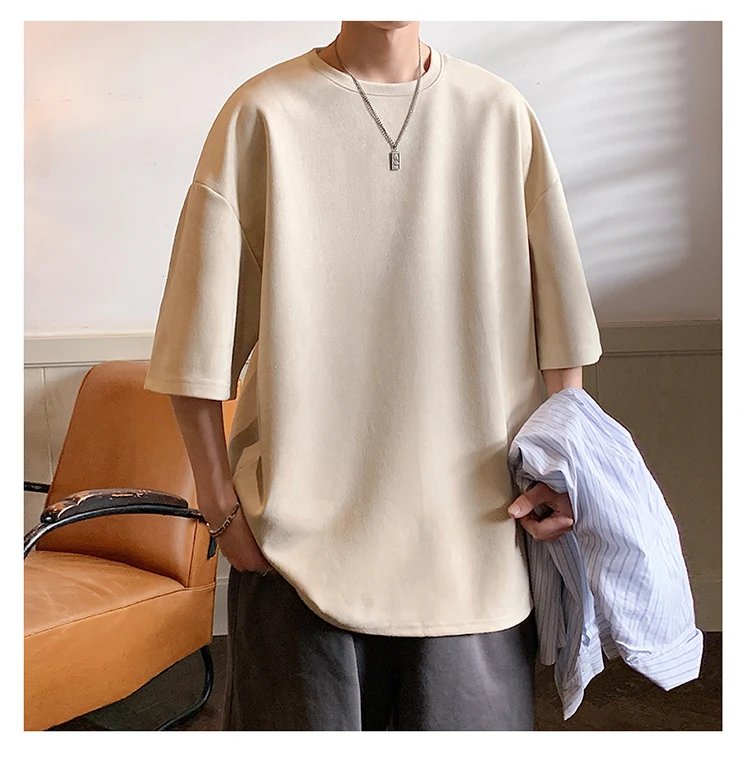 Wiaofellas - Summer Cotton T-shirt Men Fashion Retro Suede T Shirts Men Streetwear Hip Hop Loose Round Neck Solid Color Tshirt Mens Tops