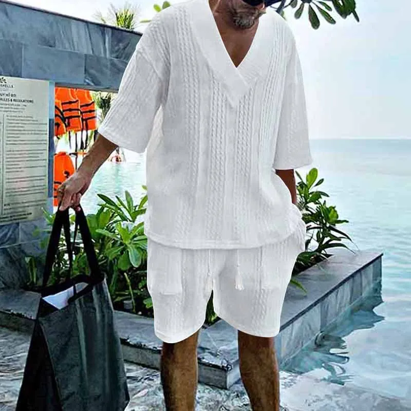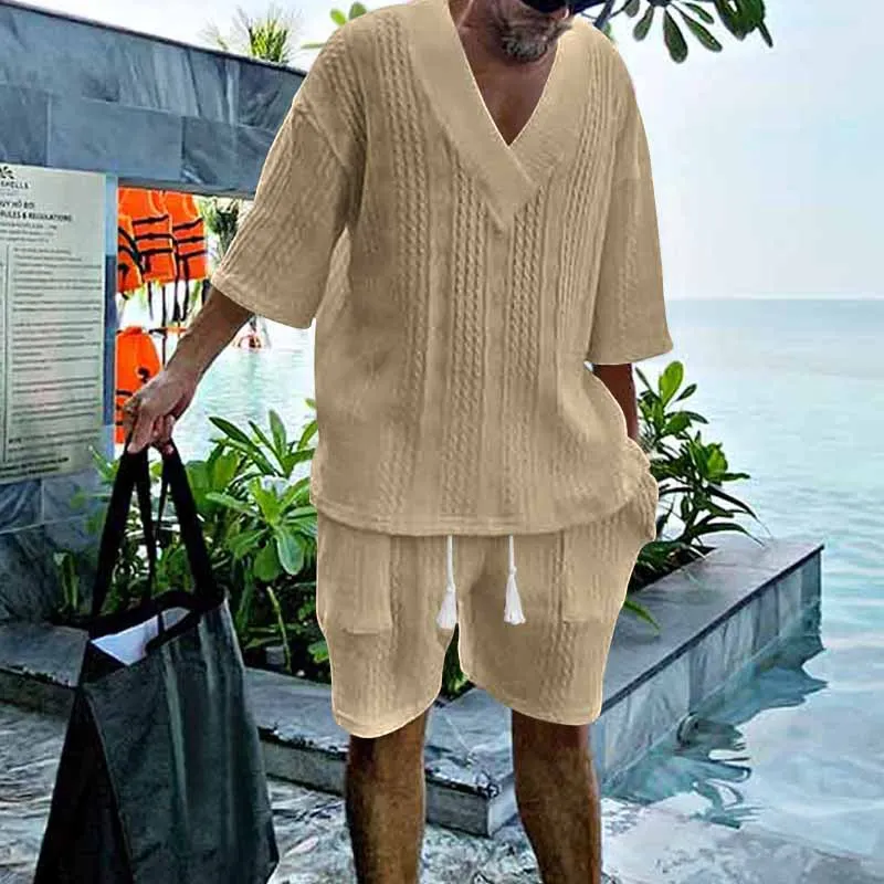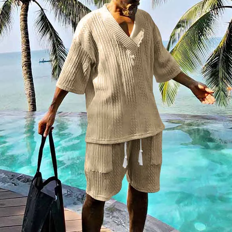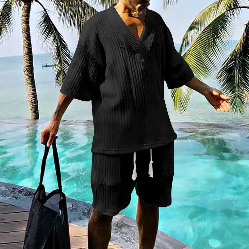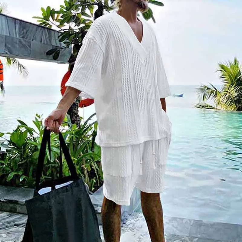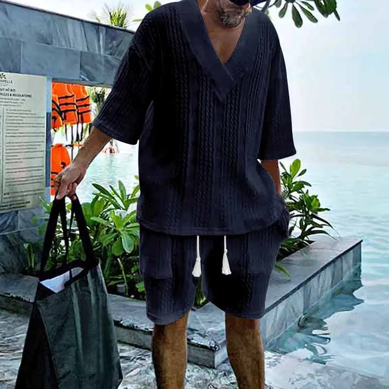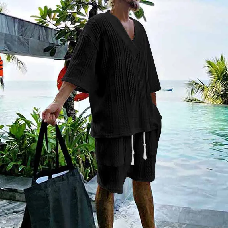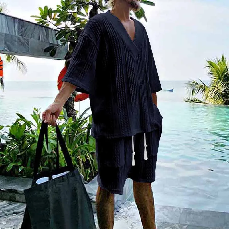 Wiaofellas - summer casual jacquard suit men's summer loose short sleeve T-shirt shorts V-neck sports suit two-piece men's suit