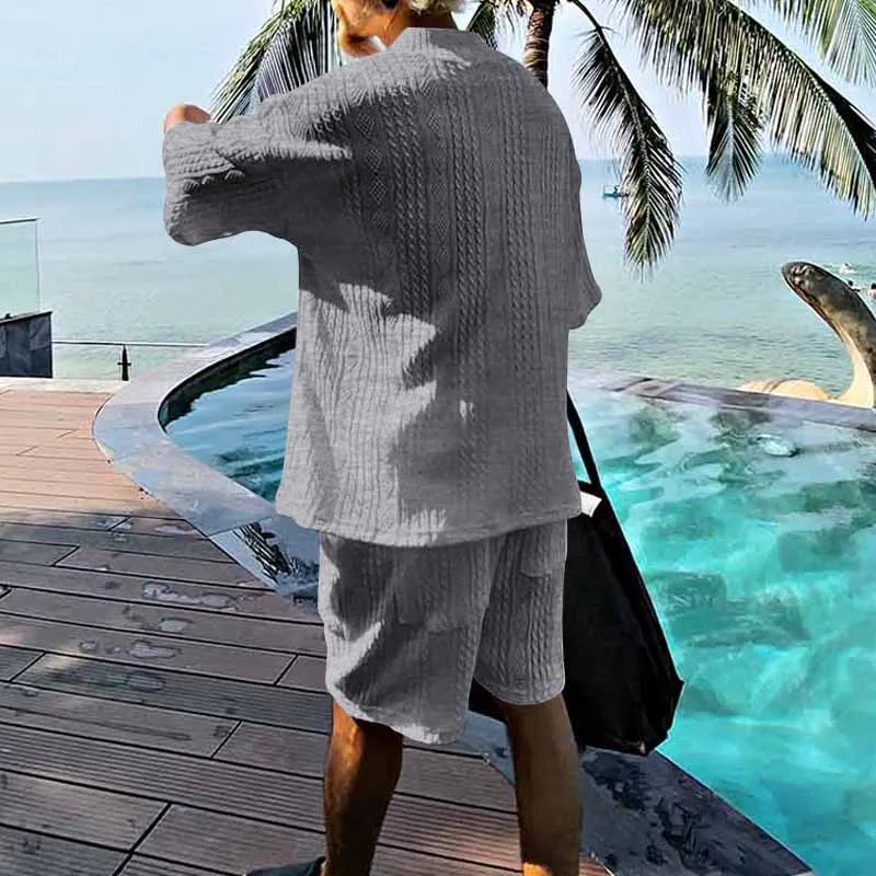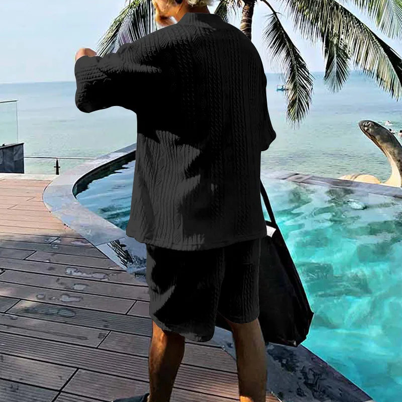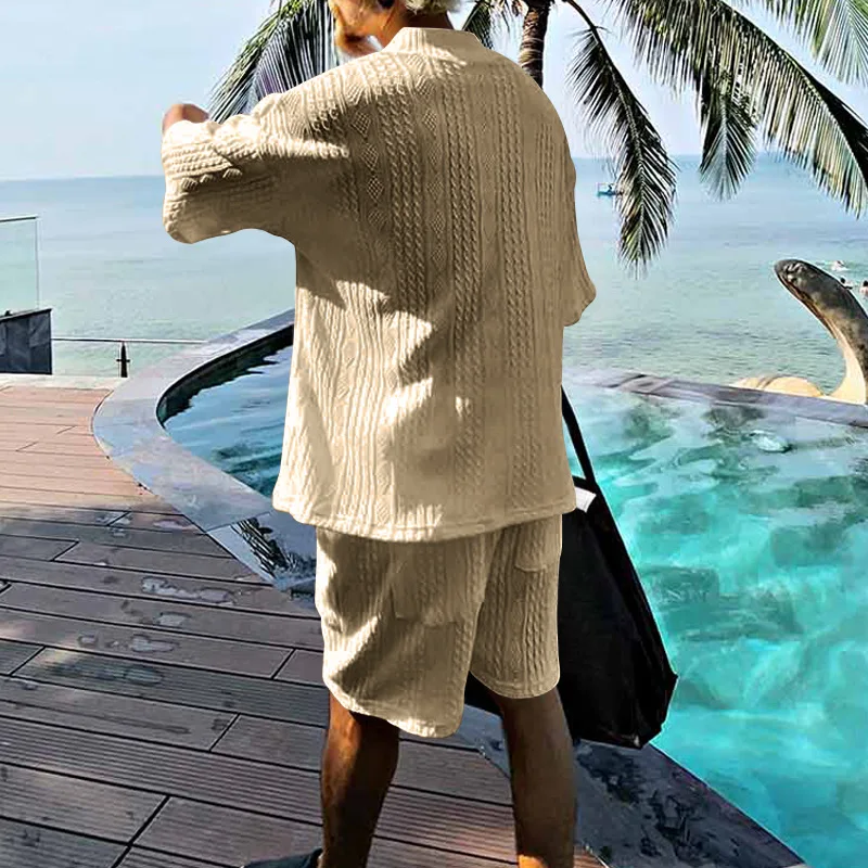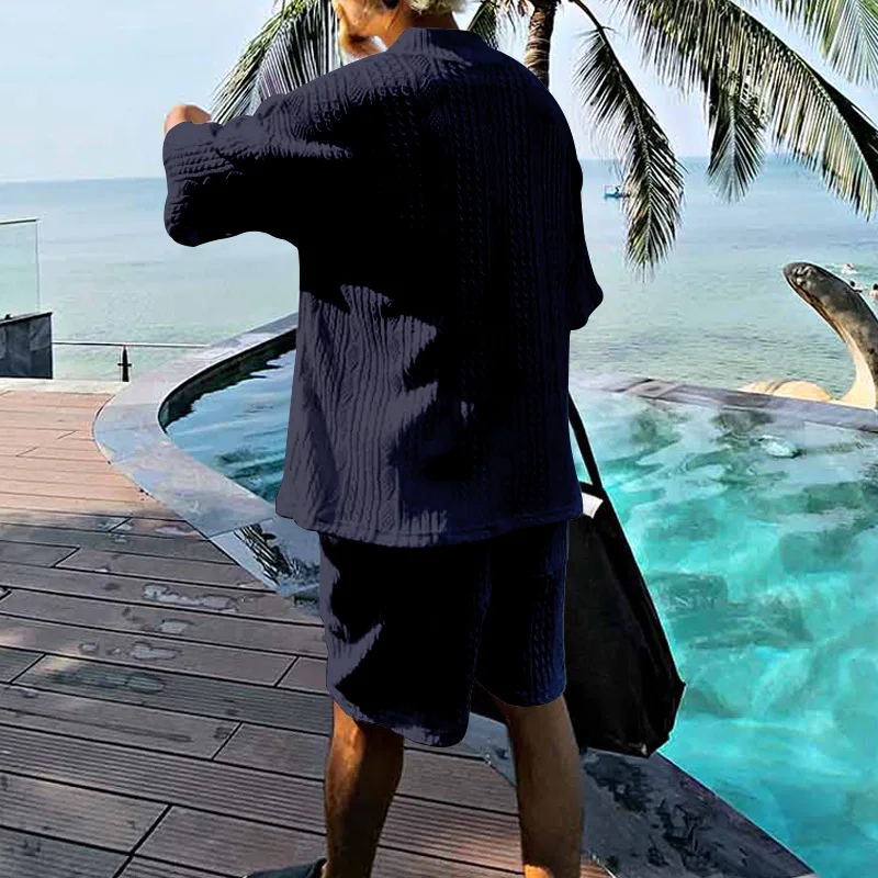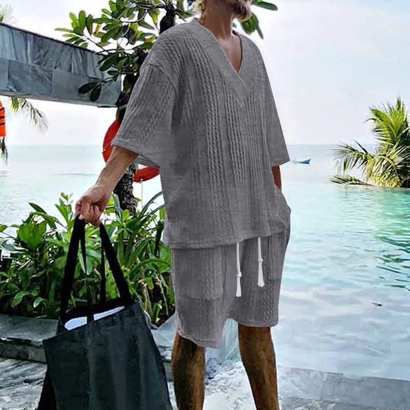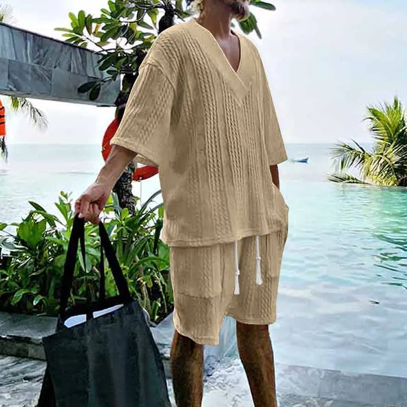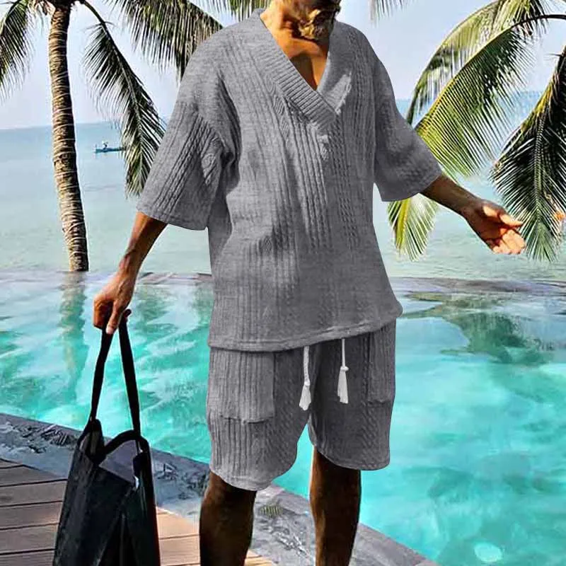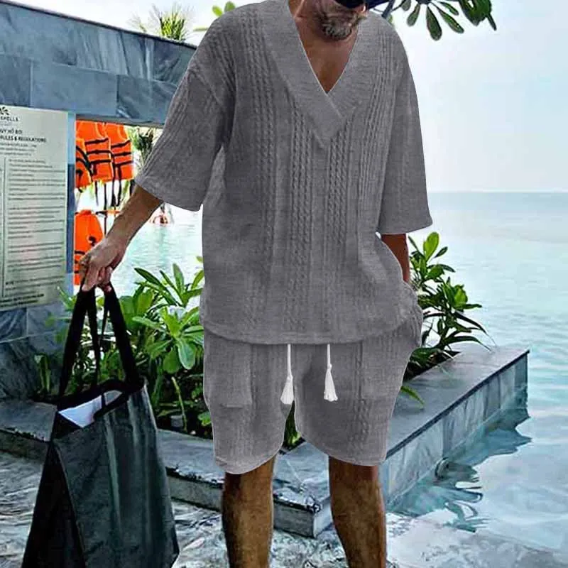Wiaofellas - summer casual jacquard suit men's summer loose short sleeve T-shirt shorts V-neck sports suit two-piece men's suit