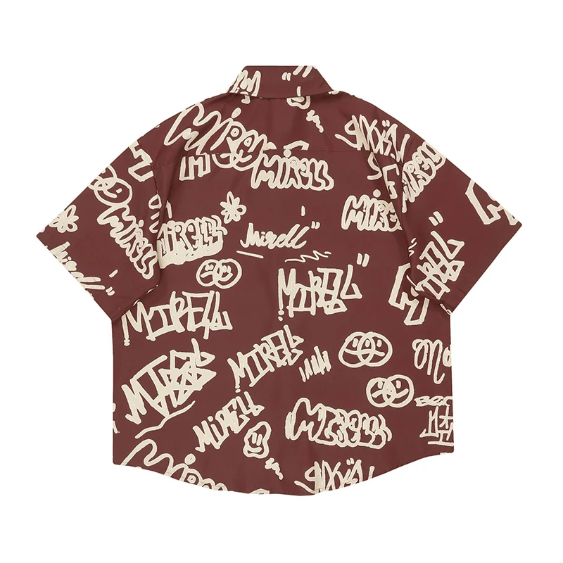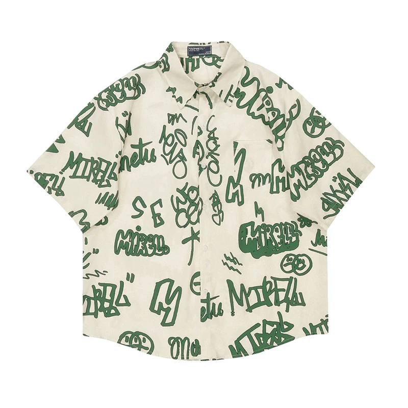 Wiaofellas - American Fun Letter Full Print Cargo Shirts Mens Summer Retro Casual Streetwear Lapel Couple Short Sleeve Shirts For Men Top Tee