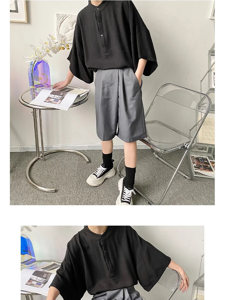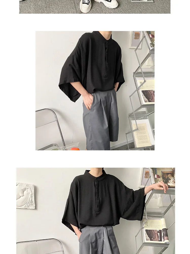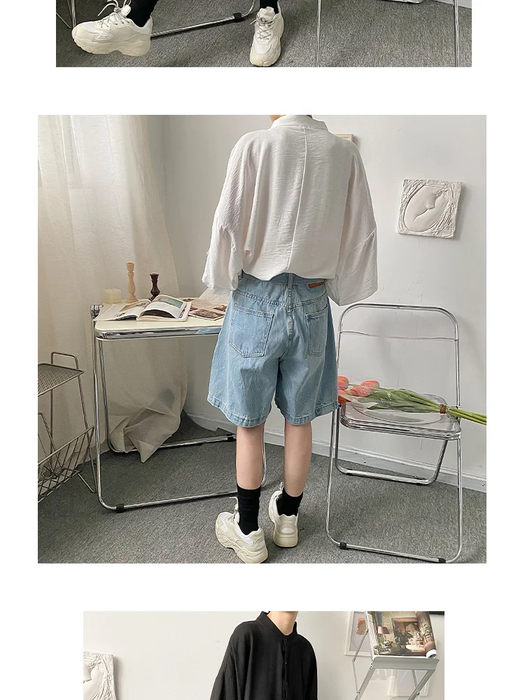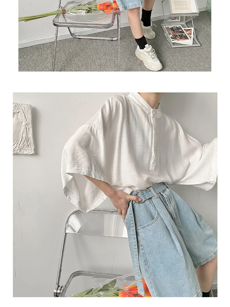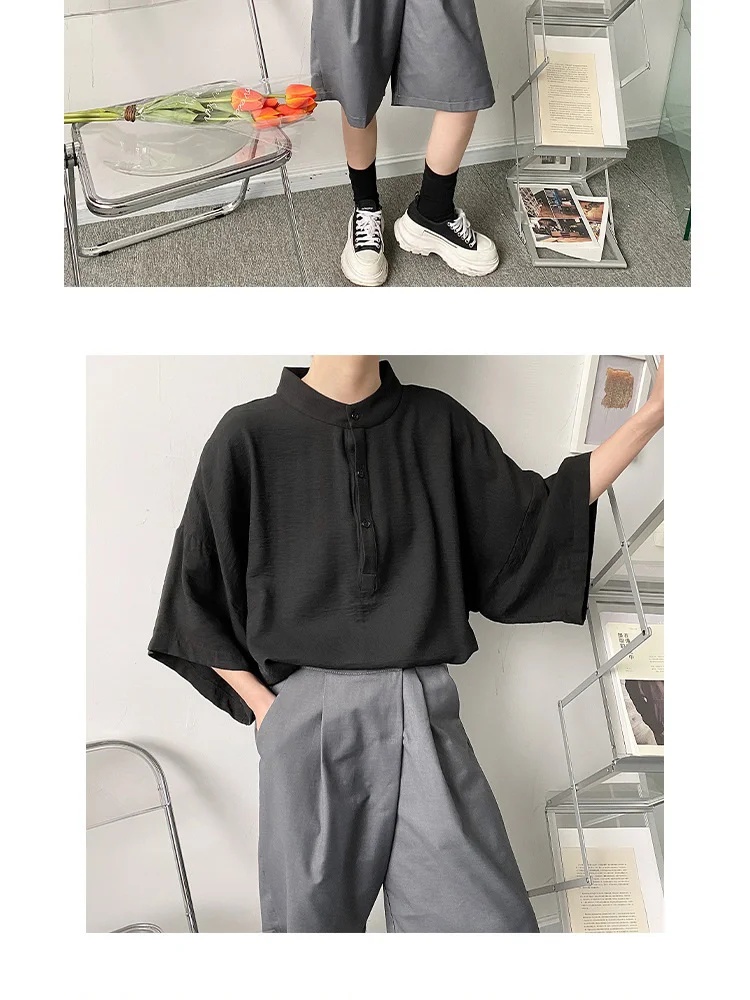 Wiaofellas - Casual Men's Solid Color Shirt Wrinkle Fabric Shoulder Sleeve Collar Button Korean Style New Fashion Blouse 2Y8380