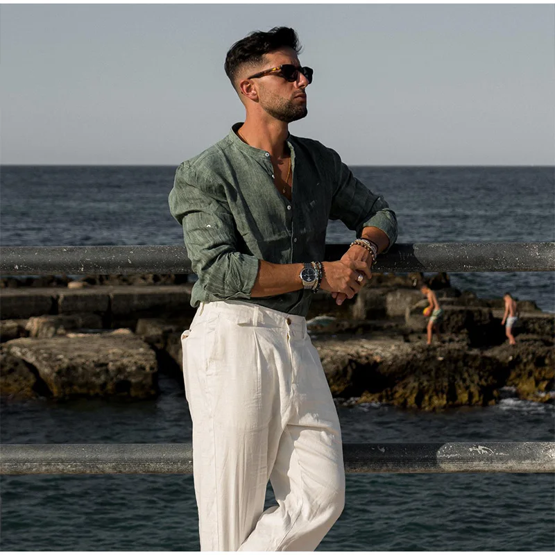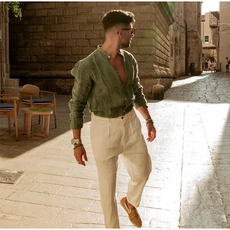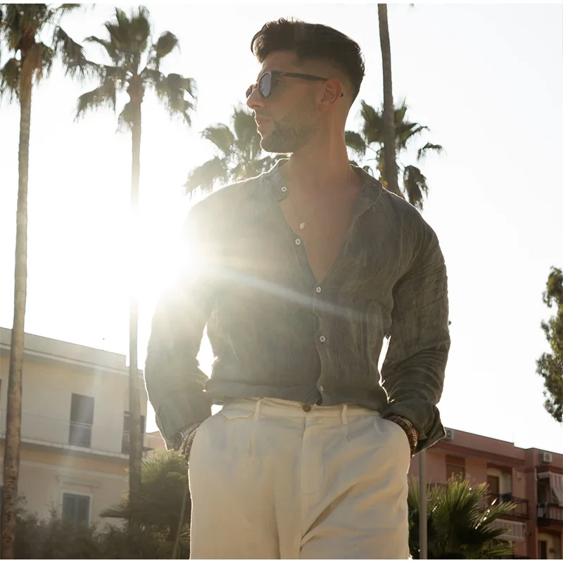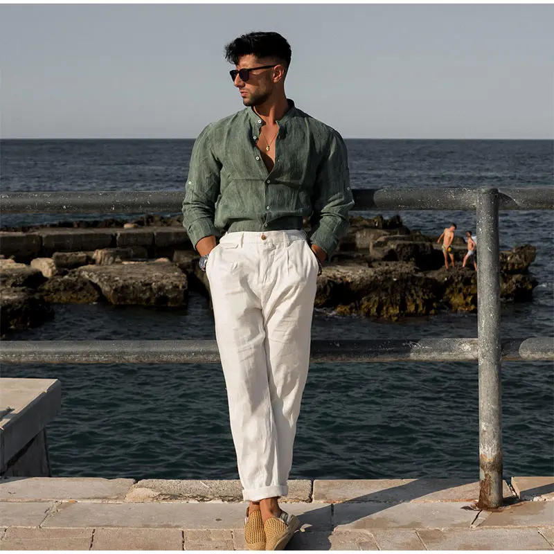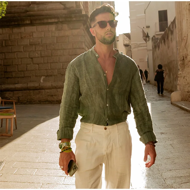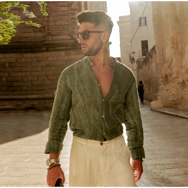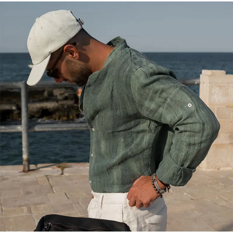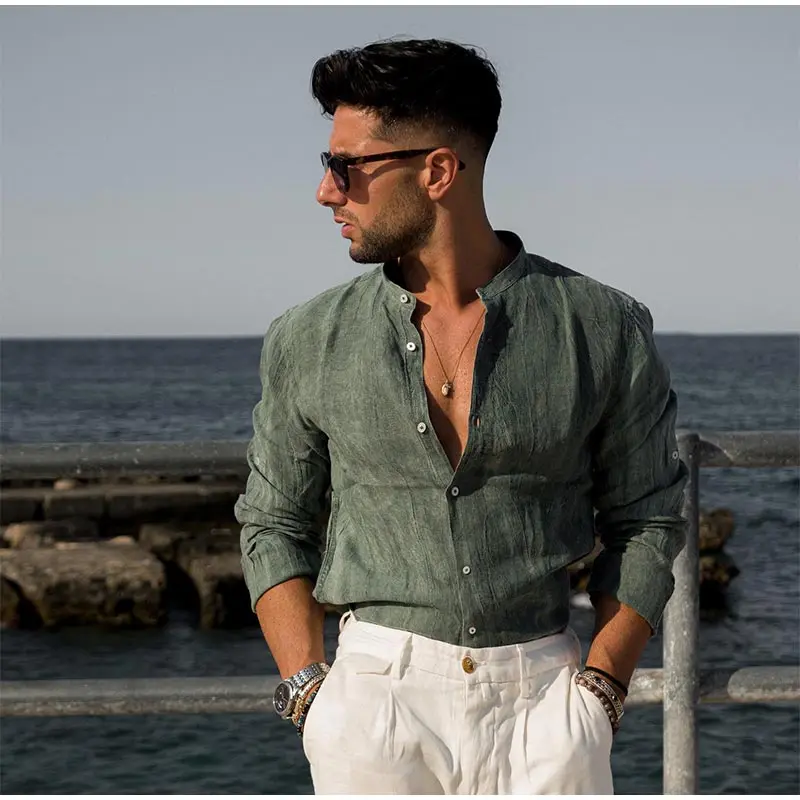 Wiaofellas - Casual Solid O Neck Long Sleeve T Shirt For Male Tendy Green Single Breasted Blouse Tops Summer Men's Business Tee Shirts