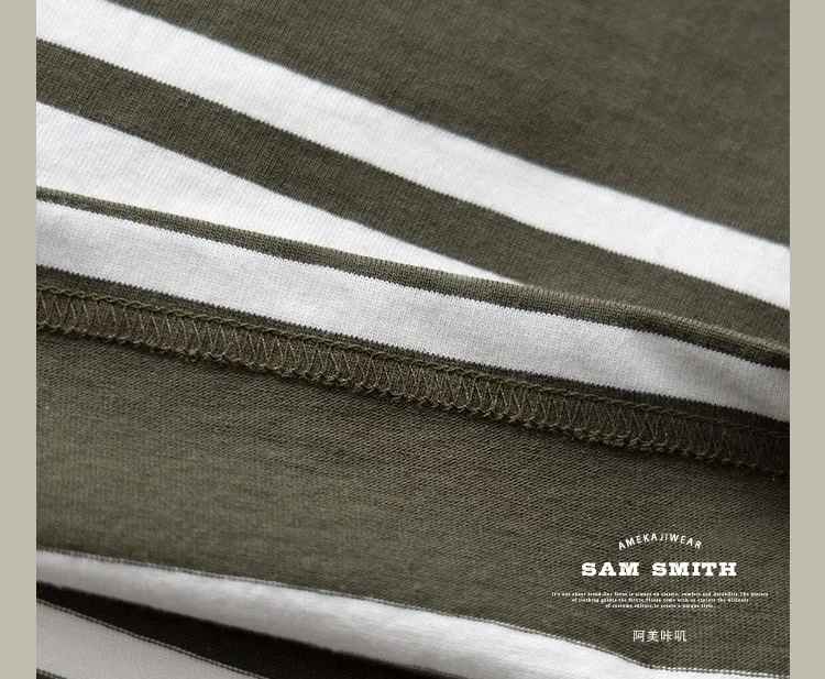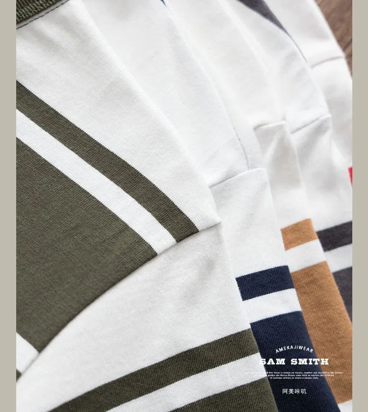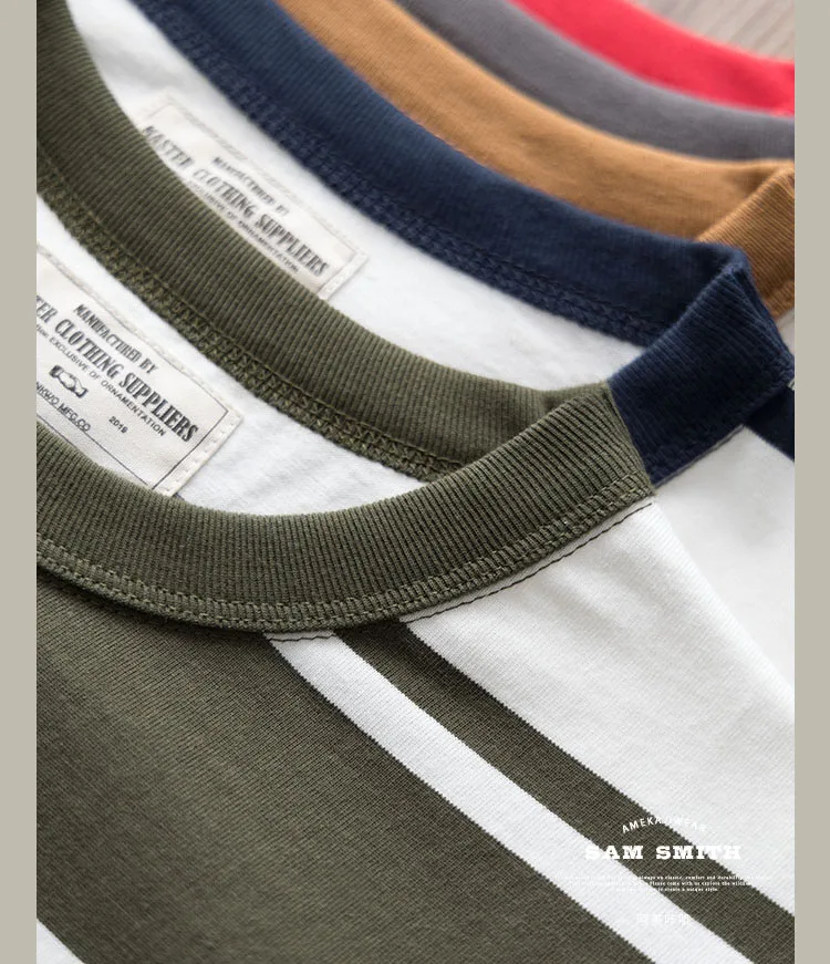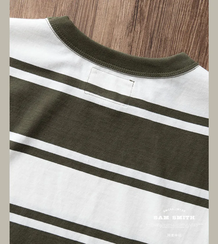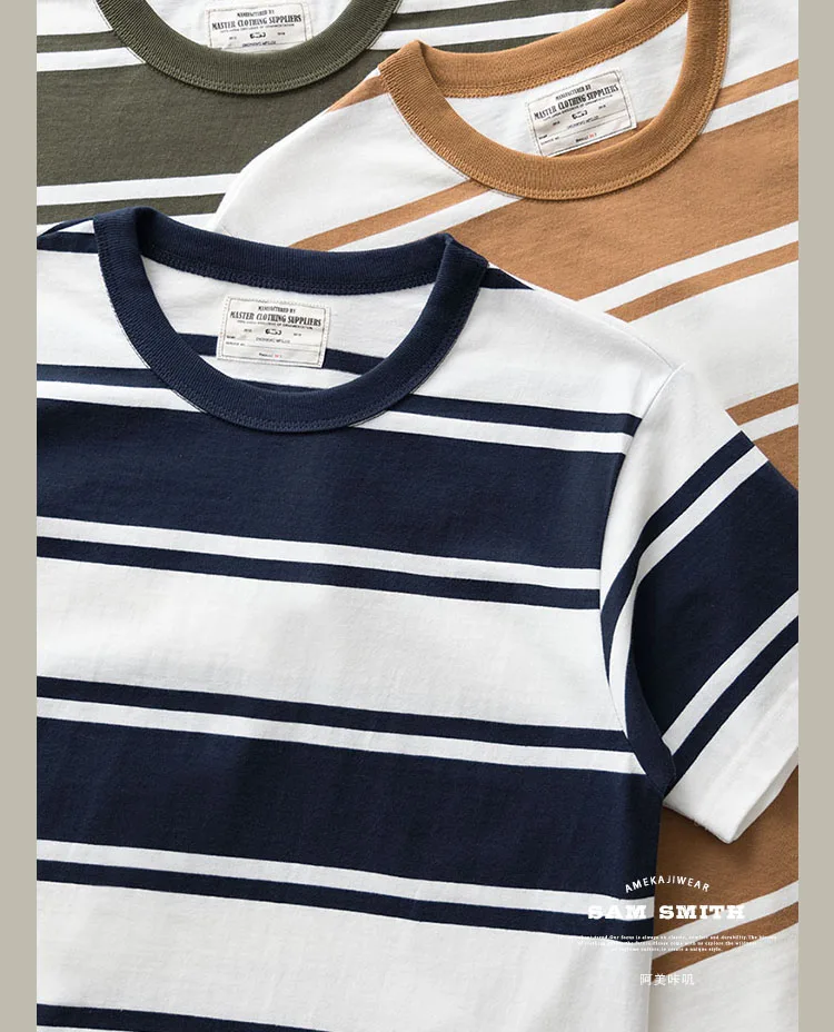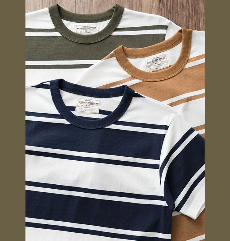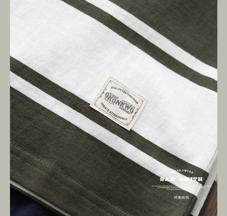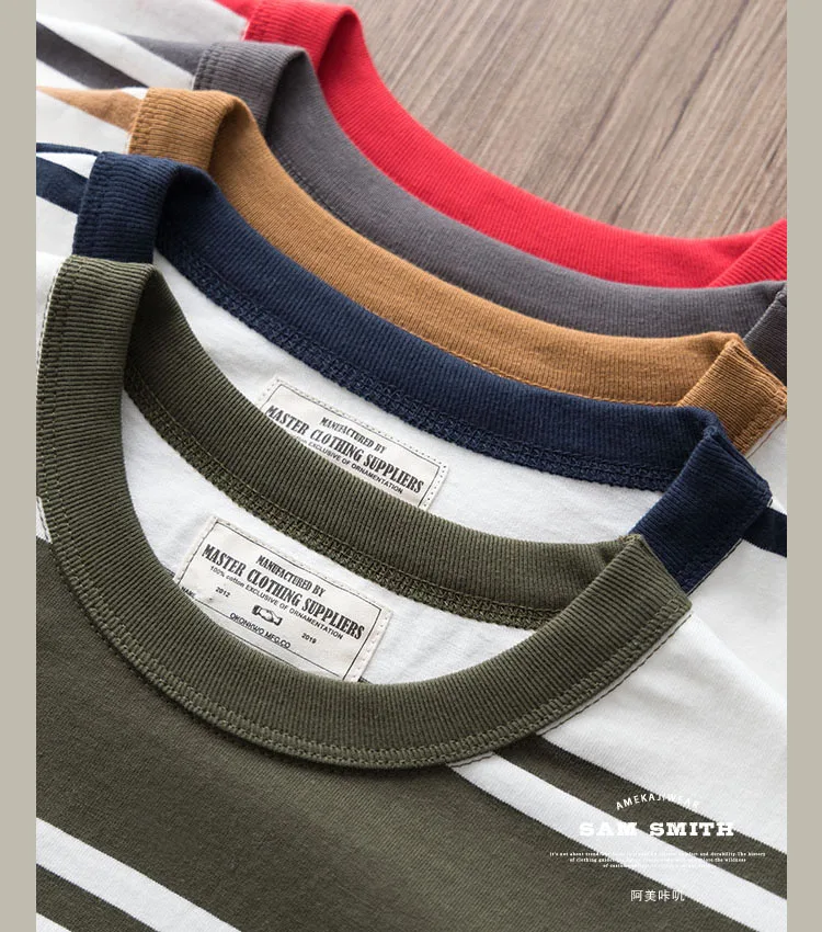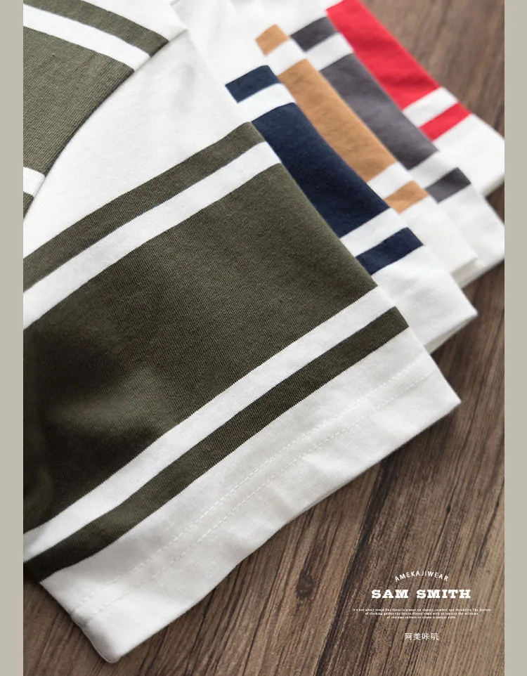 Wiaofellas - Hipster men's retro Heavy T-shirt Cotton half sleeve crew neck striped short sleeve T-shirt