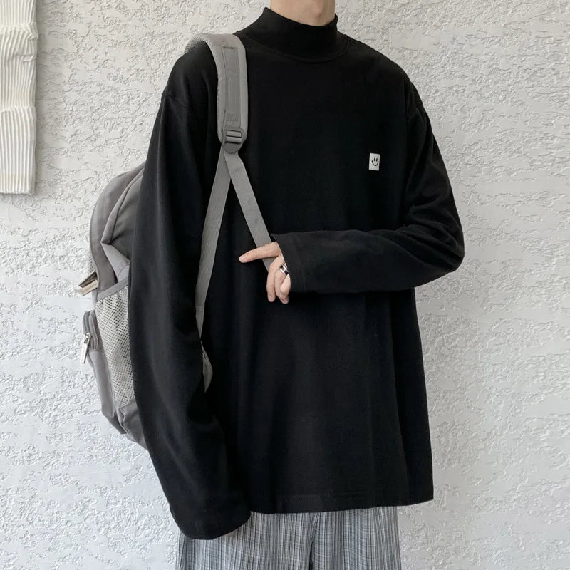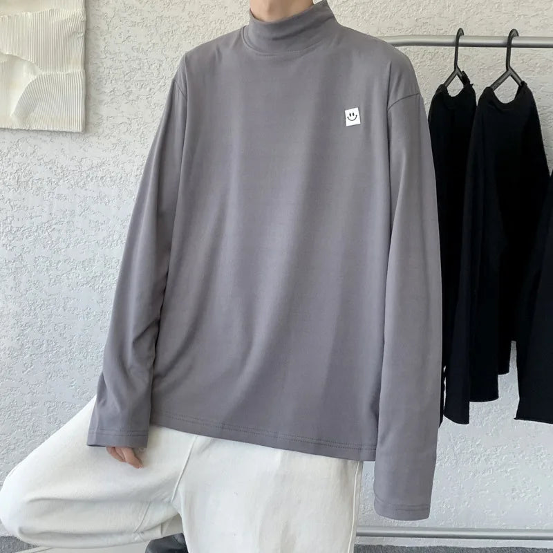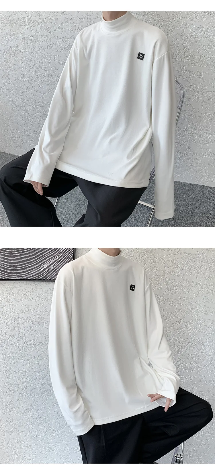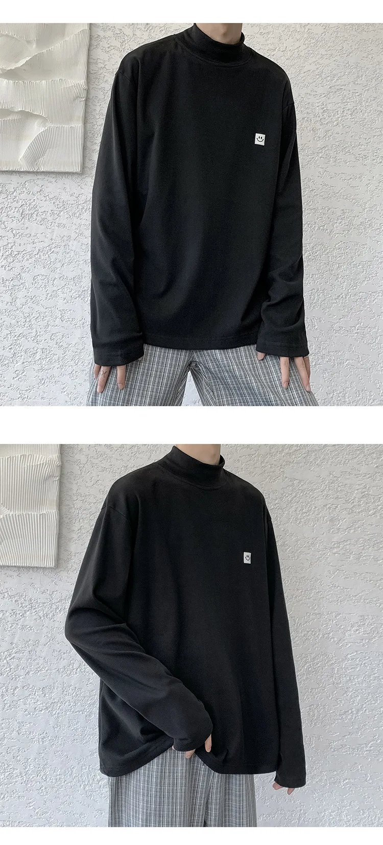 Wiaofellas - Autumn and Winter Solid Color T-shirt High Neck Long-sleeved T-shirt Men's T-shirt Loose T-shirt