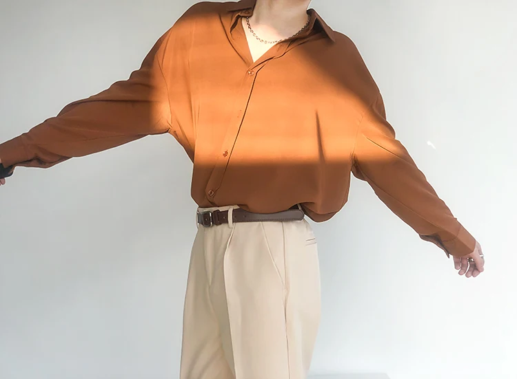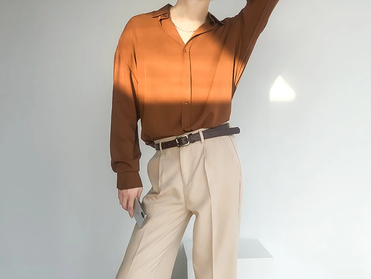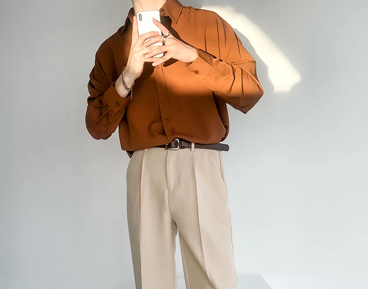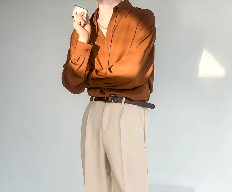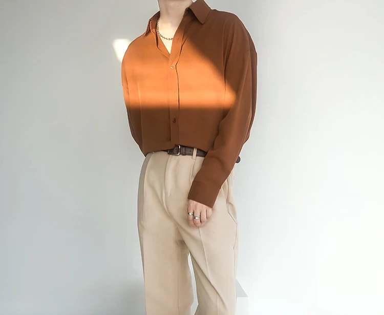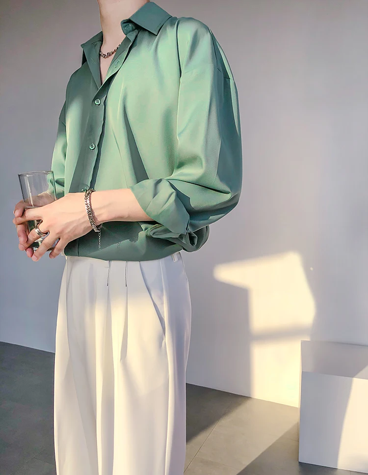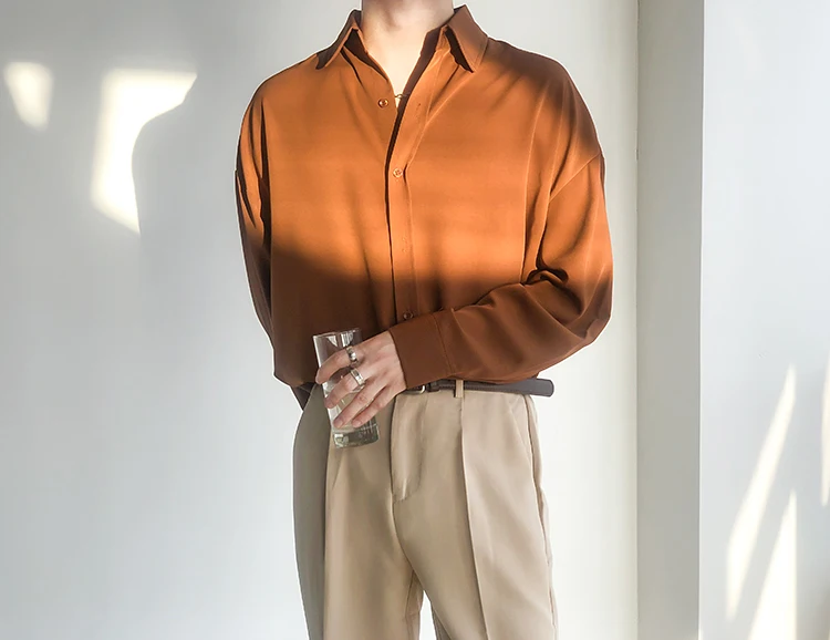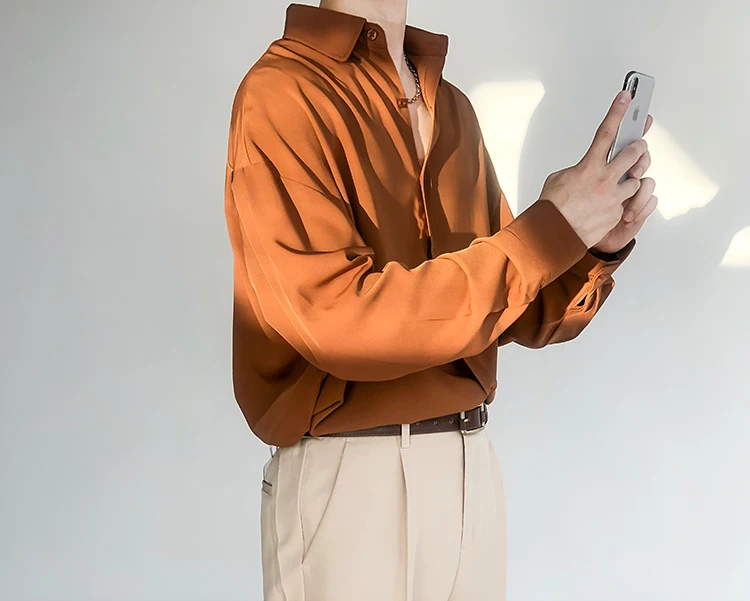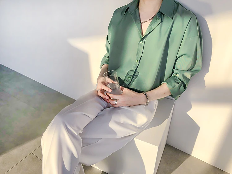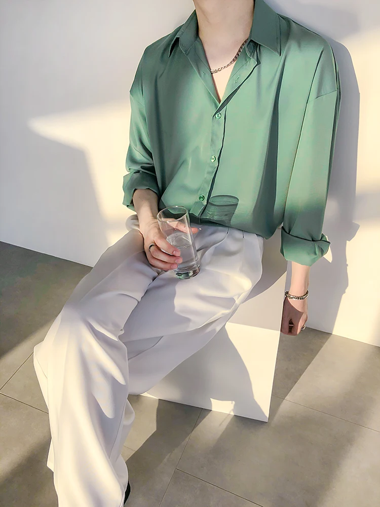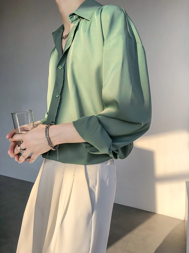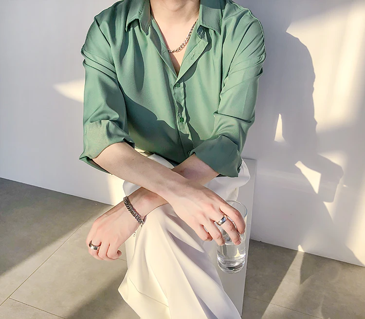 Wiaofellas  -  Men Anti Wrinkle Handsome Luxury Ice Silk Top Blouse Coffee Green Solid Plain Quality Ins England Vintage Long Sleeve Boy ShirtsProduct Information