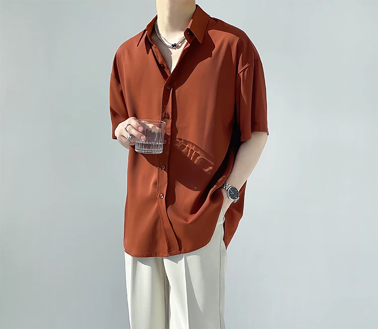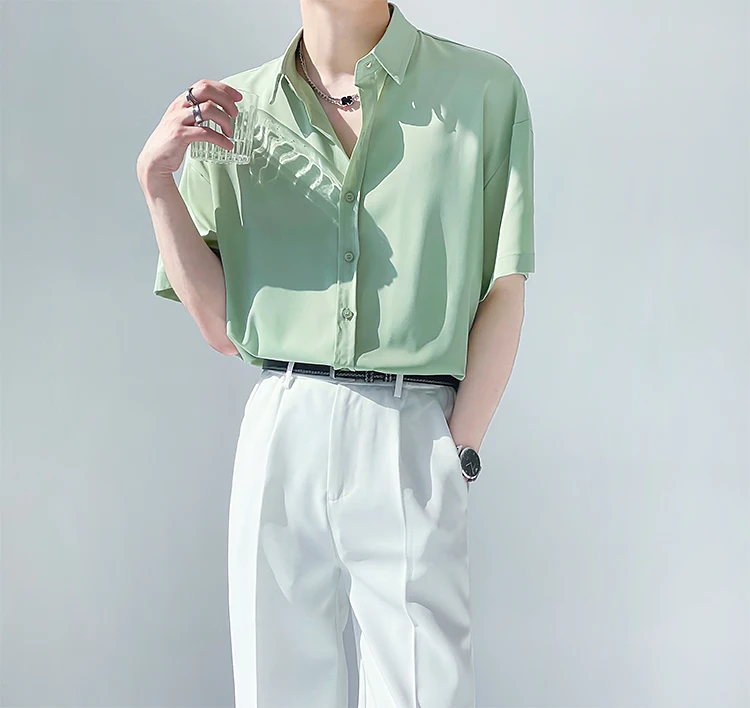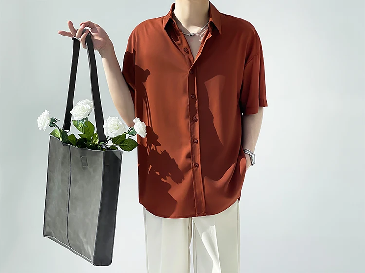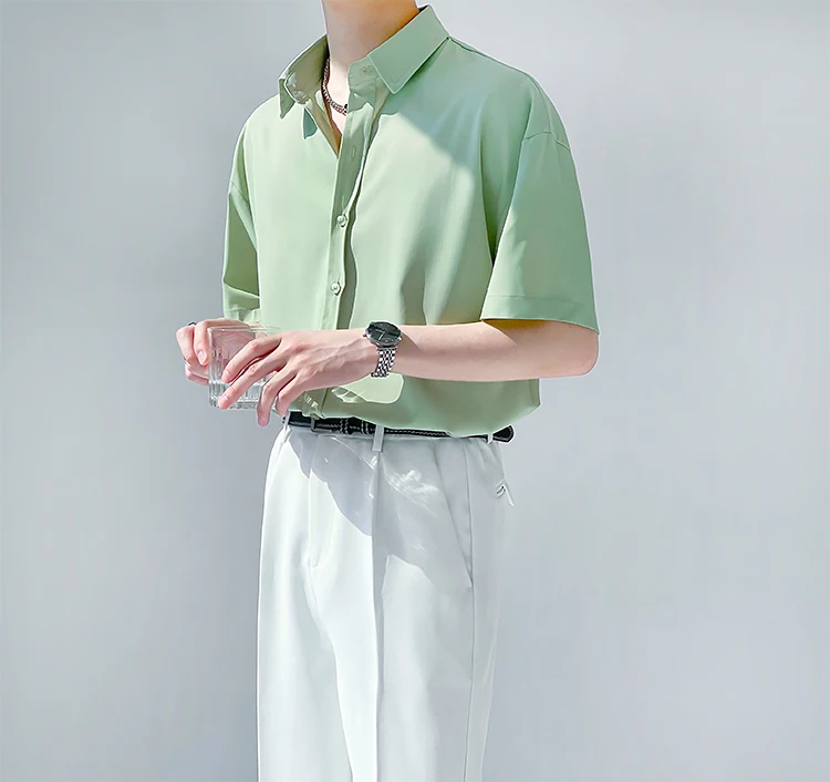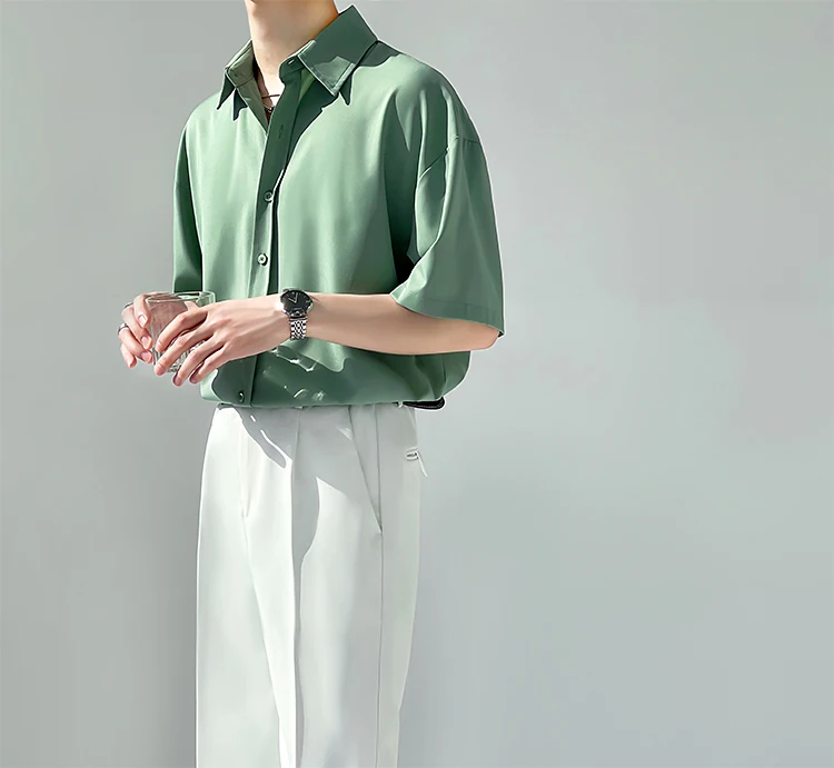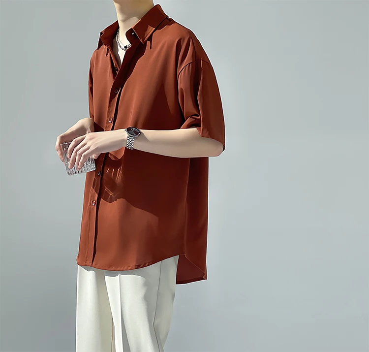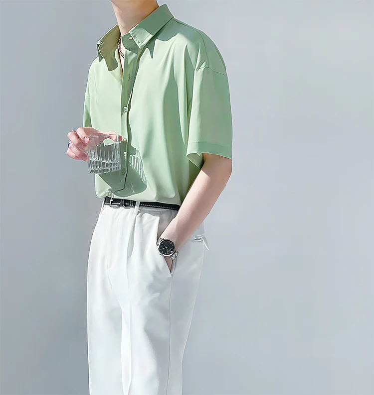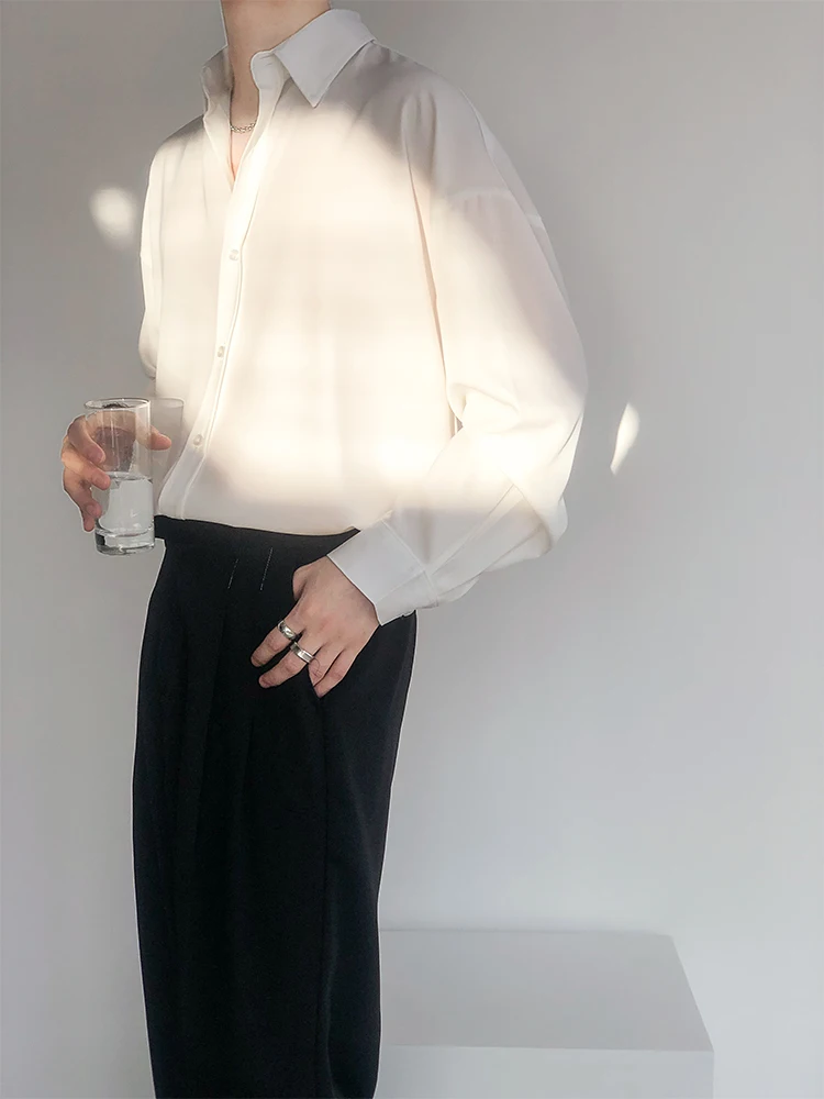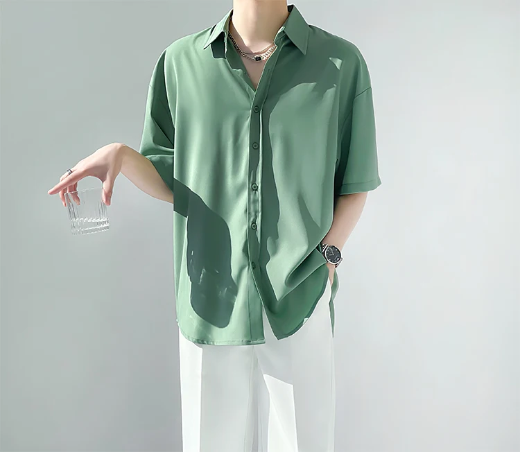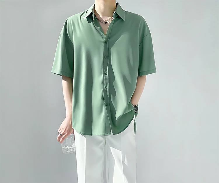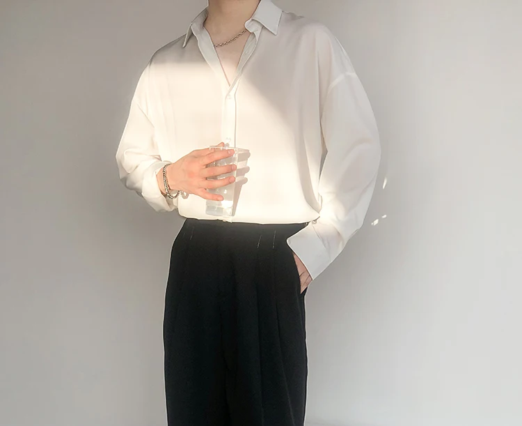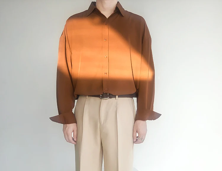 Wiaofellas  -  Men Anti Wrinkle Handsome Luxury Ice Silk Top Blouse Coffee Green Solid Plain Quality Ins England Vintage Long Sleeve Boy ShirtsProduct Information