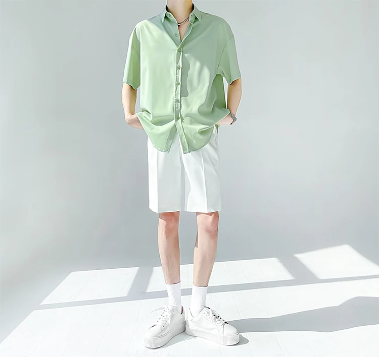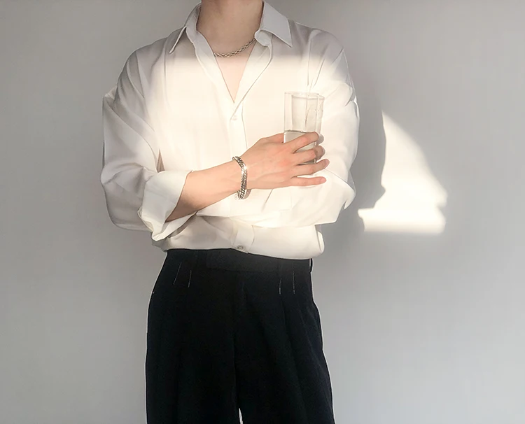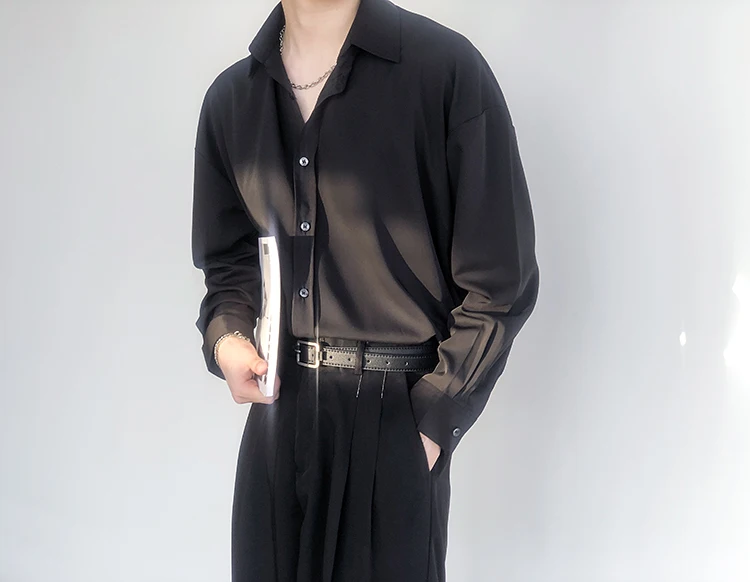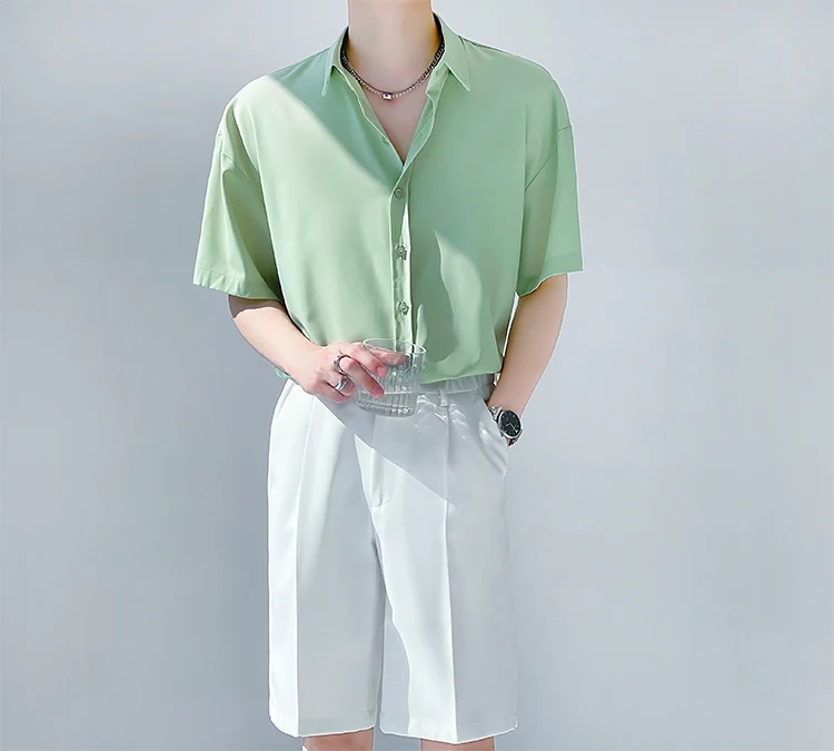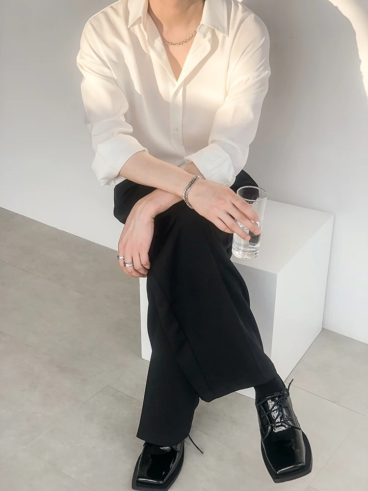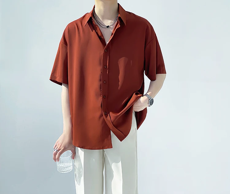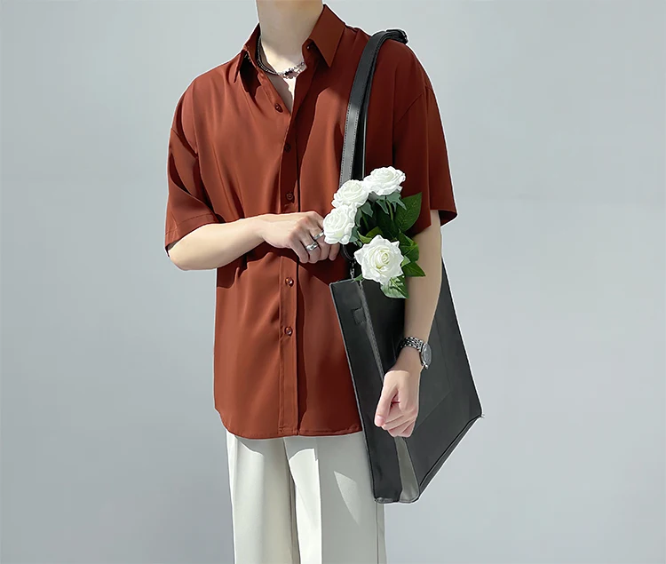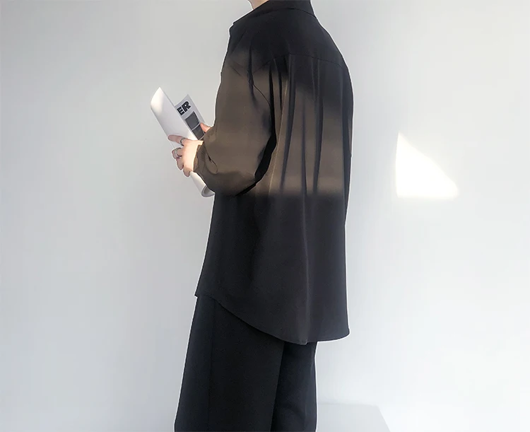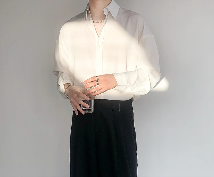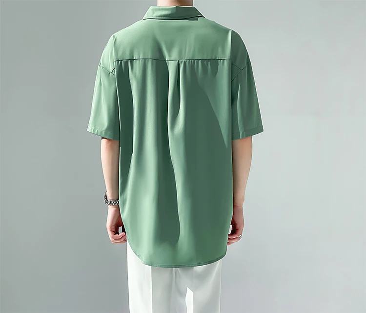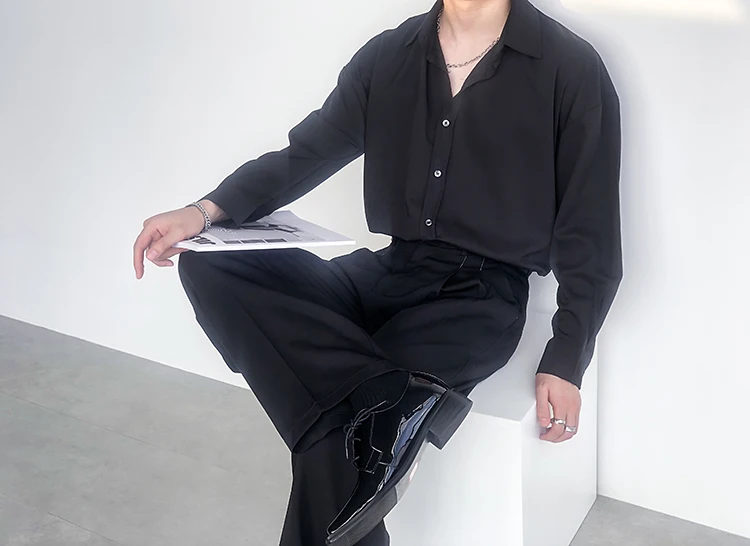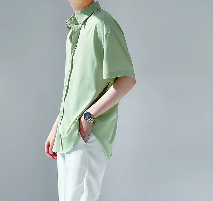 Wiaofellas  -  Men Anti Wrinkle Handsome Luxury Ice Silk Top Blouse Coffee Green Solid Plain Quality Ins England Vintage Long Sleeve Boy ShirtsProduct Information