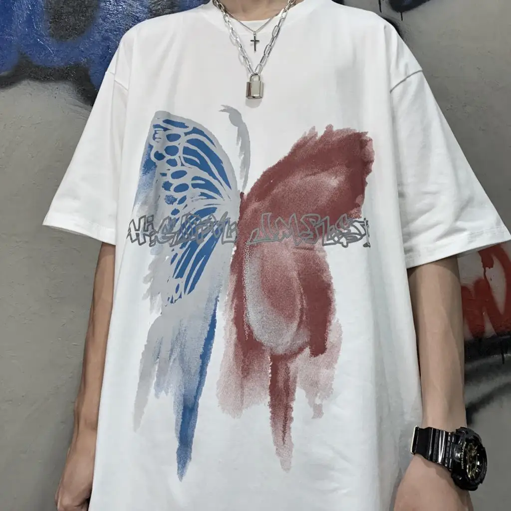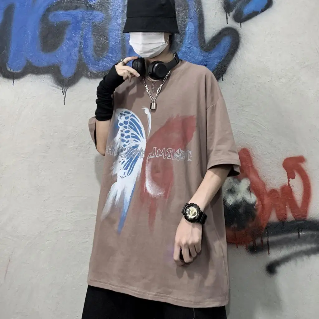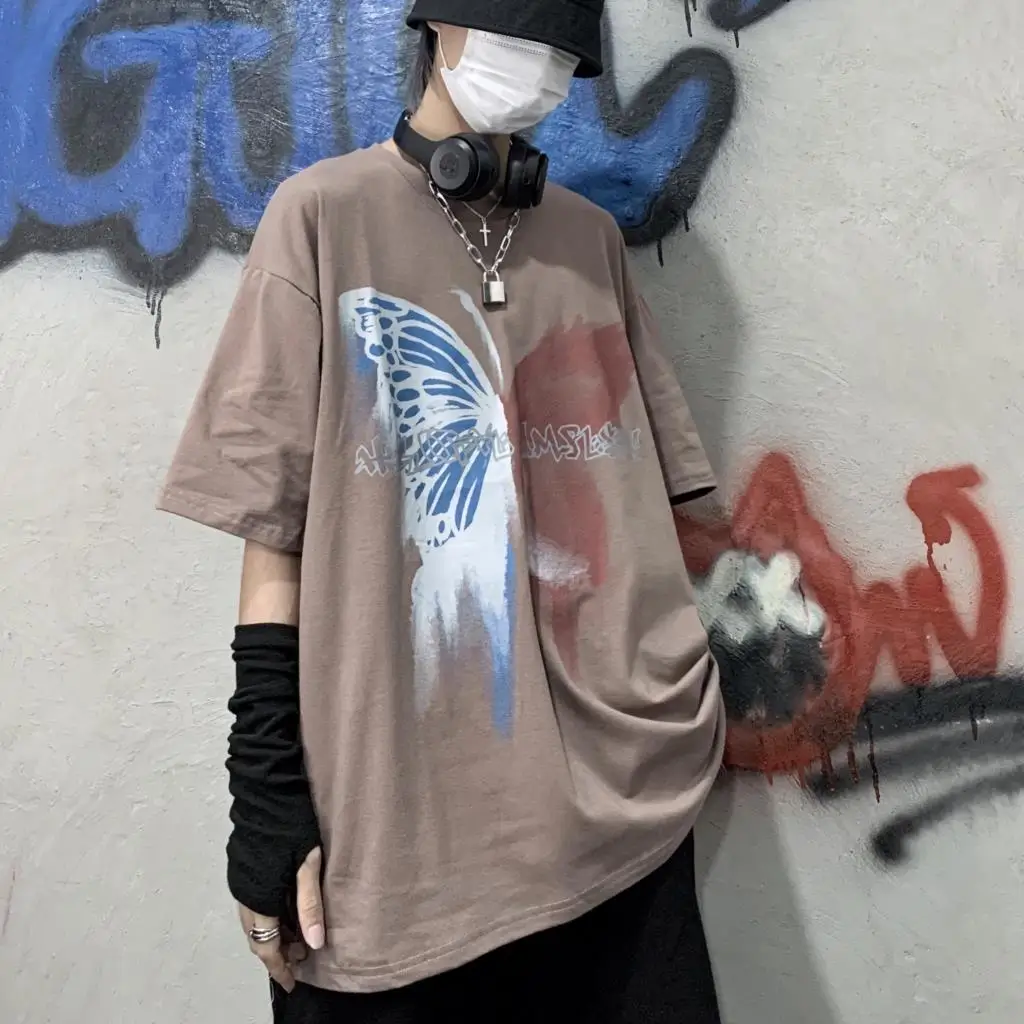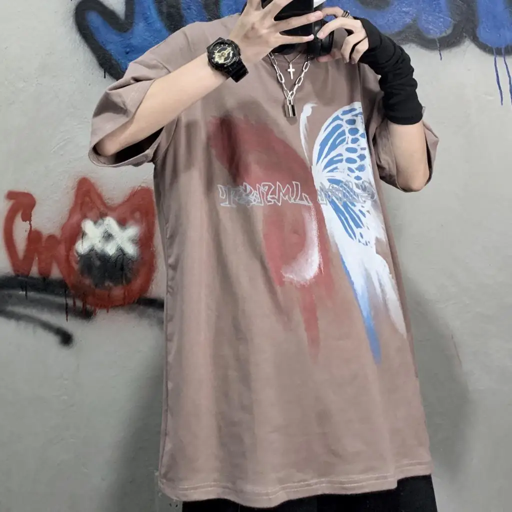 Wiaofellas  -  Men Boy Graffiti Butterfly Letters Print Shirt Loose Long Blouse Short Sleeve Summer Ins Korea Hip Hop Tops Lovers Streetwear