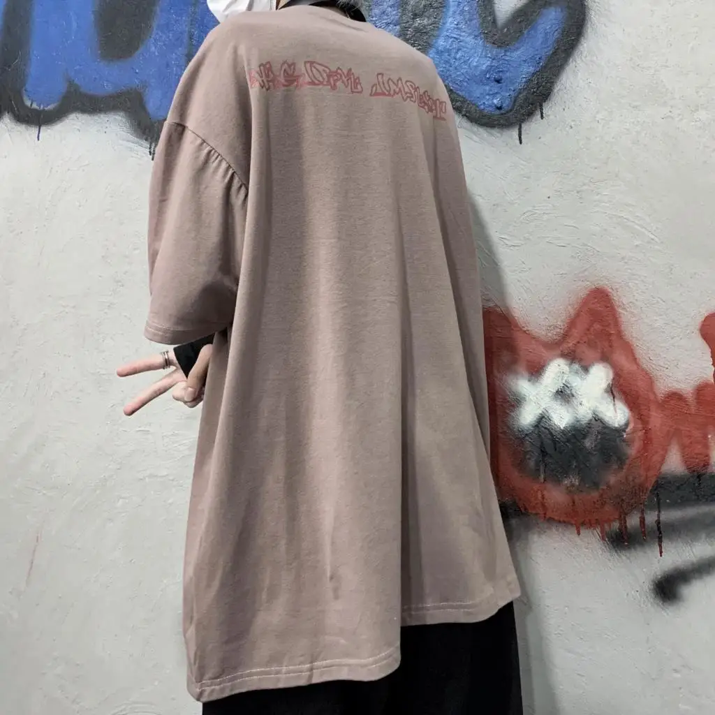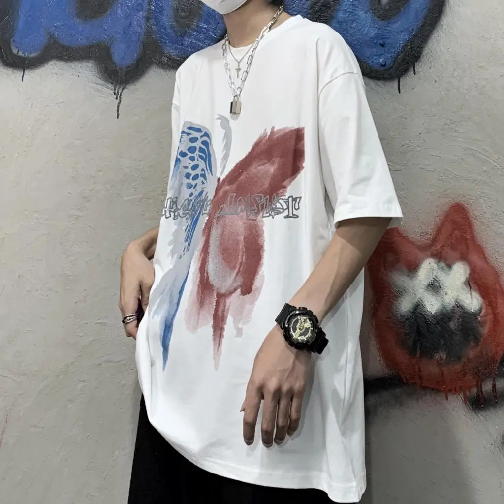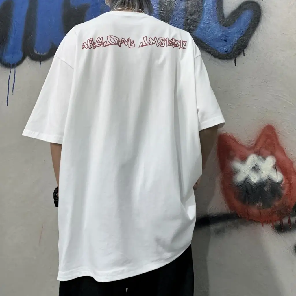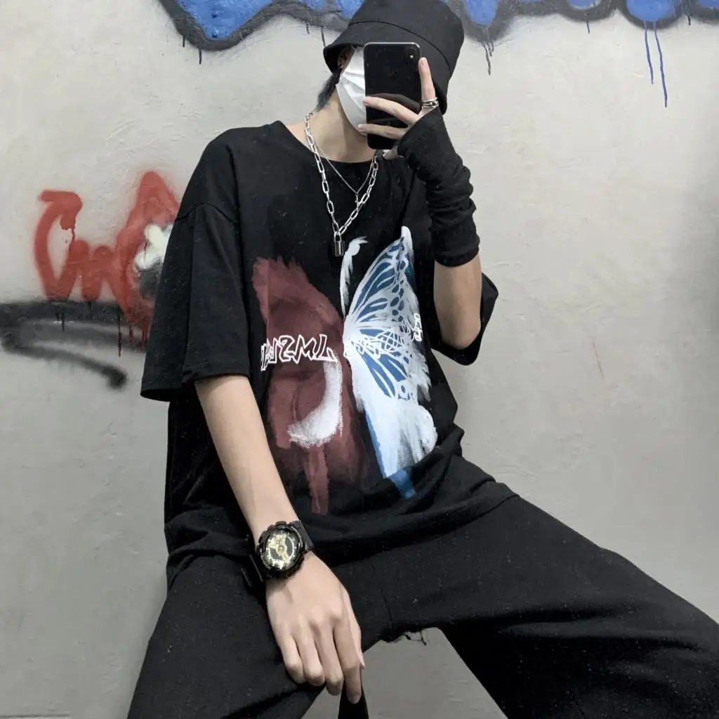Wiaofellas  -  Men Boy Graffiti Butterfly Letters Print Shirt Loose Long Blouse Short Sleeve Summer Ins Korea Hip Hop Tops Lovers Streetwear