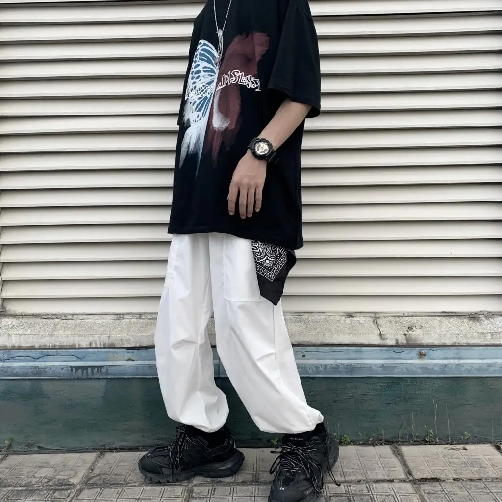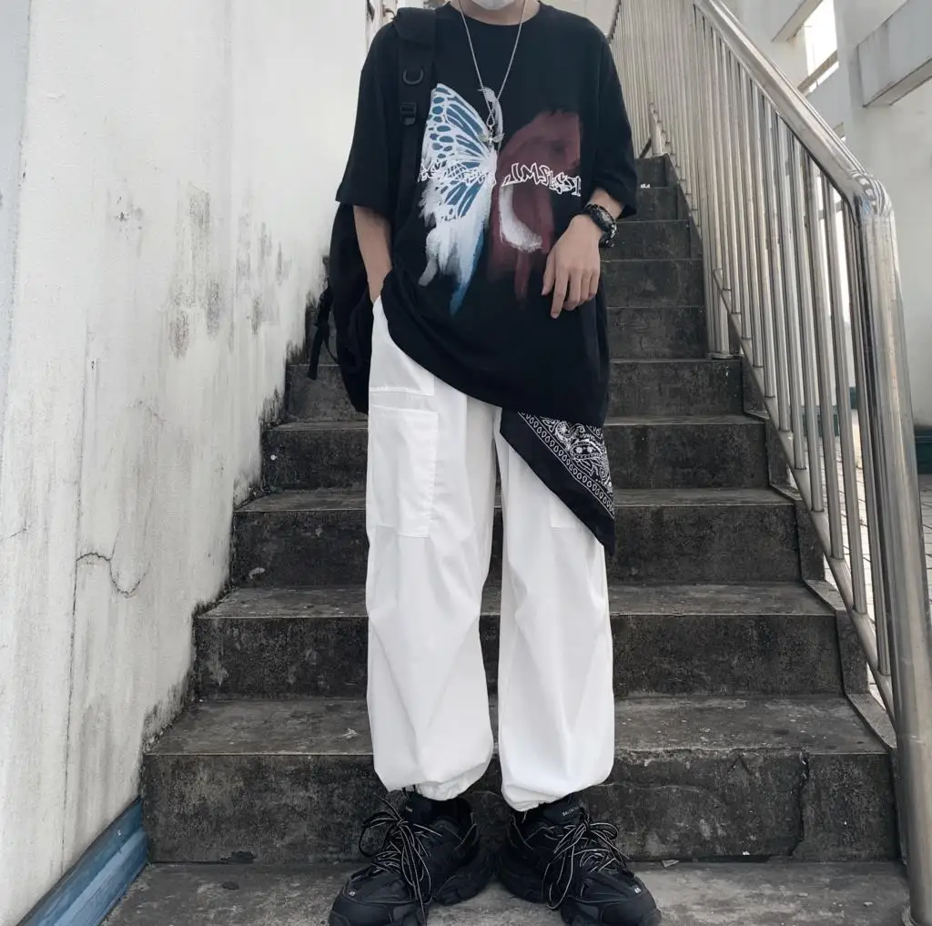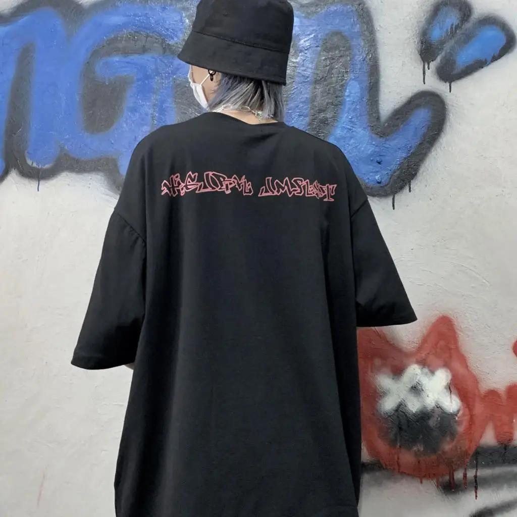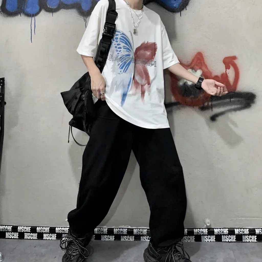 Wiaofellas  -  Men Boy Graffiti Butterfly Letters Print Shirt Loose Long Blouse Short Sleeve Summer Ins Korea Hip Hop Tops Lovers Streetwear