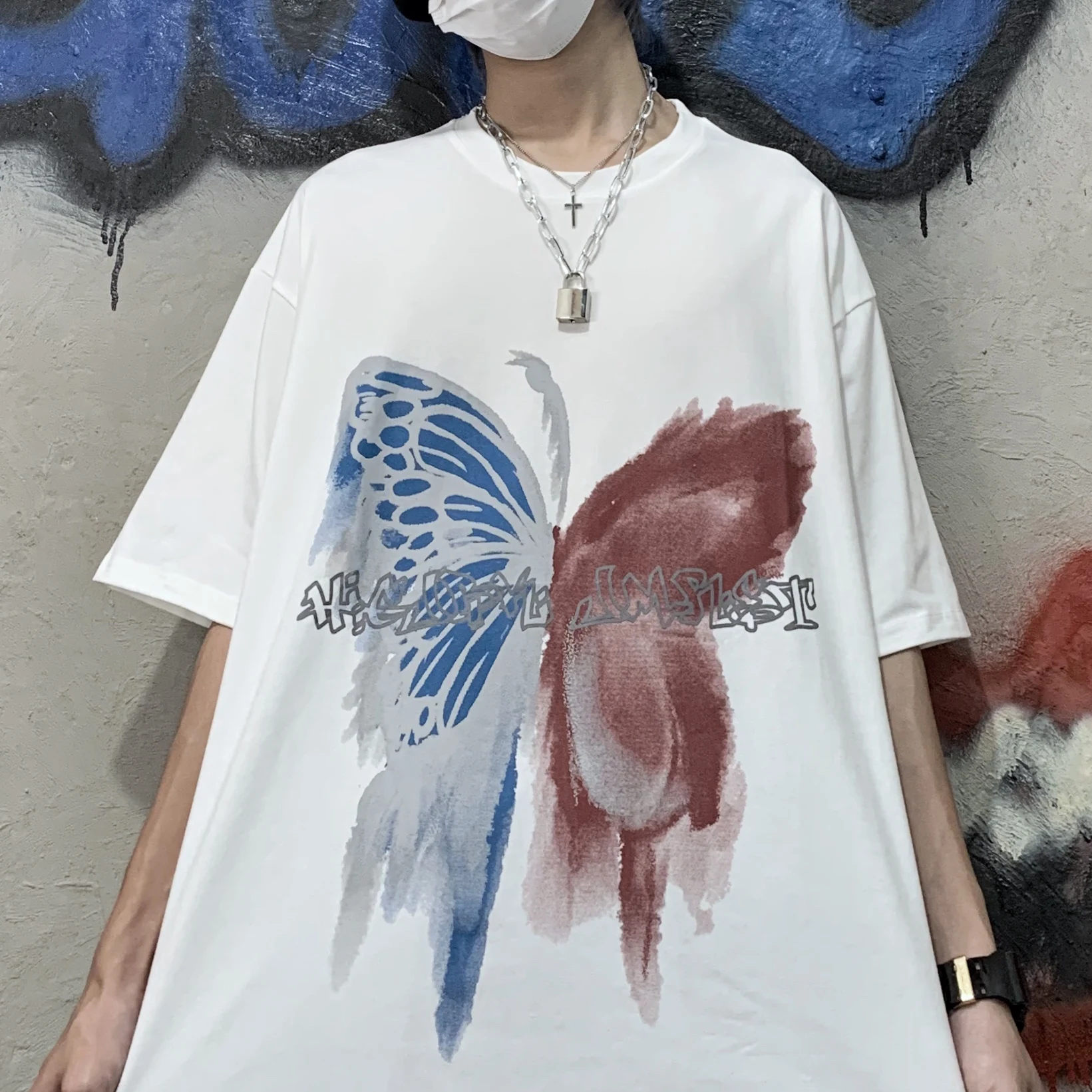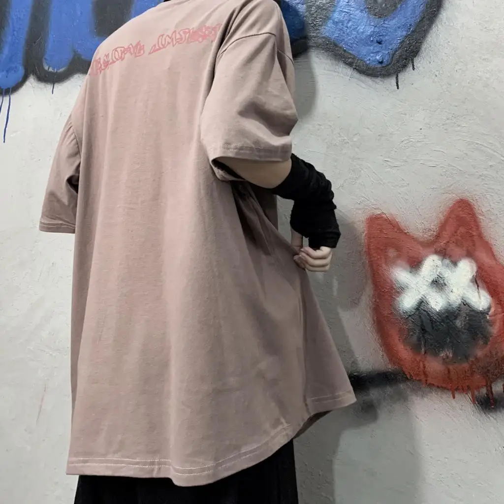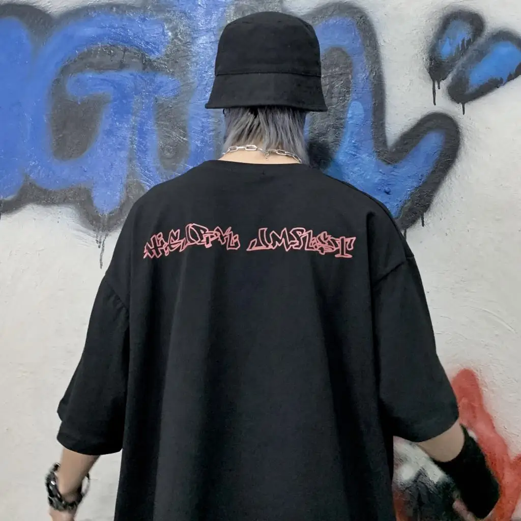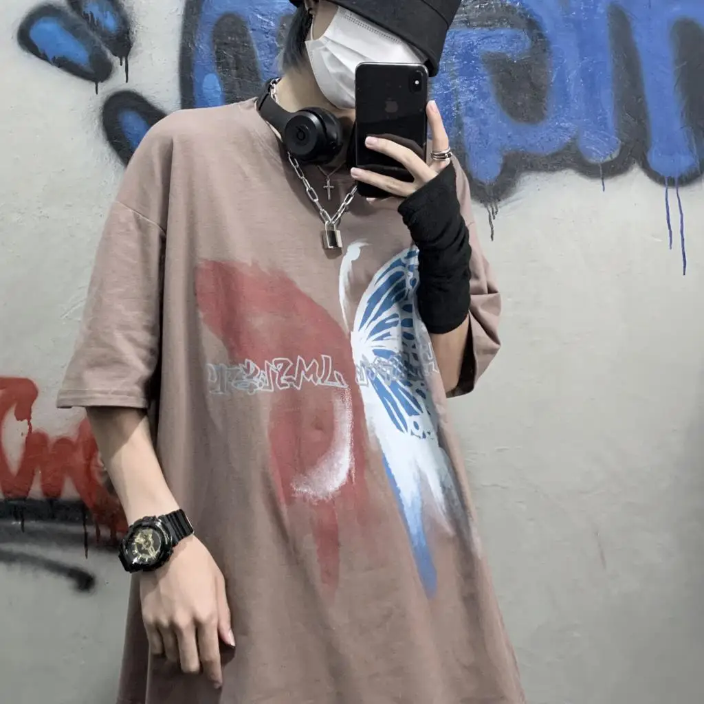 Wiaofellas - Men Boy Graffiti Butterfly Letters Print Shirt Loose Long Blouse Short Sleeve Summer Ins Korea Hip Hop Tops Lovers Streetwear