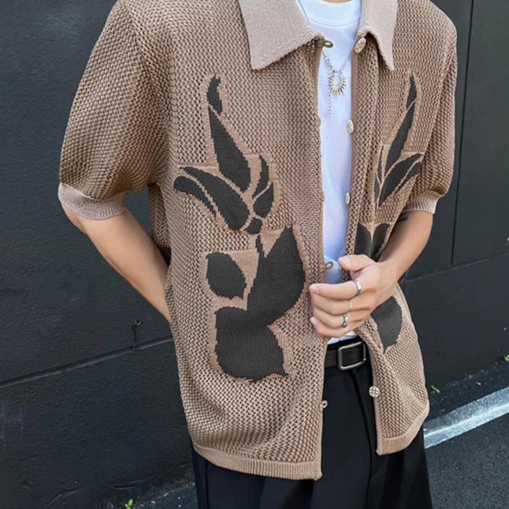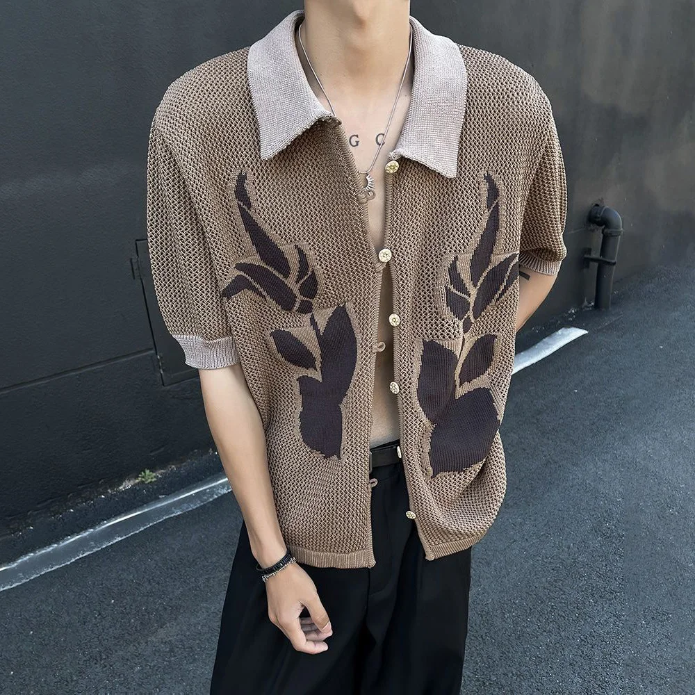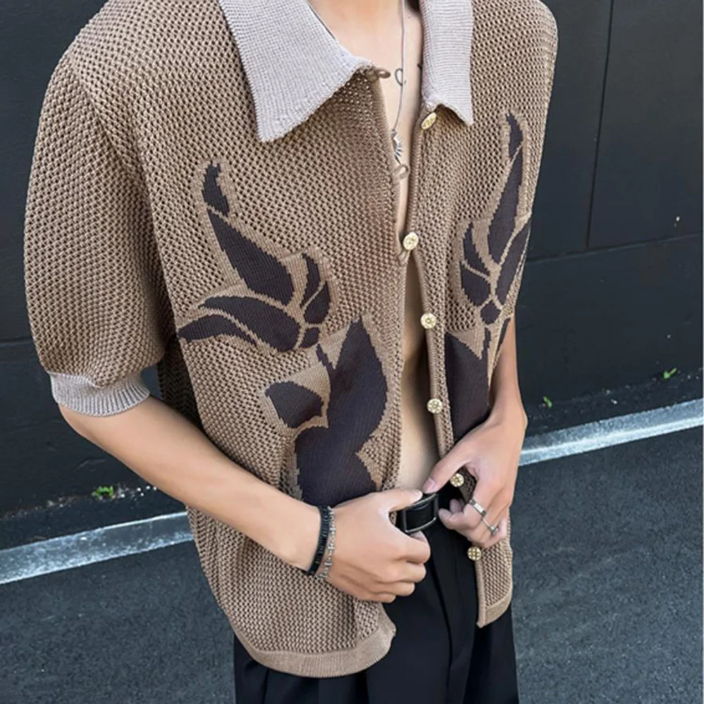 Wiaofellas  -  Mens Hollow Small Mesh Knitted Shirt Casual Daily Breathable Jacquard Lapel Short-Sleeved Top Men'S Clothing Summer New