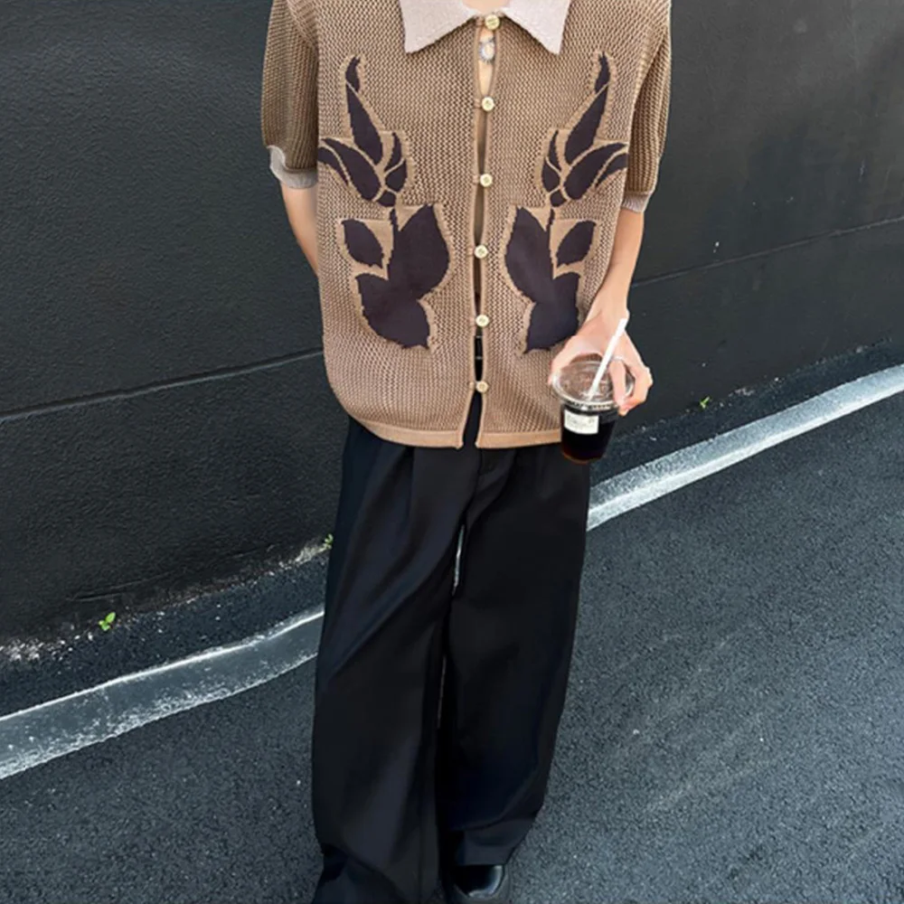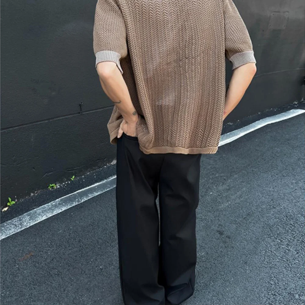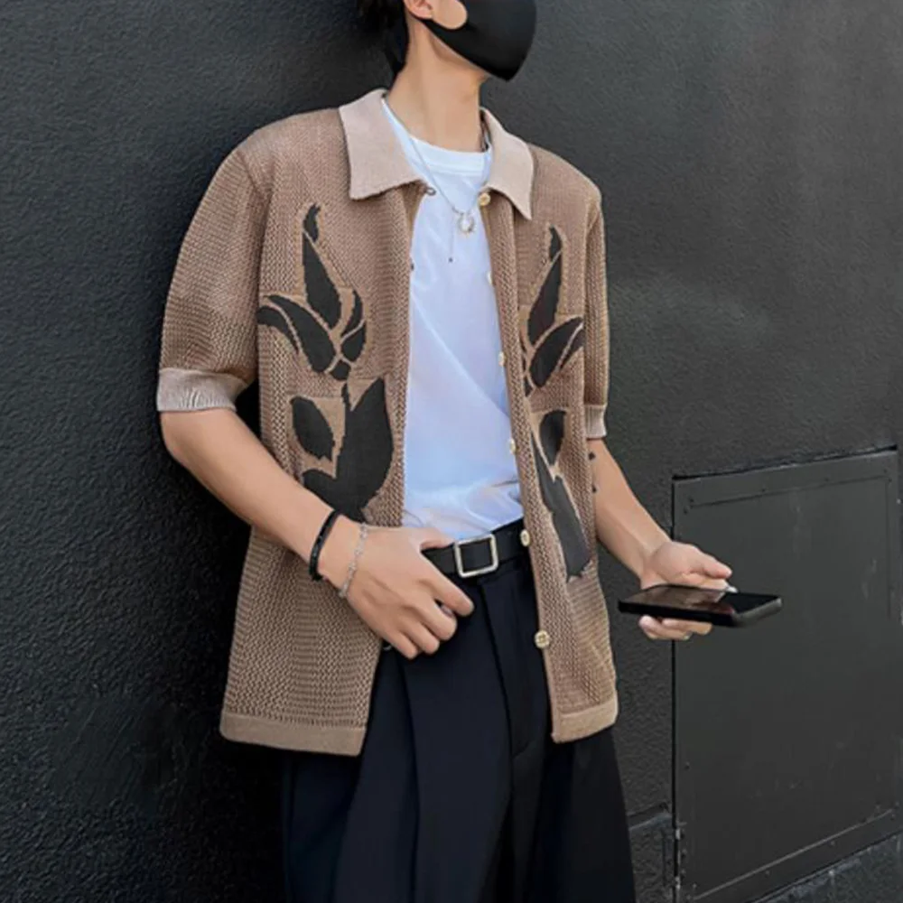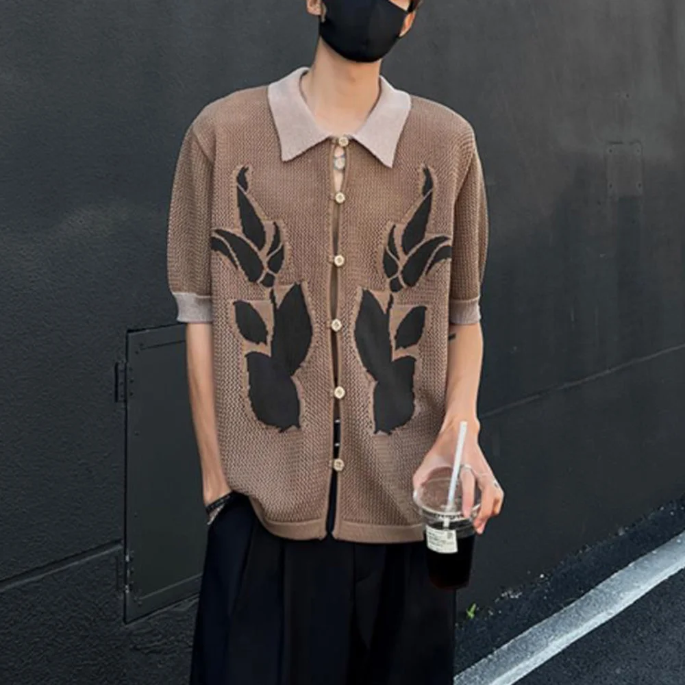 Wiaofellas  -  Mens Hollow Small Mesh Knitted Shirt Casual Daily Breathable Jacquard Lapel Short-Sleeved Top Men'S Clothing Summer New