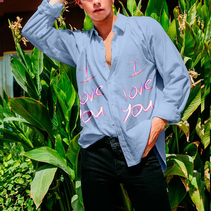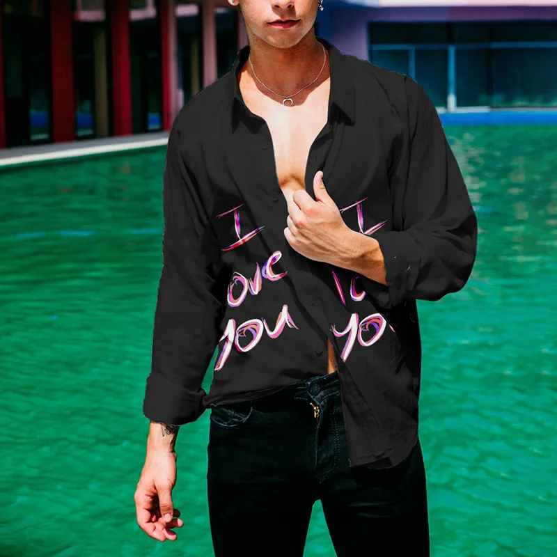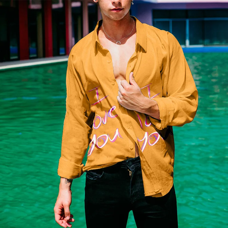 Wiaofellas - New I love you printing Shirt Sexy Thin Clothing Summer Men Long Sleeve Chemise Tops Homme Casual Men Shirt M-3XL Black/Yellow