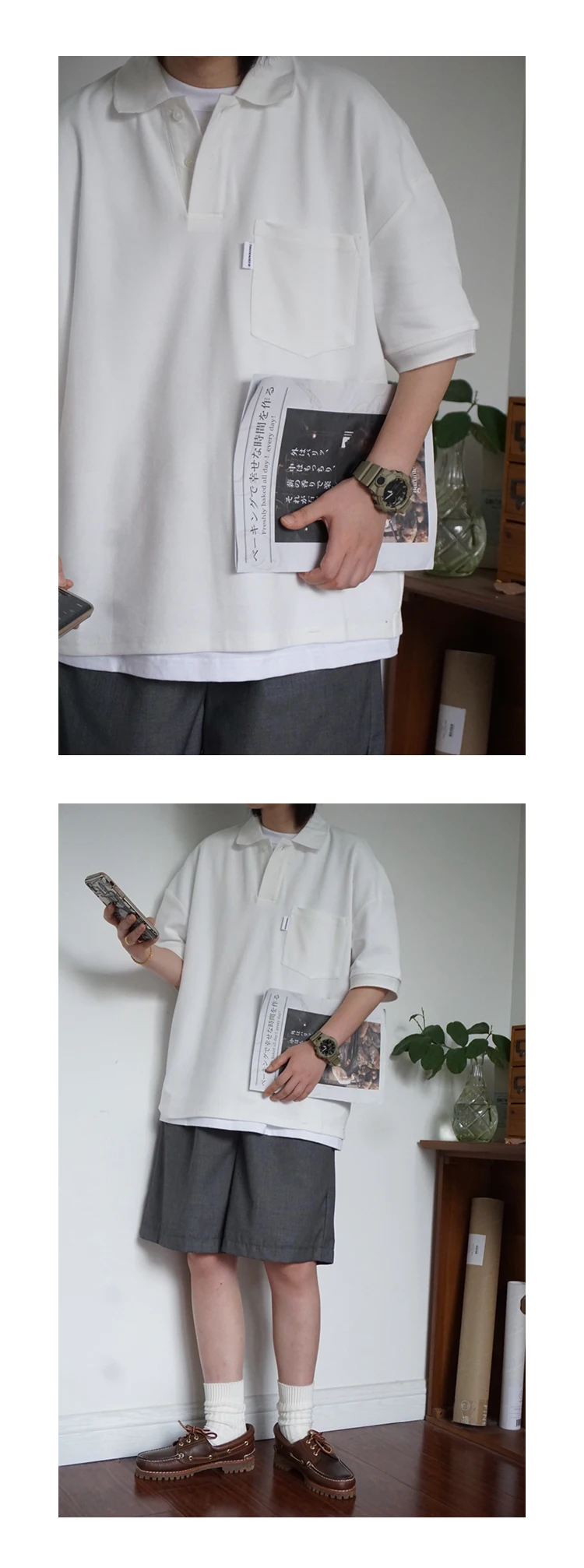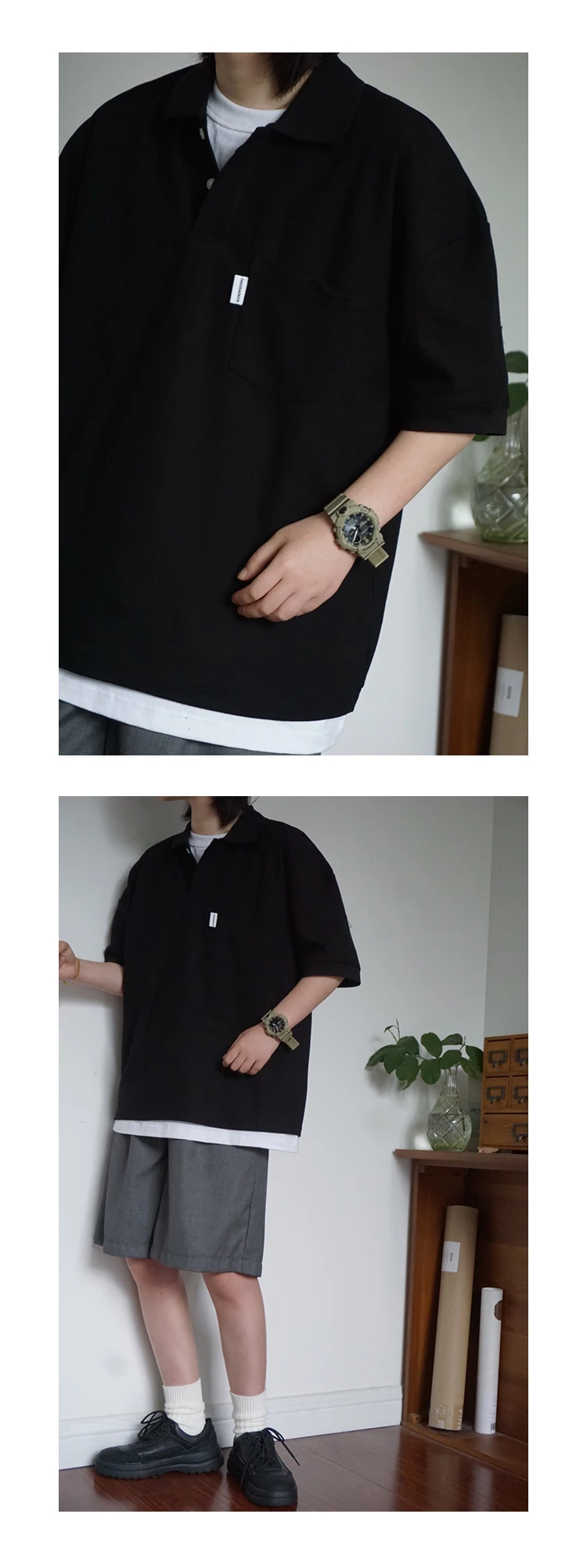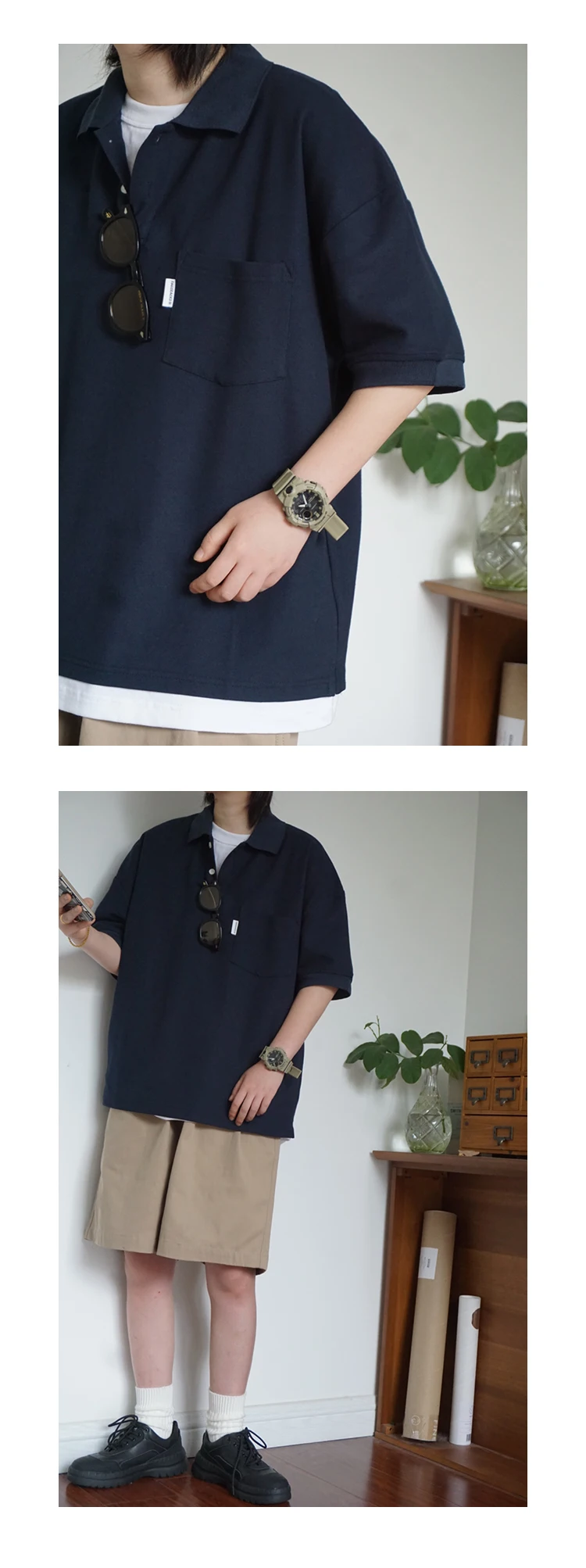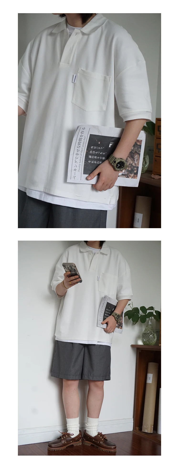 Wiaofellas - Japanese Sle Ciboy Retro Pearl Cotton Men's and Women's Loose Pocket Short sleeve Polo Shirt