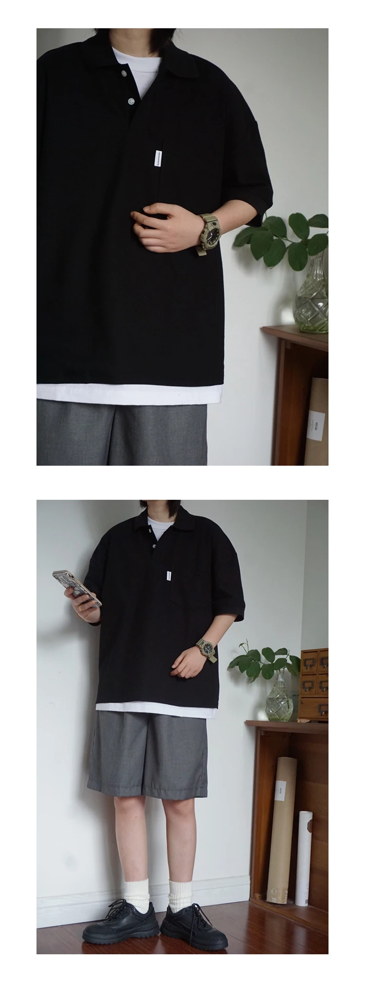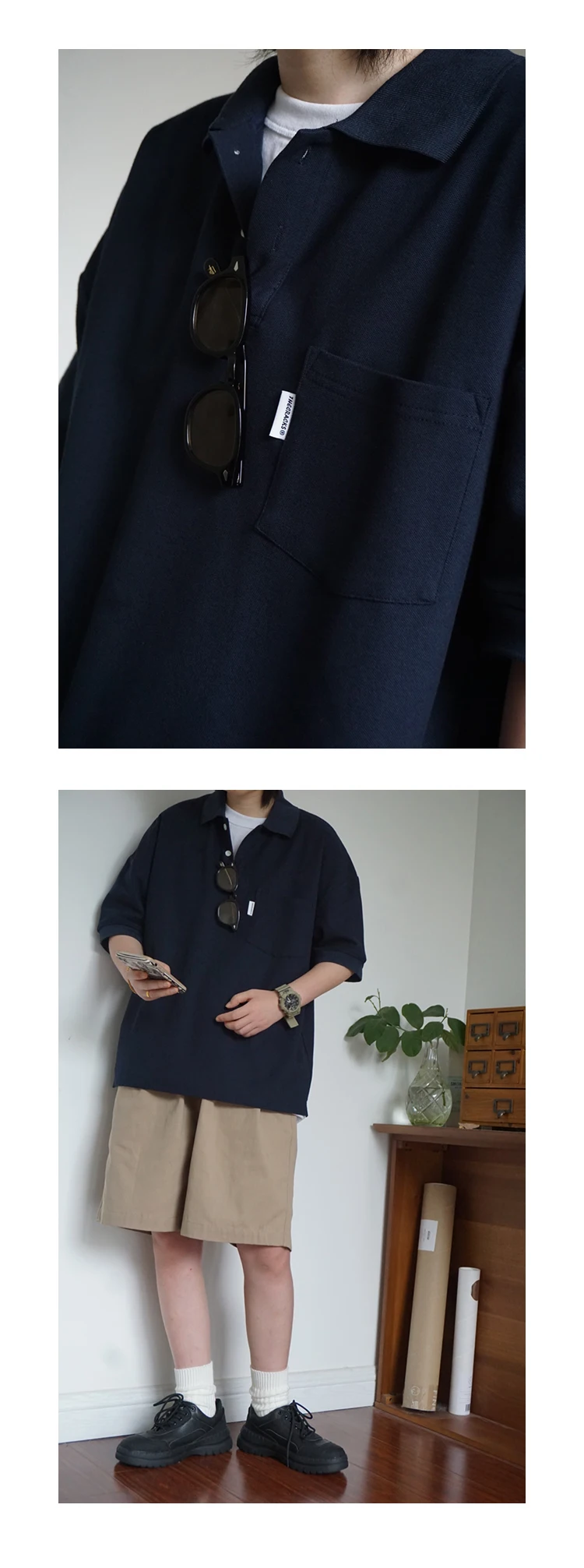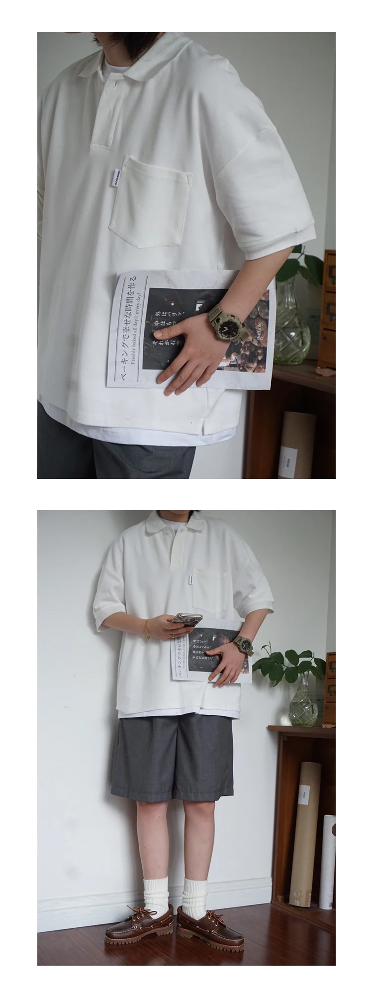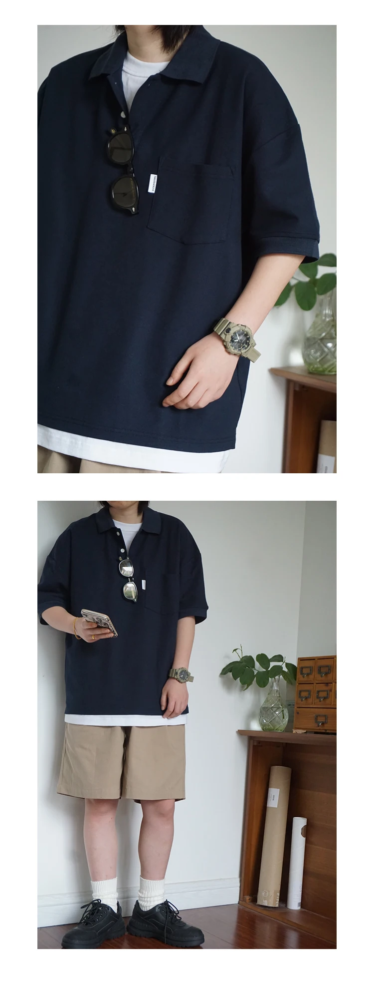 Wiaofellas - Japanese Sle Ciboy Retro Pearl Cotton Men's and Women's Loose Pocket Short sleeve Polo Shirt