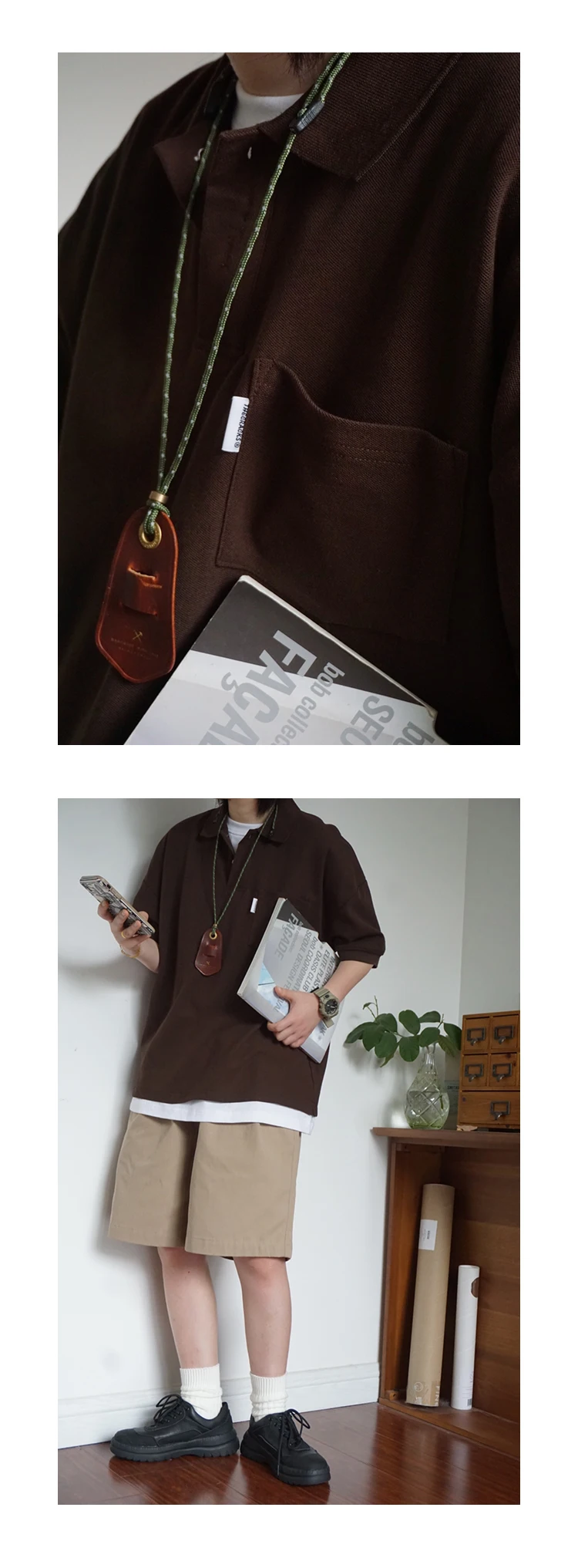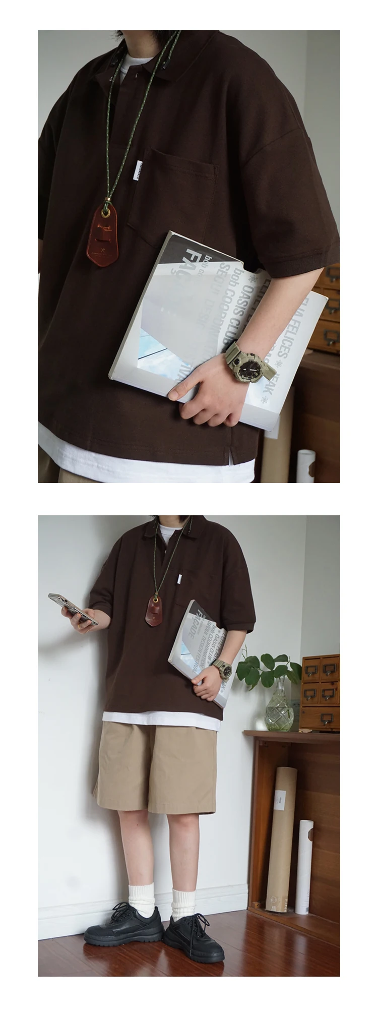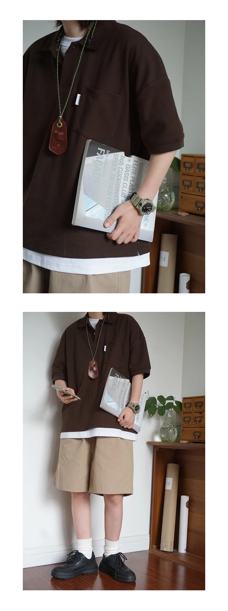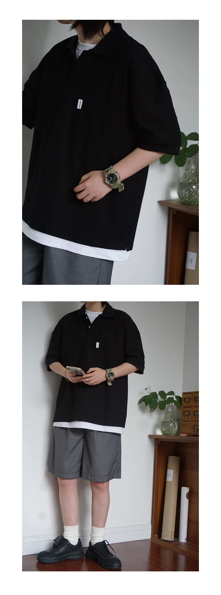 Wiaofellas - Japanese Sle Ciboy Retro Pearl Cotton Men's and Women's Loose Pocket Short sleeve Polo Shirt