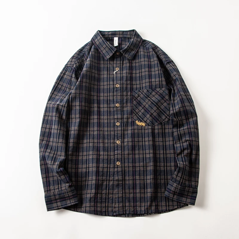 Wiaofellas  -  Spring Autumn Men's Long Sleeve Plaid Shirt Korean Embroidered Casual Washed Cotton Texture Plaid Tooling Shirt Jacket