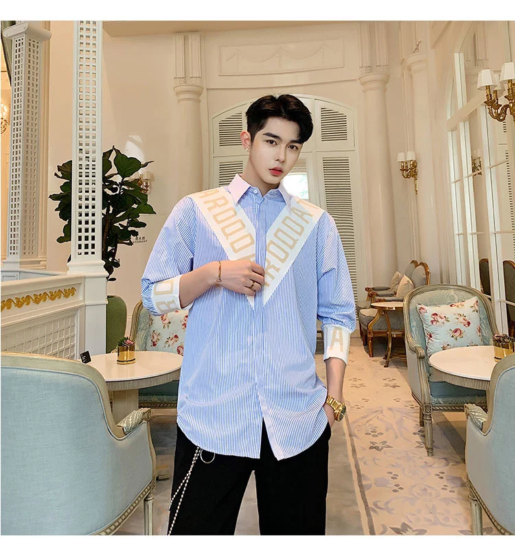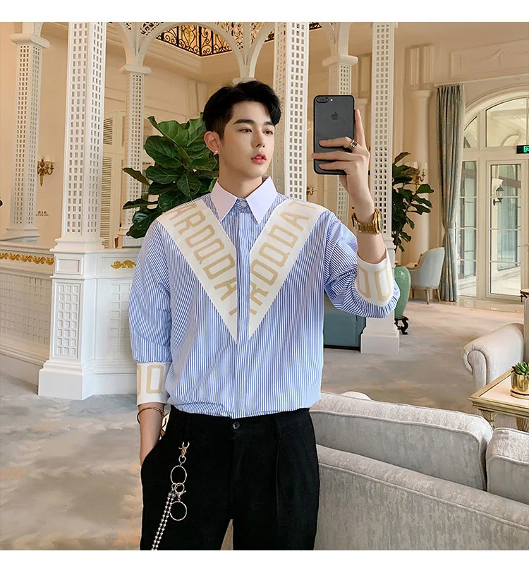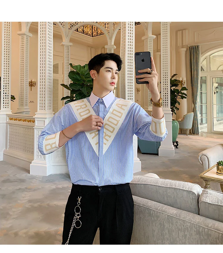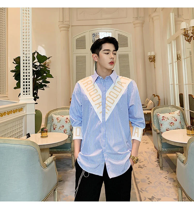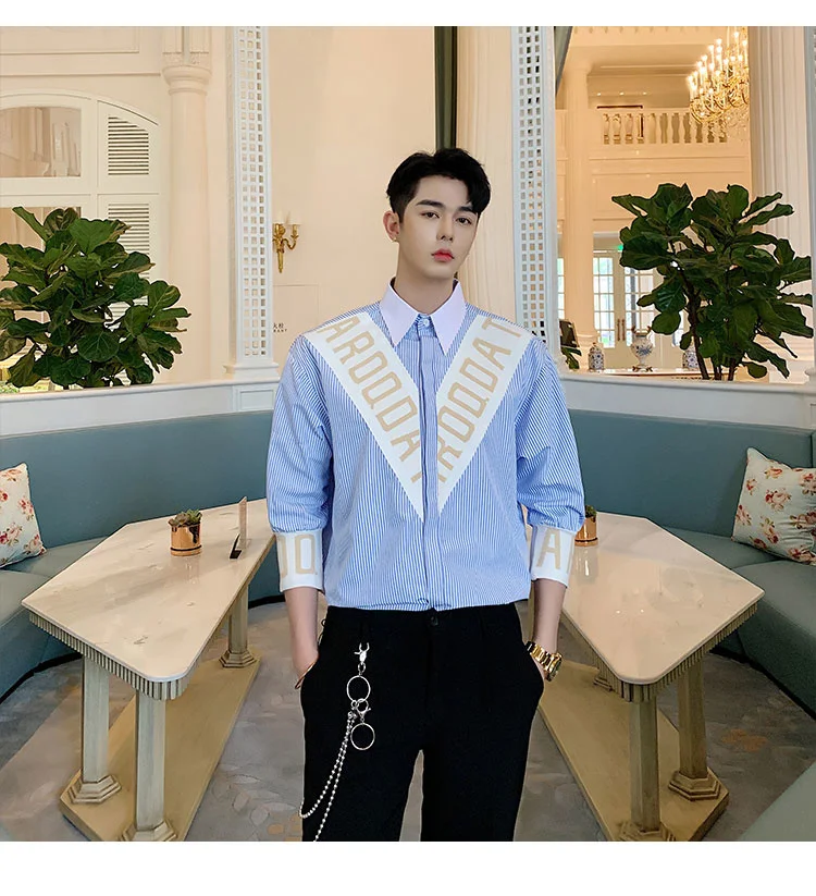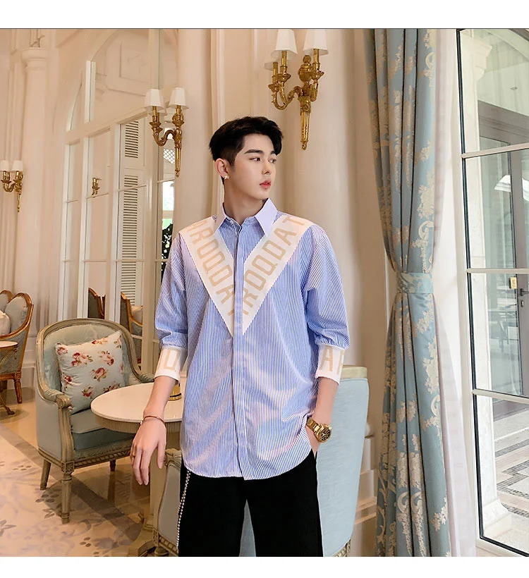 Wiaofellas  -  Striped Personalized Patchwork letter Decoration Men's Casual Three Quarter Shirt Korean Fashionable Tops 2A1298