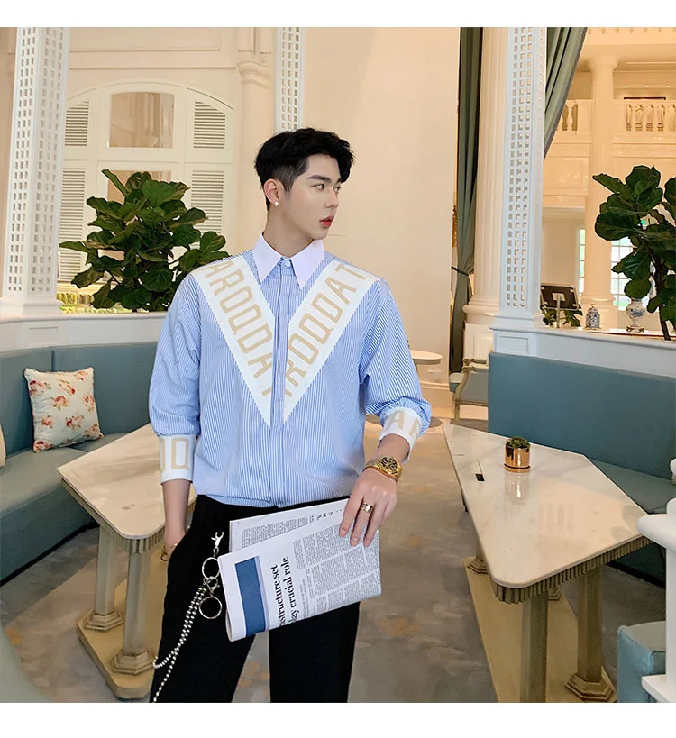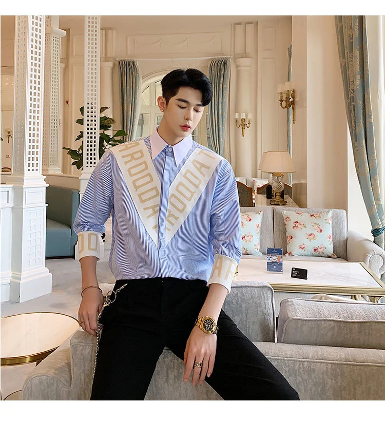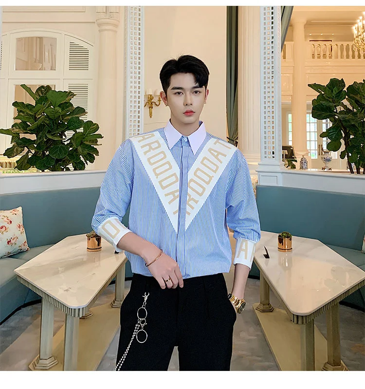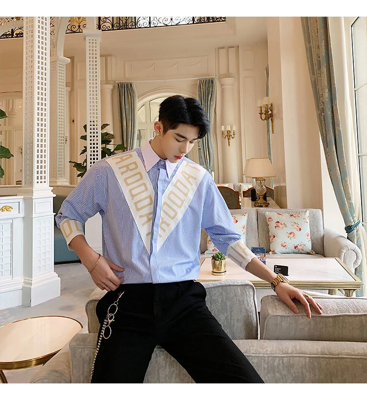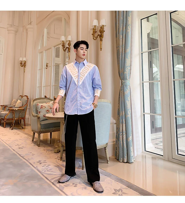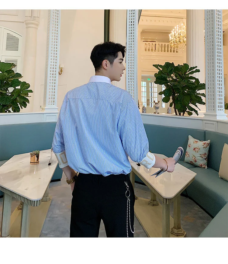 Wiaofellas  -  Striped Personalized Patchwork letter Decoration Men's Casual Three Quarter Shirt Korean Fashionable Tops 2A1298
