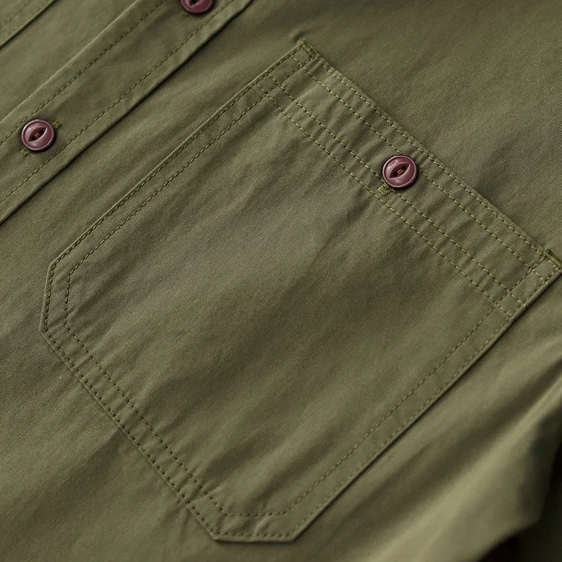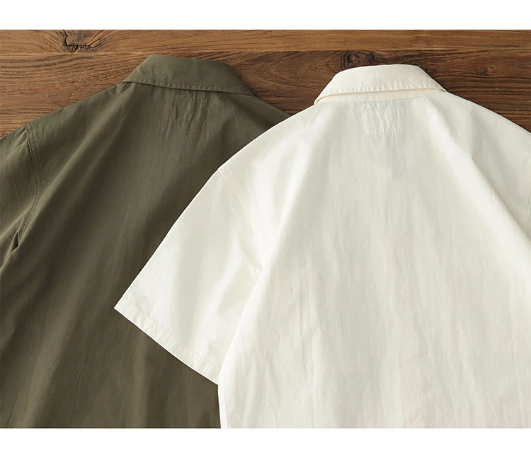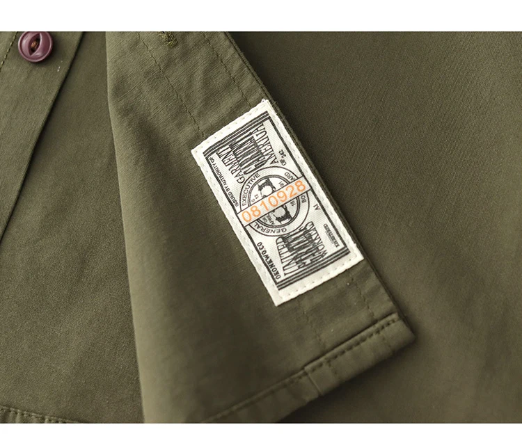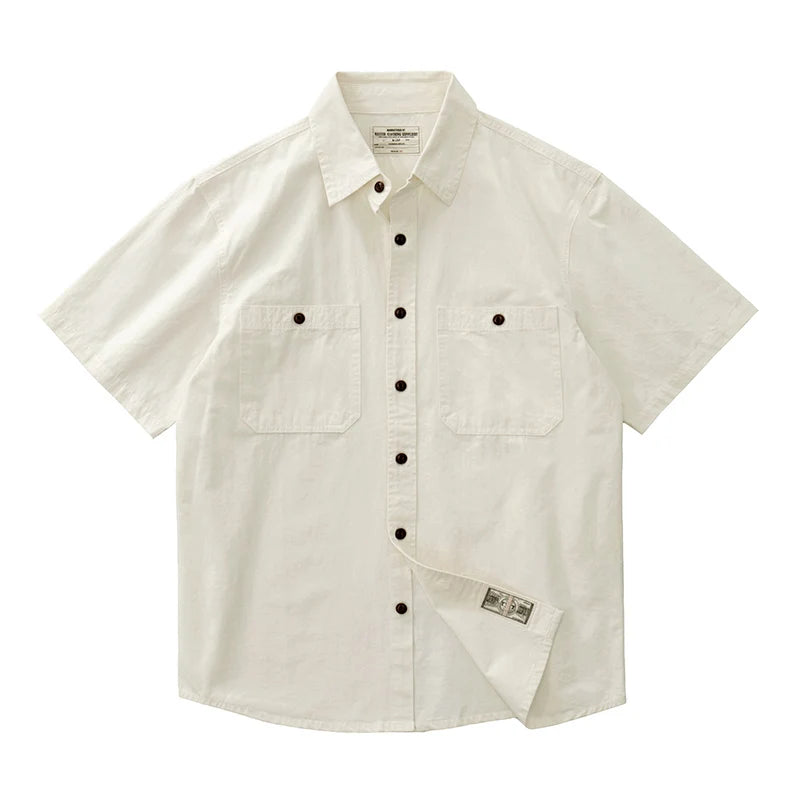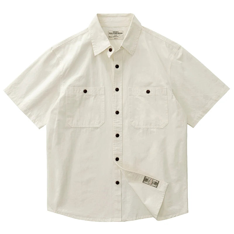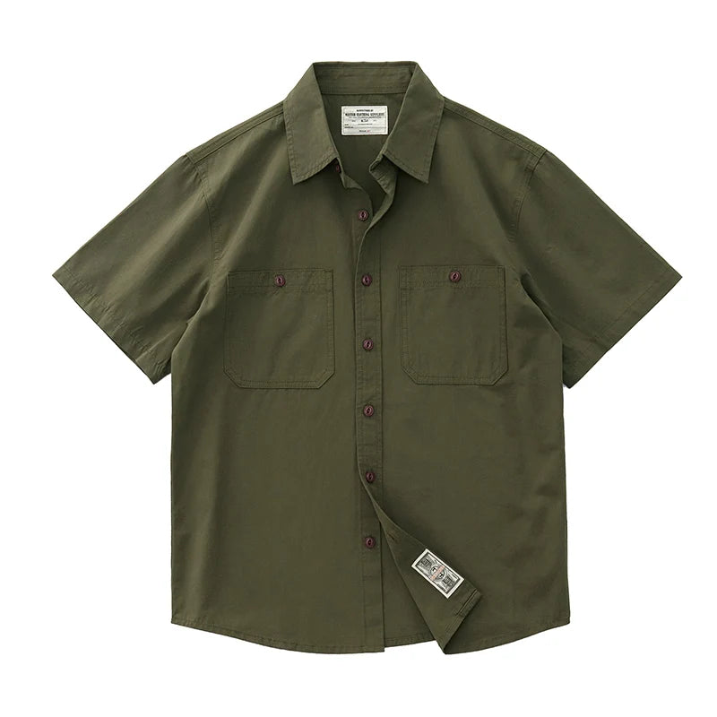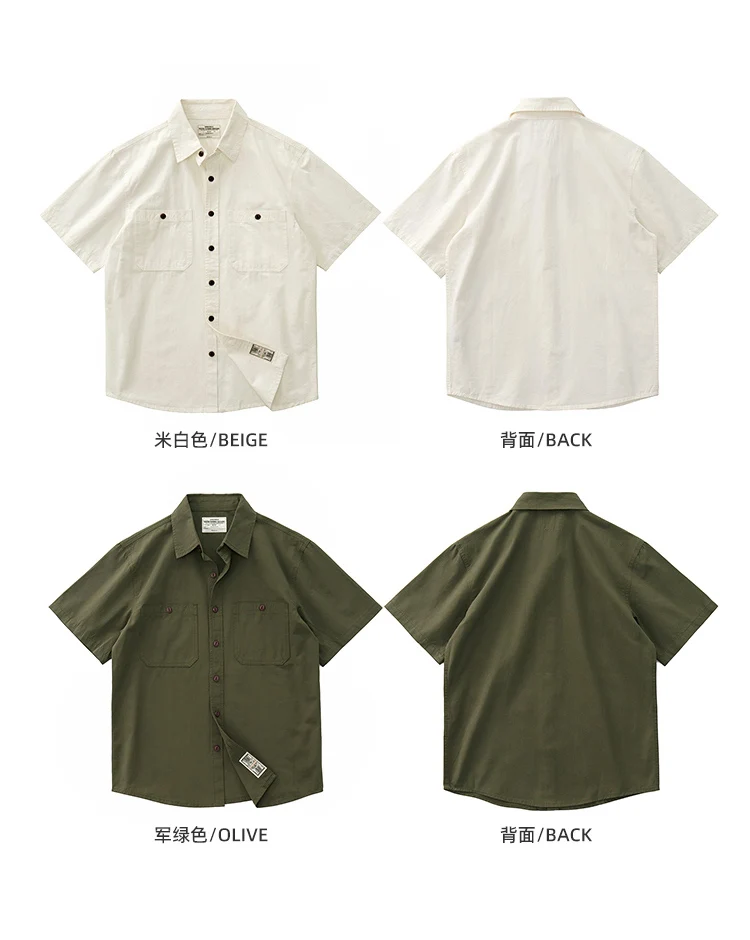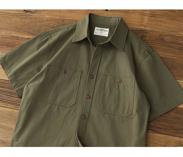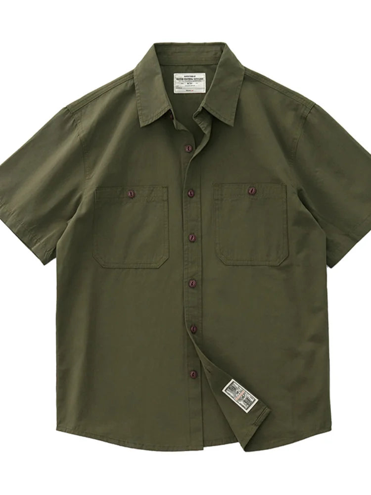 Wiaofellas - Summer American Retro Short Sleeve Lapel Cargo Shirt Men's Amei Khaki 100% Cotton Washed Double Pocket Casual Tough Guy Blouses
