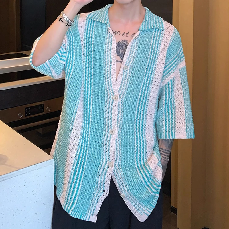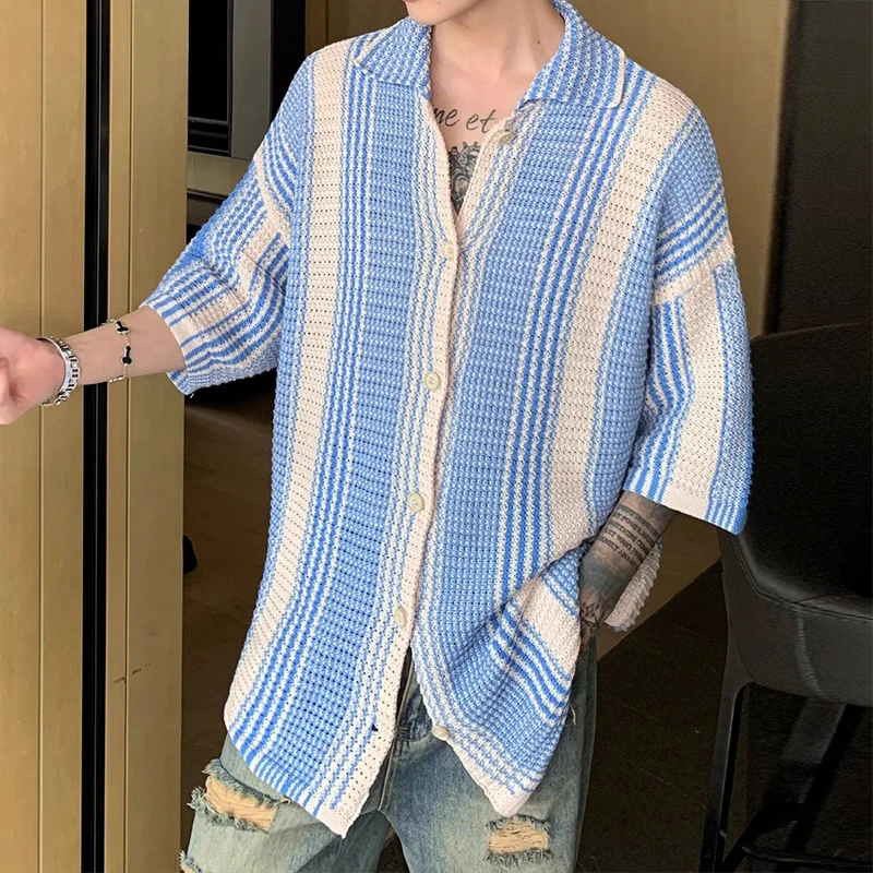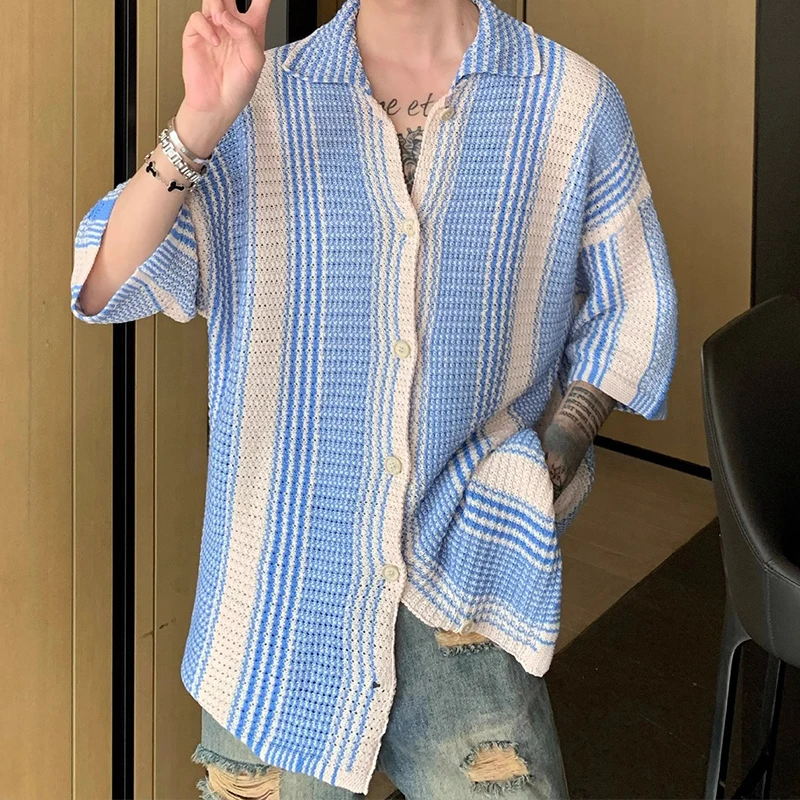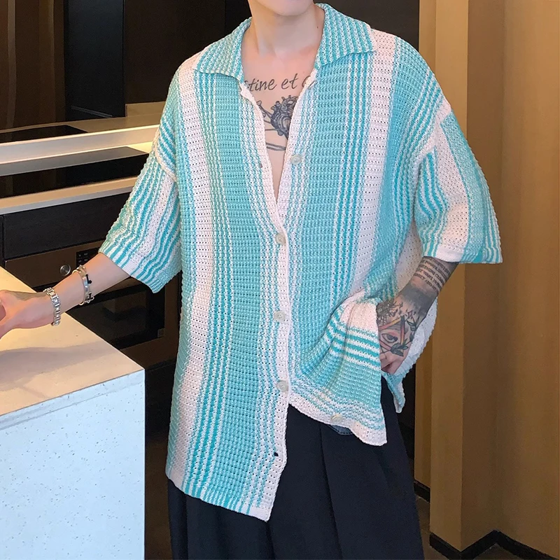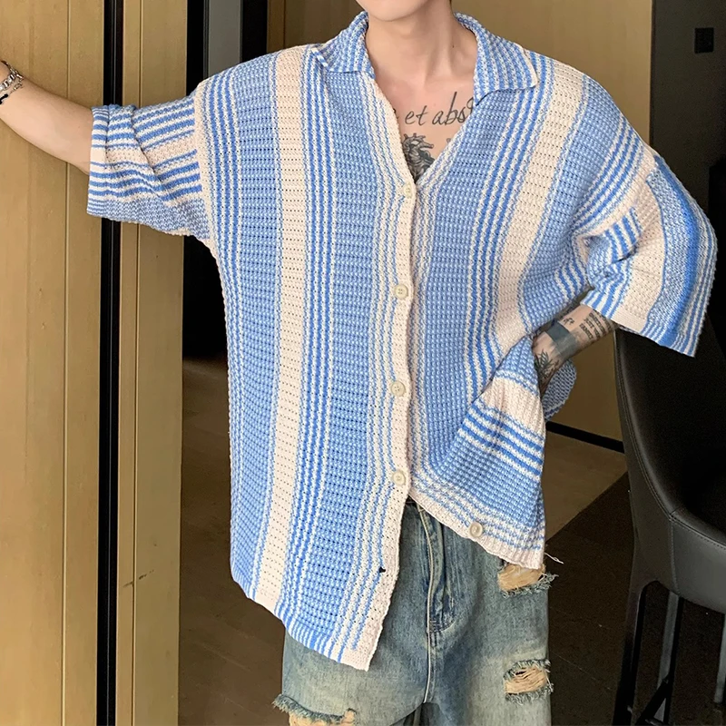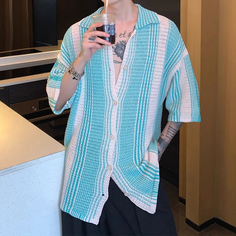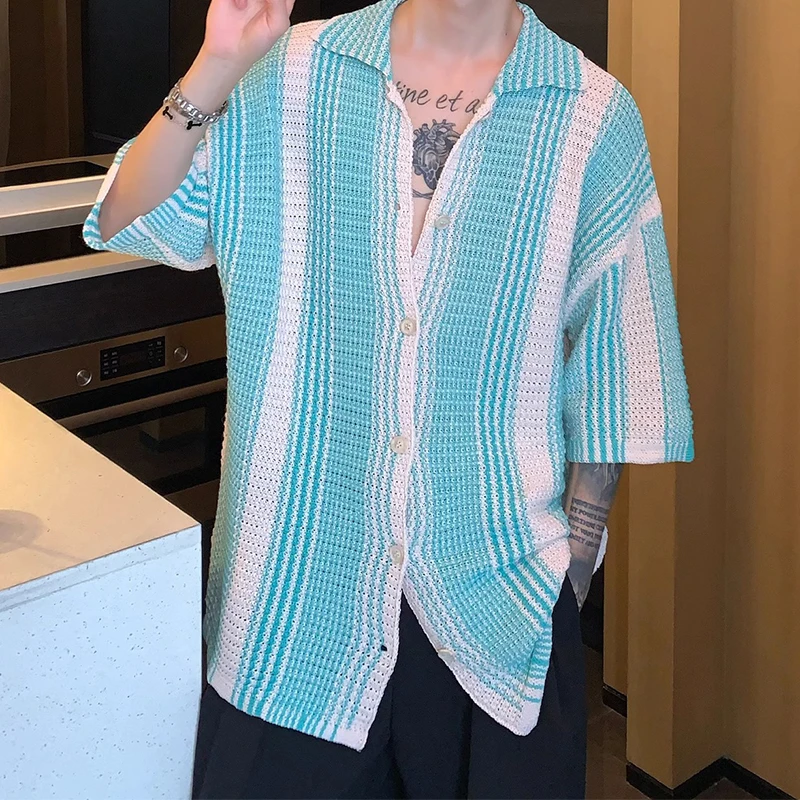 Wiaofellas - Summer Short Sleeve Hollow Out Knit Shirt Men Stylish Striped Contrast Collar Knitted Cardigan Mens Tops Fashion Button Shirts