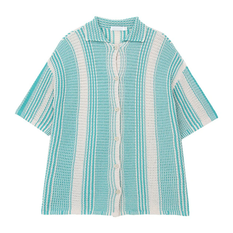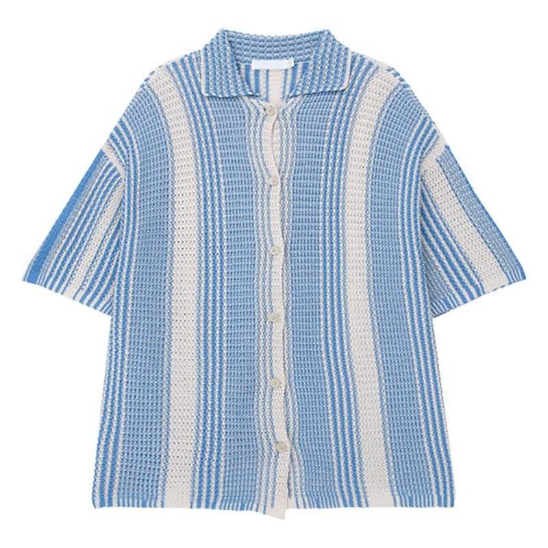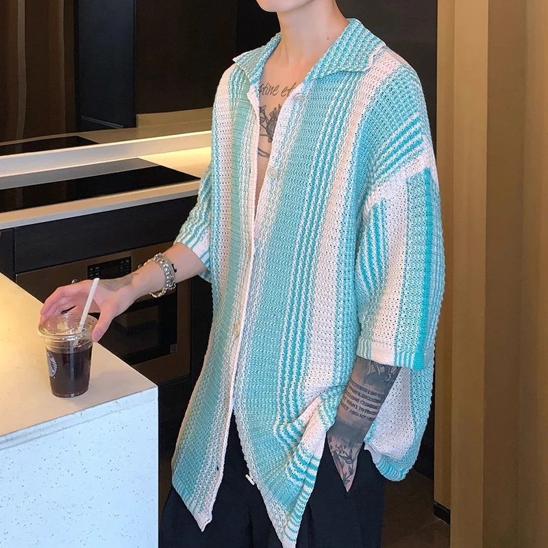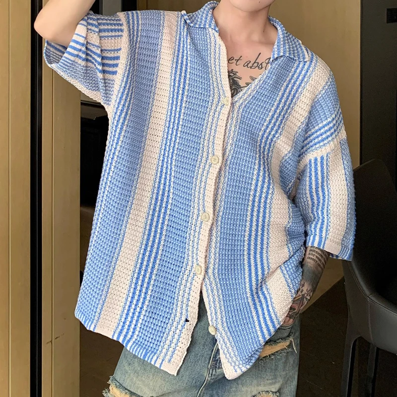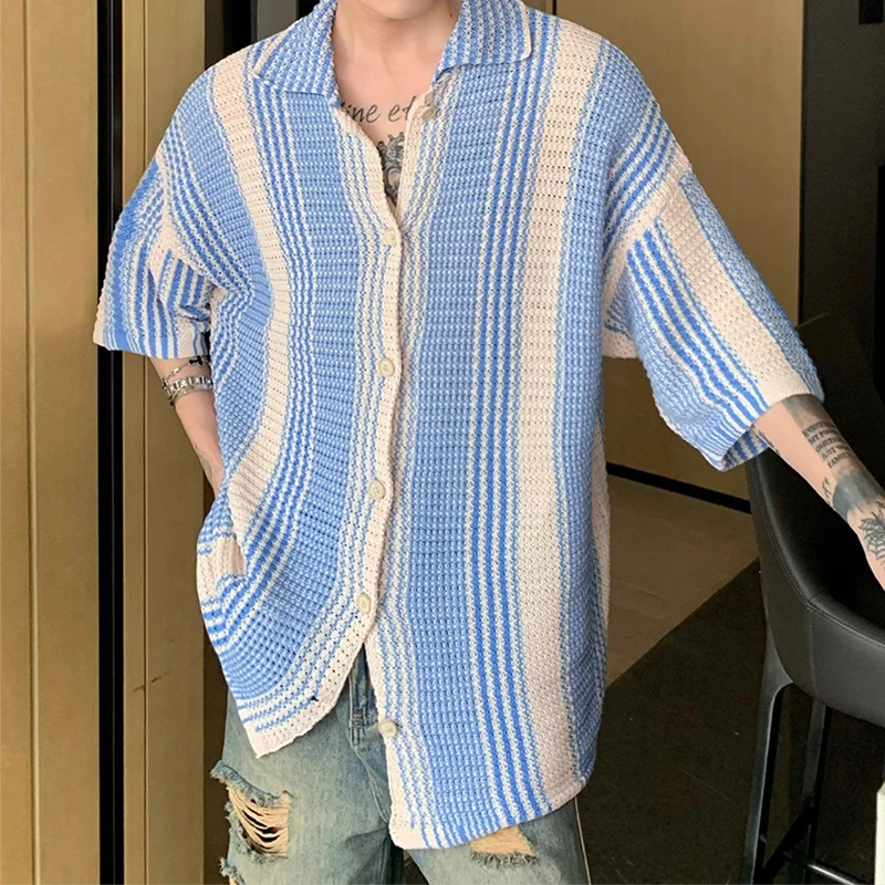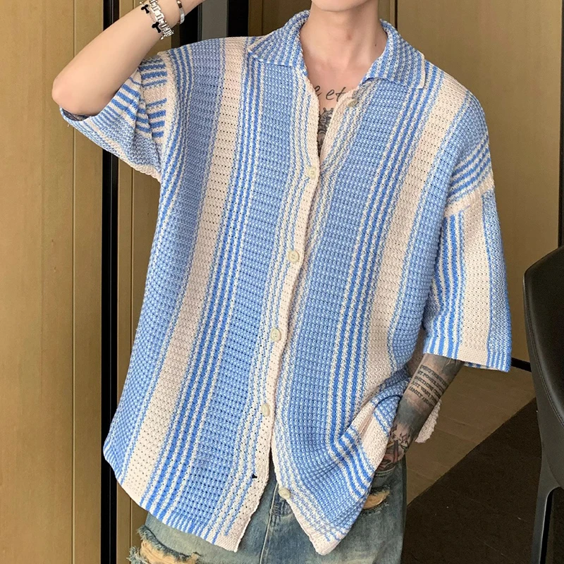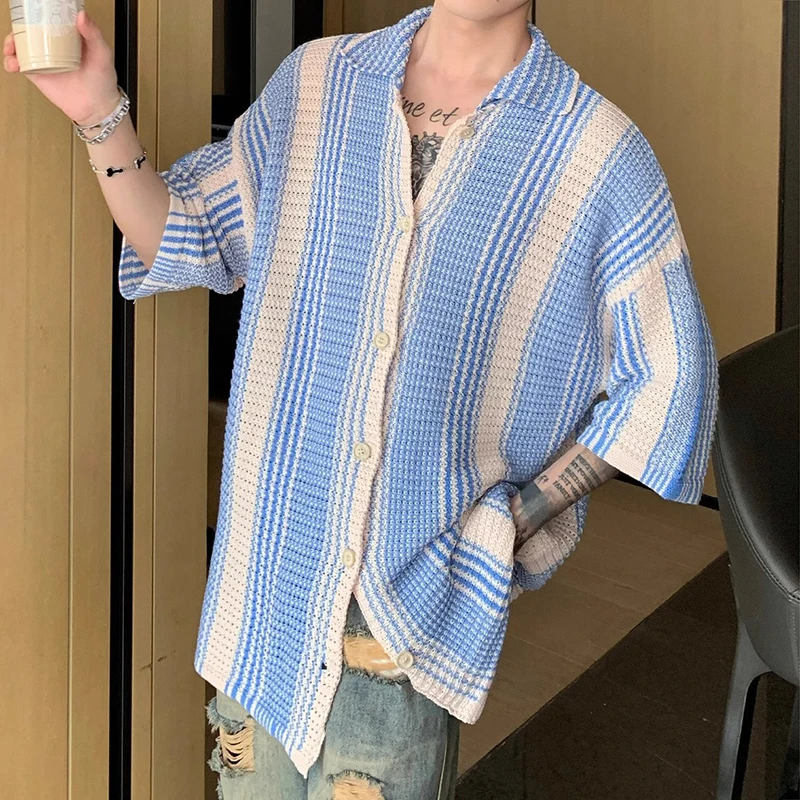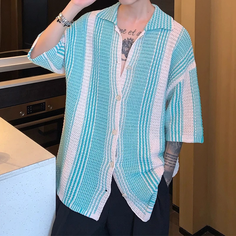 Wiaofellas - Summer Short Sleeve Hollow Out Knit Shirt Men Stylish Striped Contrast Collar Knitted Cardigan Mens Tops Fashion Button Shirts