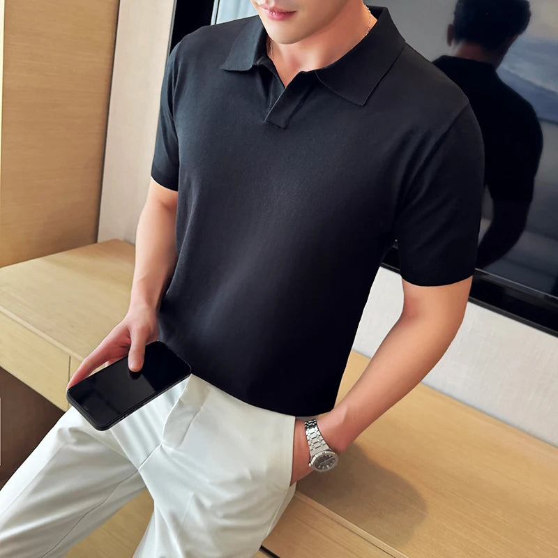WIAOFELLAS - 2025 Trend Summer Solid Color Lapel Men's Casual Thin Breathable Fabric Fashion Short Sleeve Slim Knitted T-shirt Tops A117