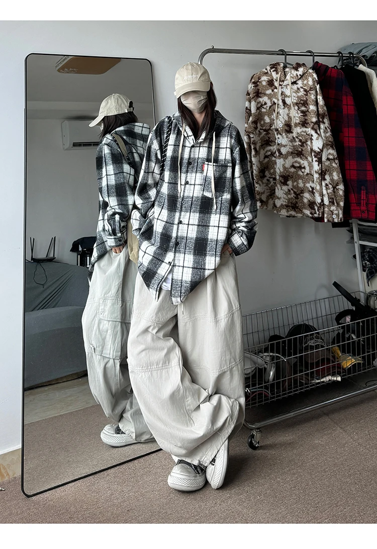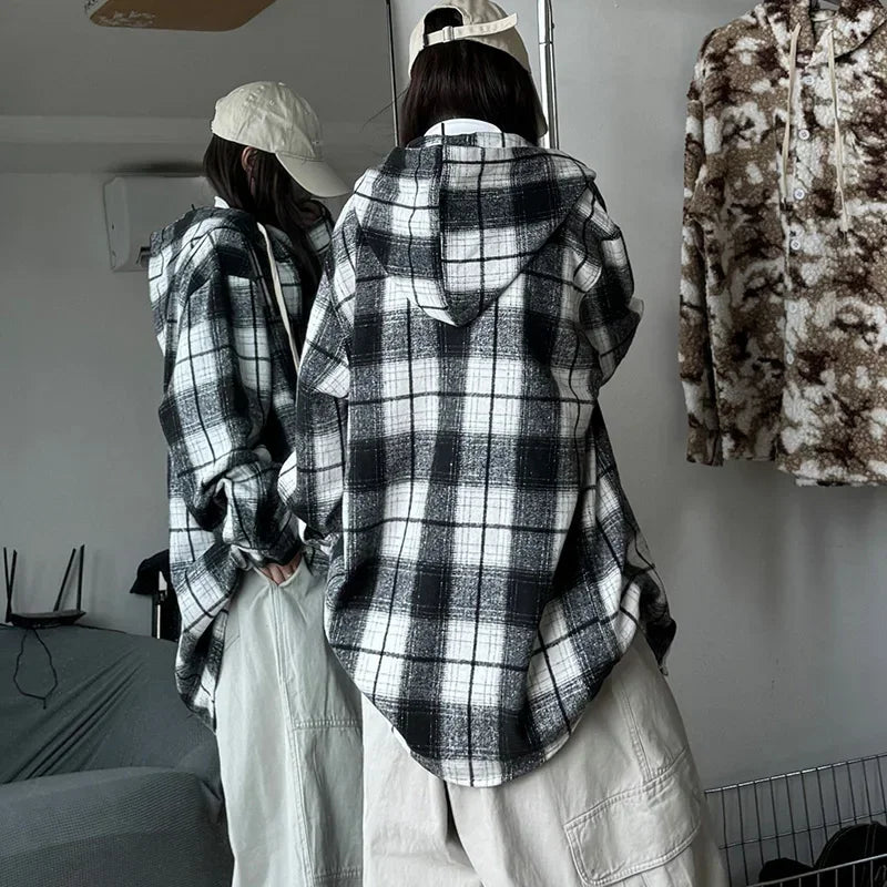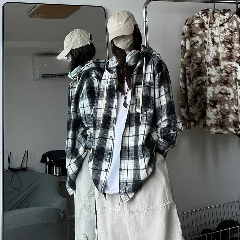 WIAOFELLAS  -  7XL Streetwear Hip Hop Plaid Woolen Unisex Hooded Shirt Autumn Winter Thick Long Sleeve Loose Men Shirts Plus Size Mens Clothing