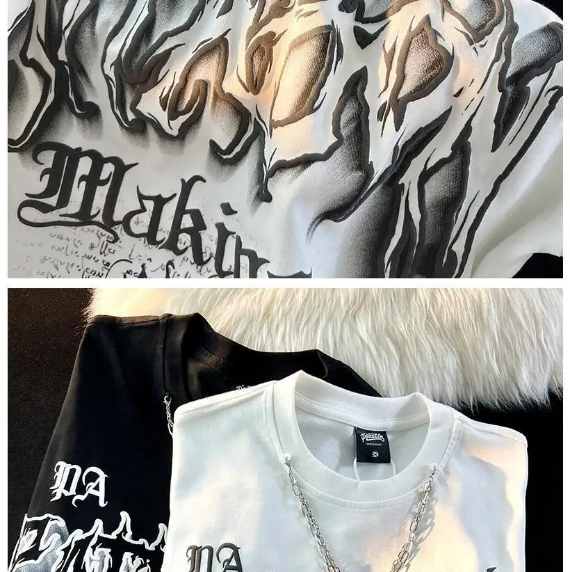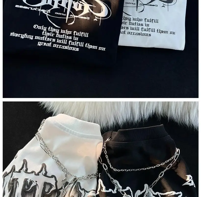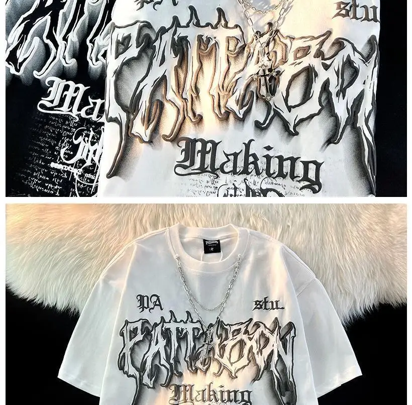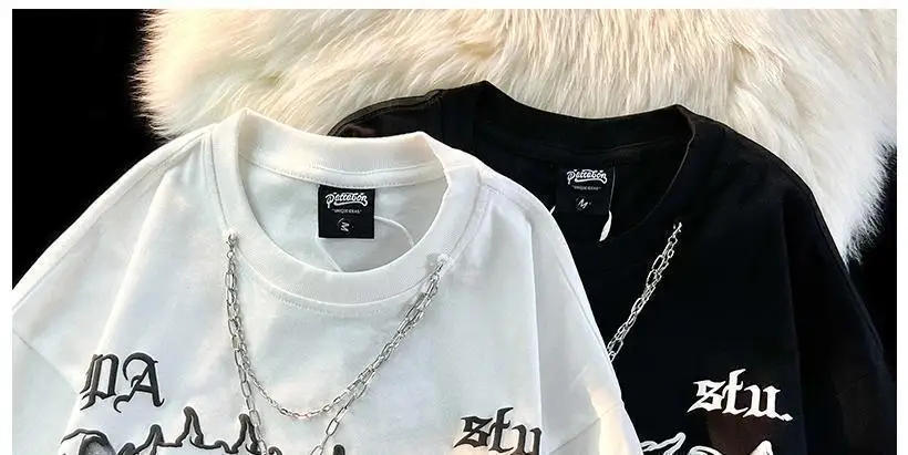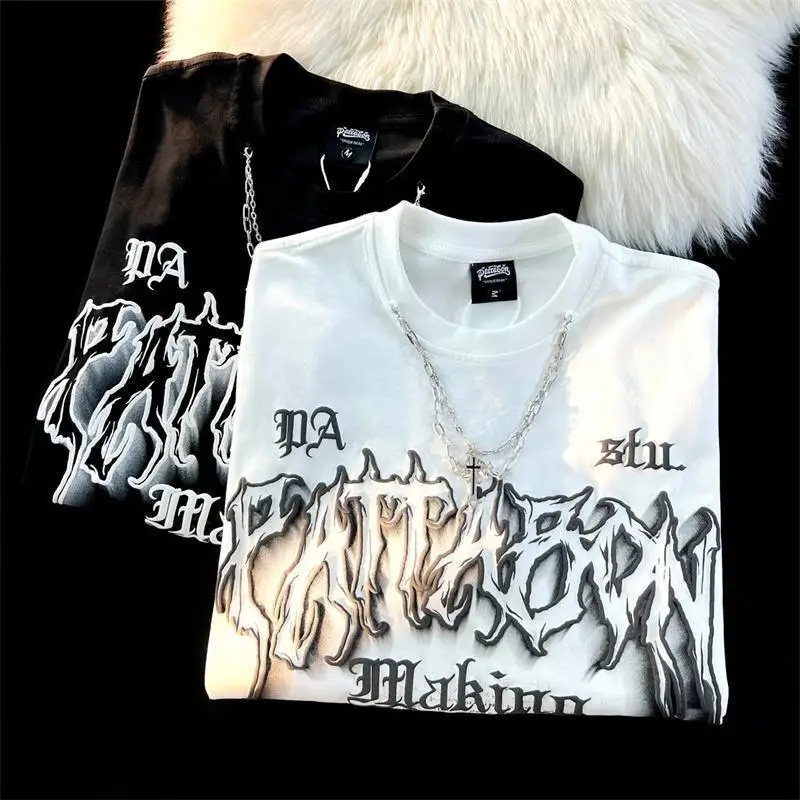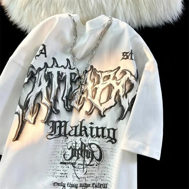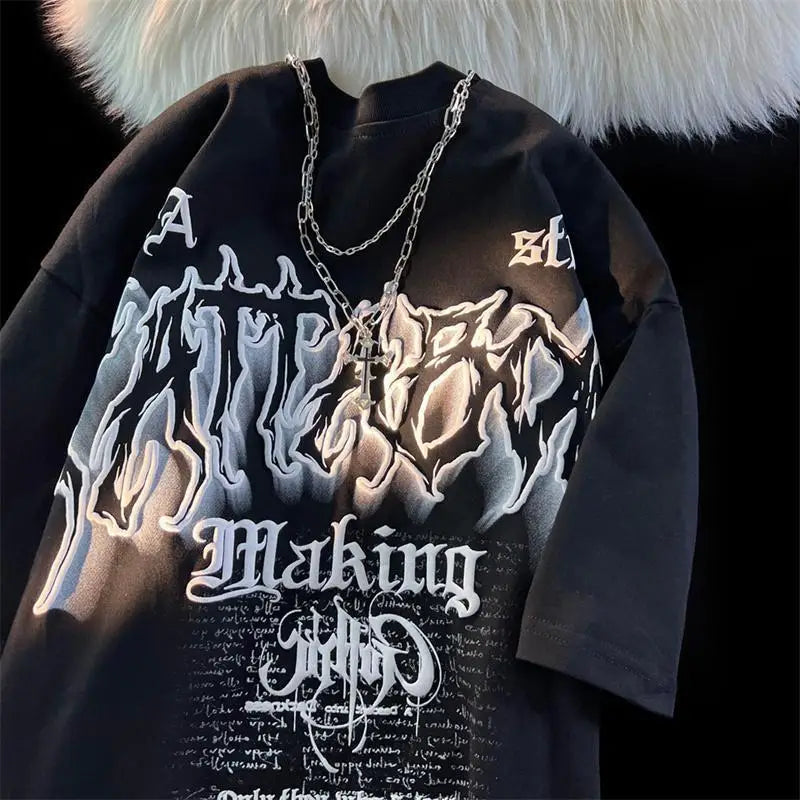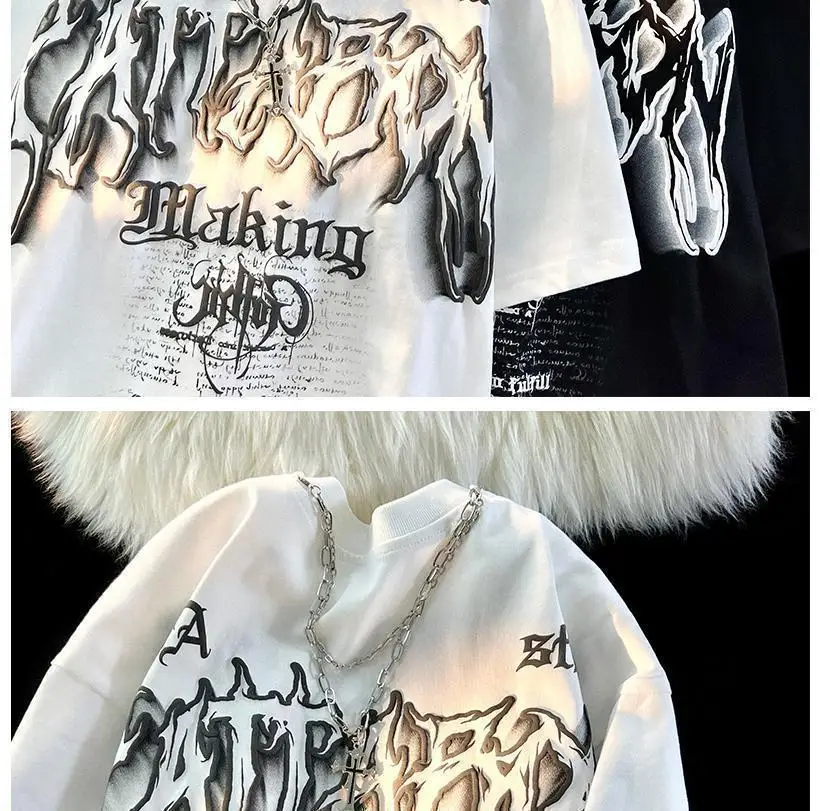 WIAOFELLAS - American Fashion Gothic Letter Necklace Short-sleeved T-shirt Men's Summer Loose Street Style Half-sleeved Oversize Top Urban