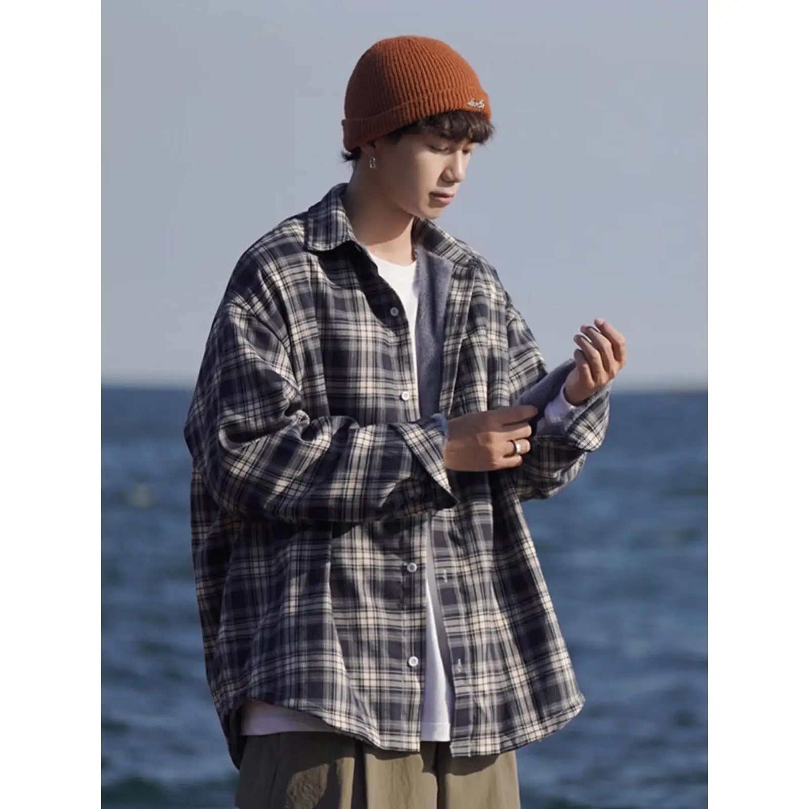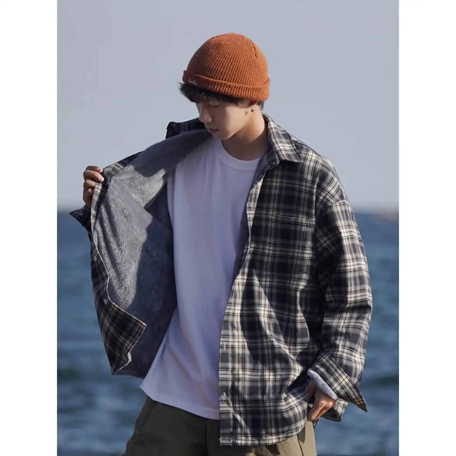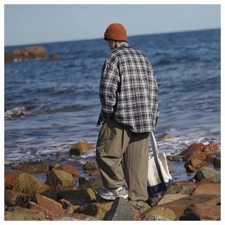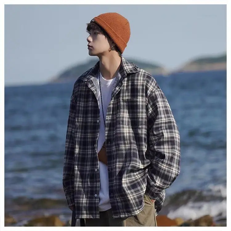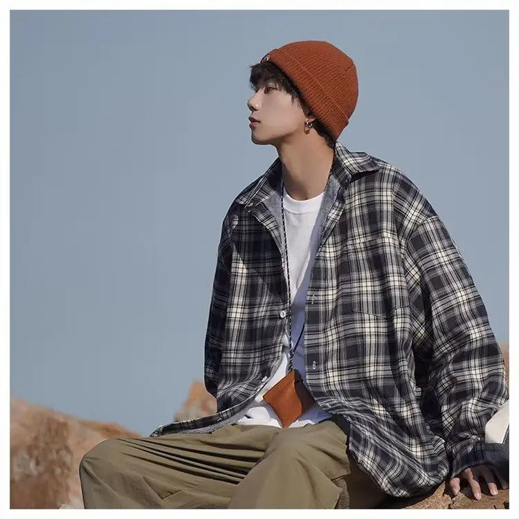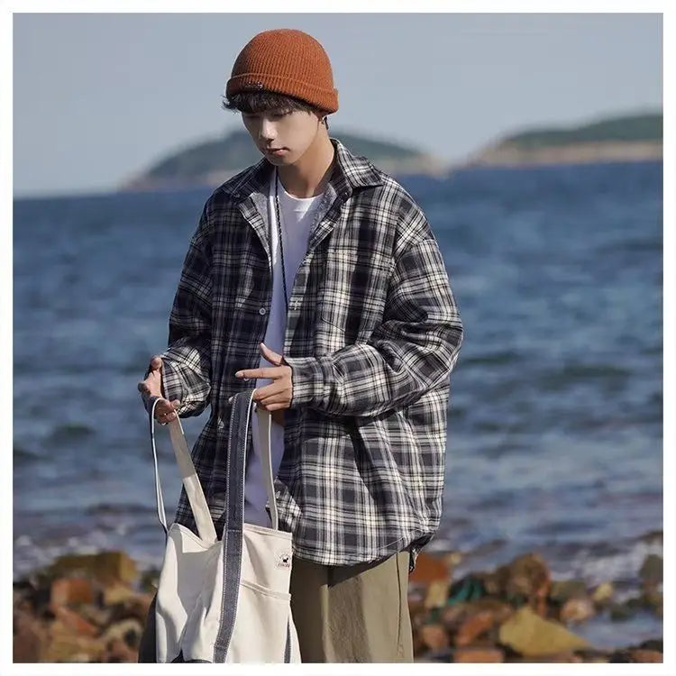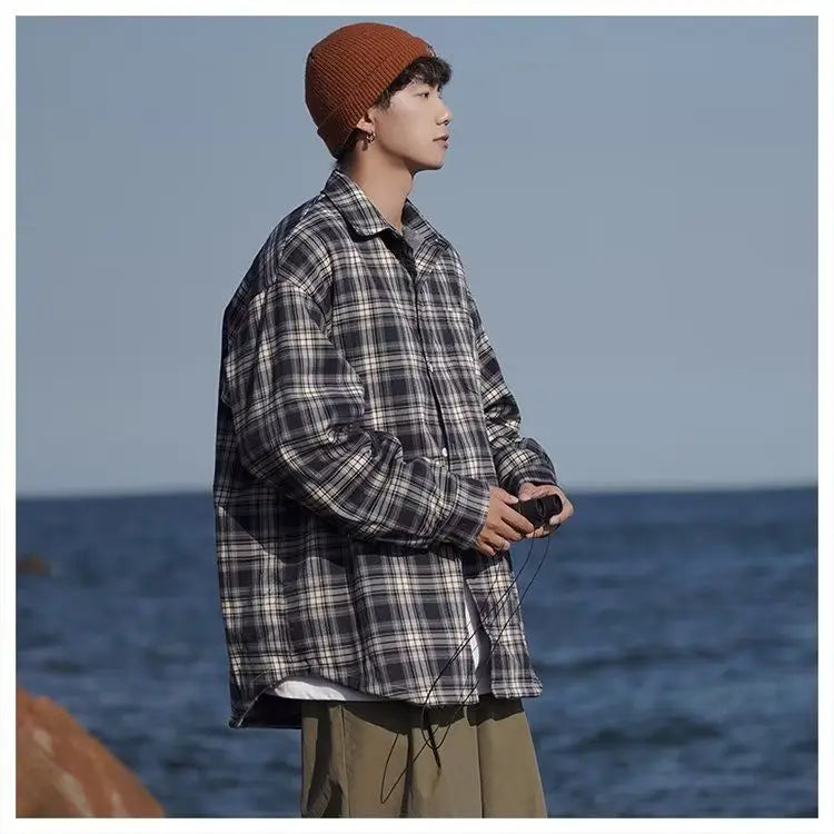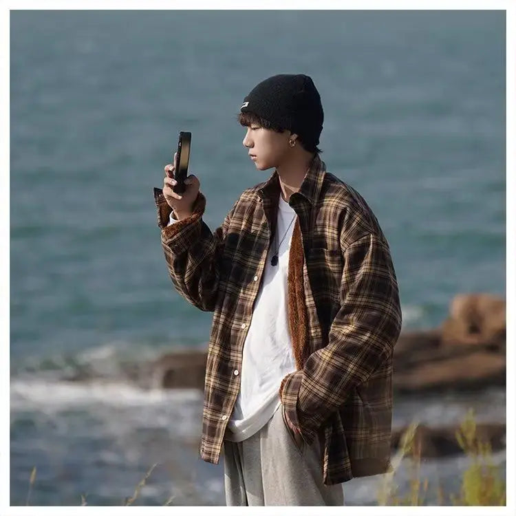 WIAOFELLAS  -  American retro plaid shirt men's autumn and winter thickened and fleece warm, trendy loose and casual long-sleeved shirt jacket