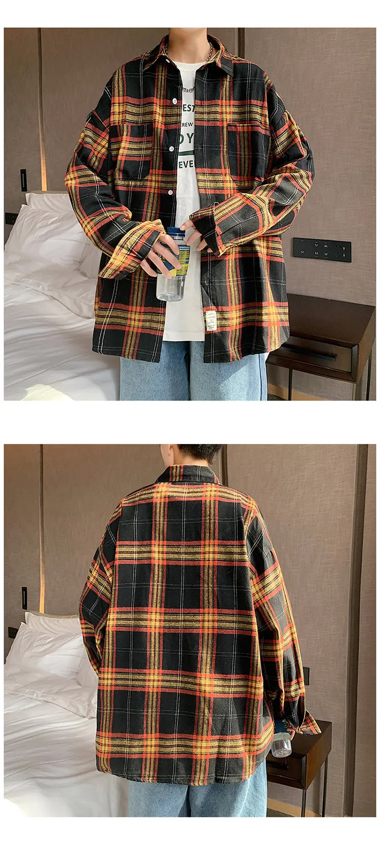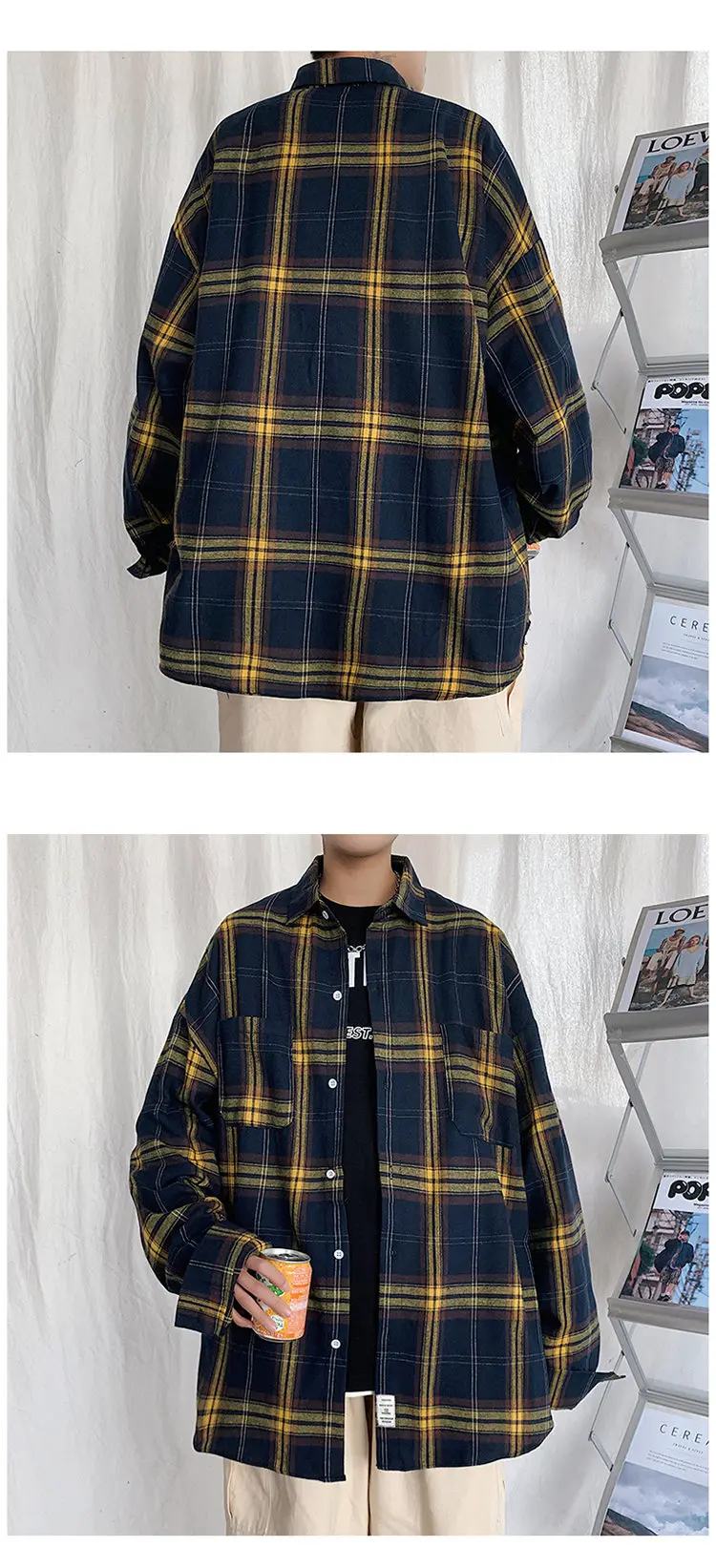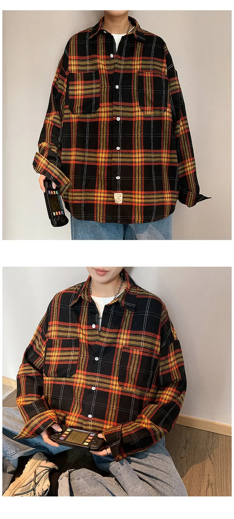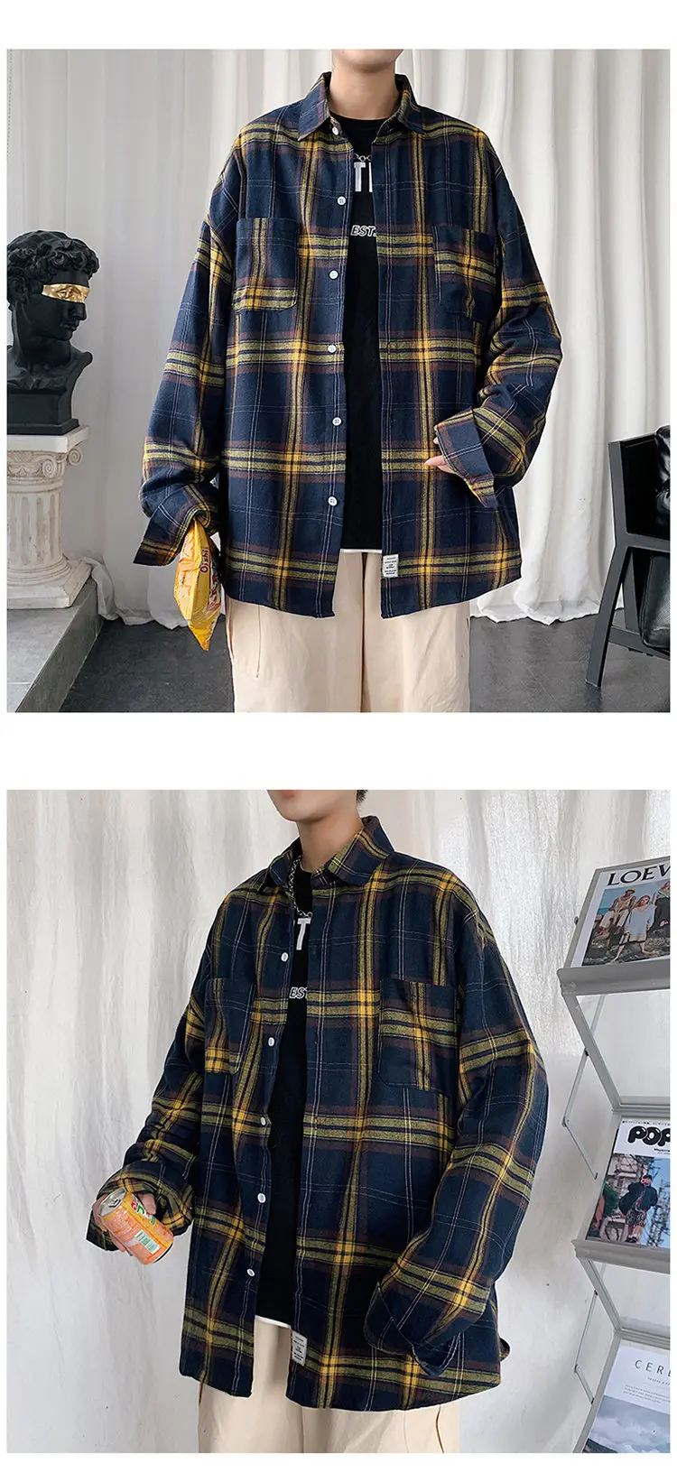Wiaofellas - Autumn Oversized Long Sleeved Shirt Men Fashion Retro Plaid Shirt Men Streetwear Korean Loose Casual Shirts Mens Large Size 5XL