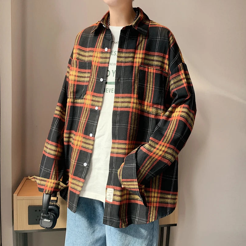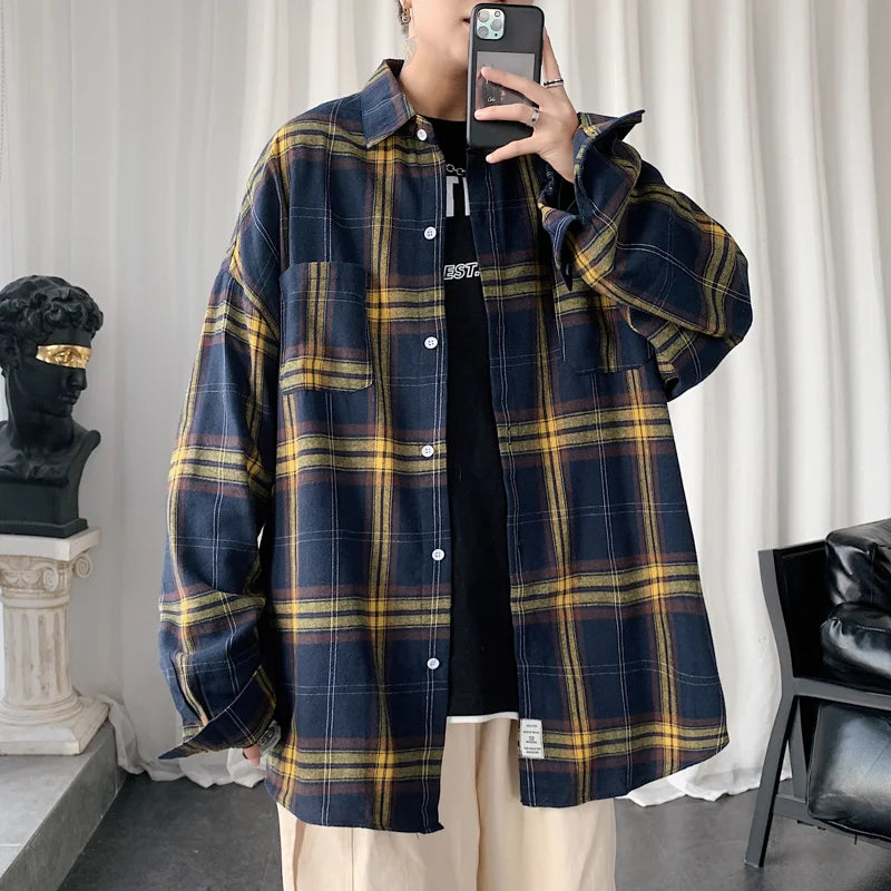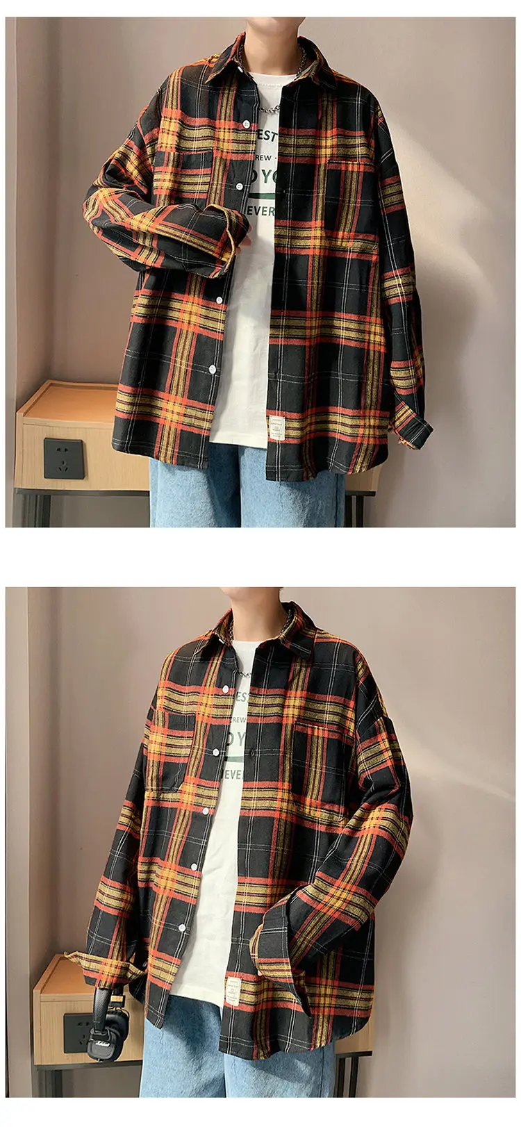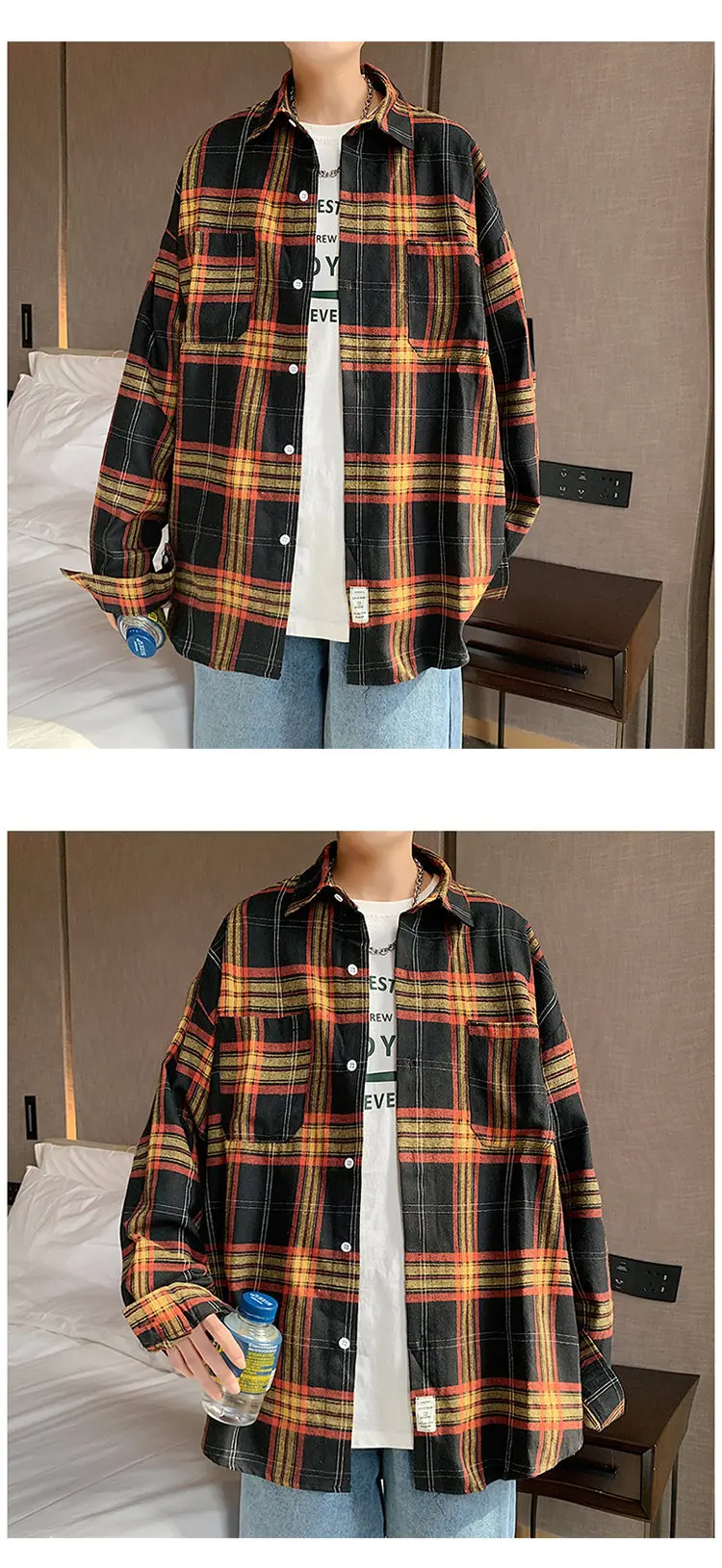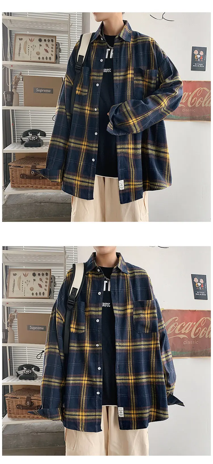 Wiaofellas - Autumn Oversized Long Sleeved Shirt Men Fashion Retro Plaid Shirt Men Streetwear Korean Loose Casual Shirts Mens Large Size 5XL