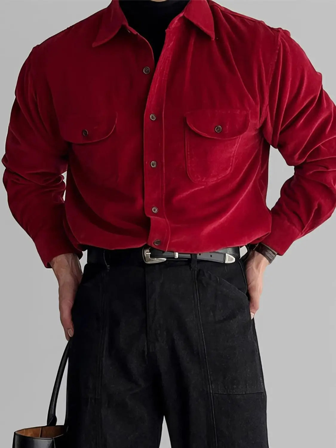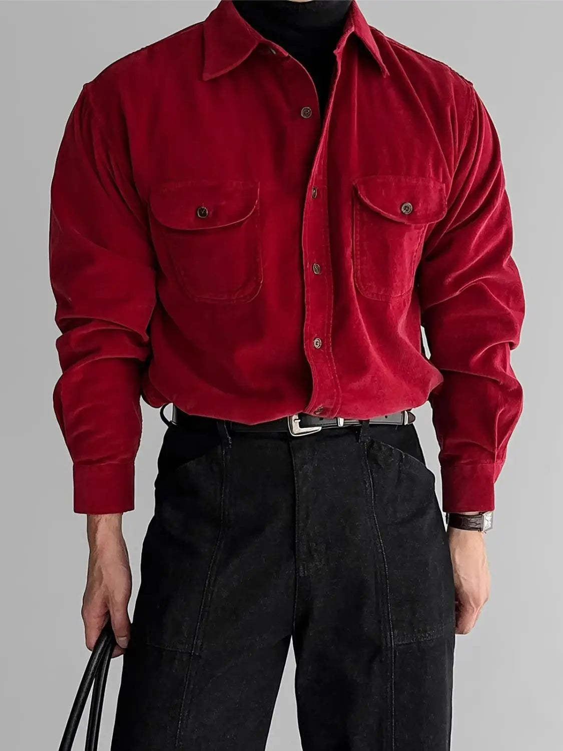 WIAOFELLAS - Burgundy thin corduroy shirt men's flip double patch pocket high-end mature long-sleeved red shirt men Autumn clothes