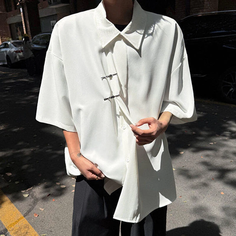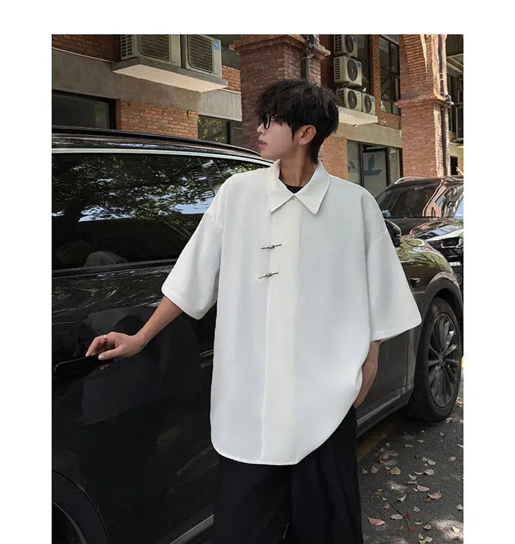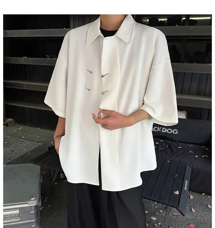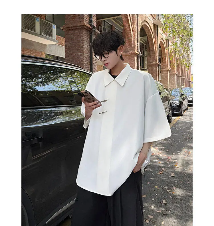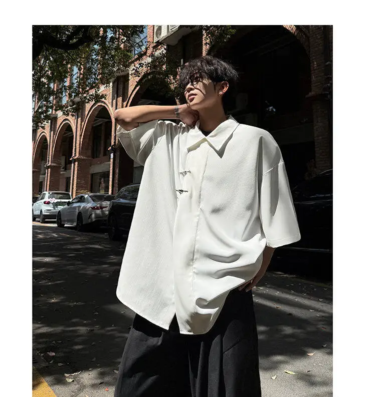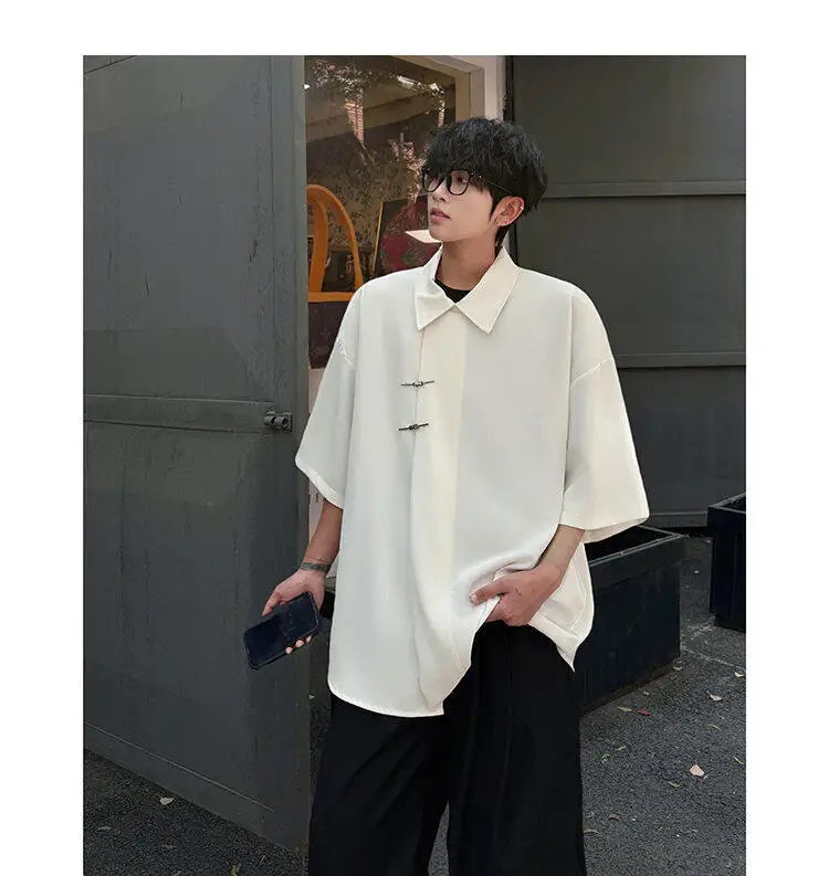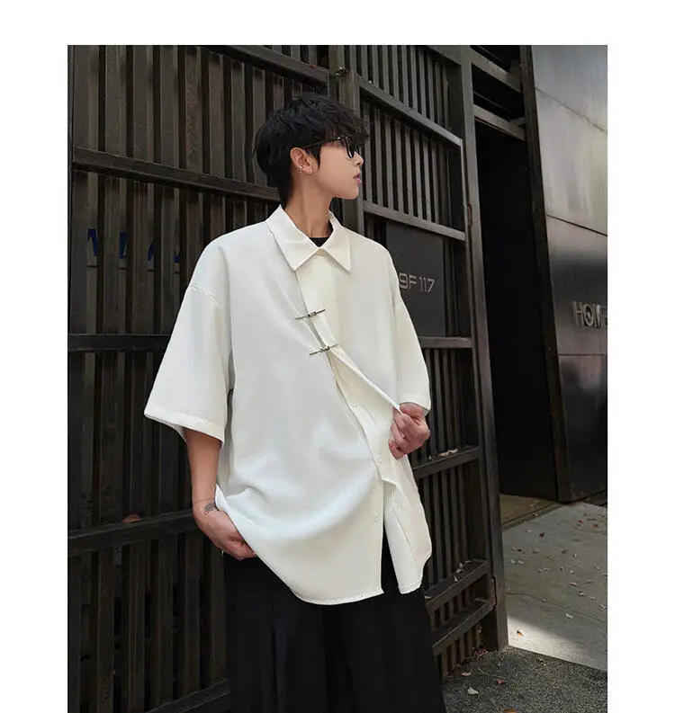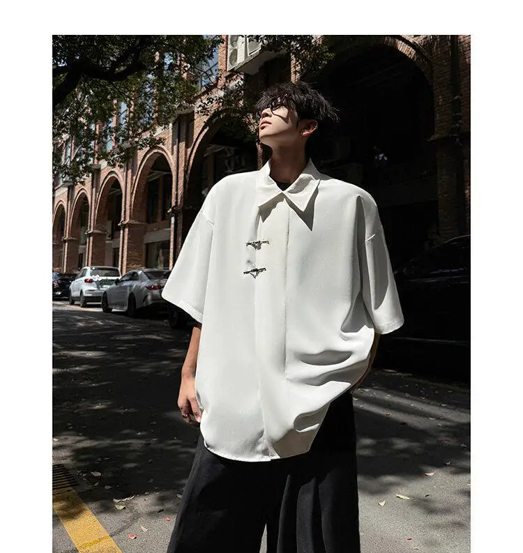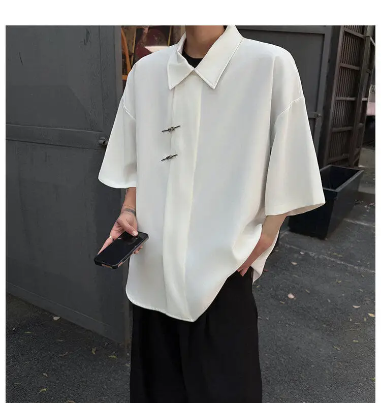 WIAOFELLAS - Chinese Style Ice Silk Short Sleeved Shirts Men's Metal Buckle Solid Color Lapel Oblique Placket Male Loose Cloth