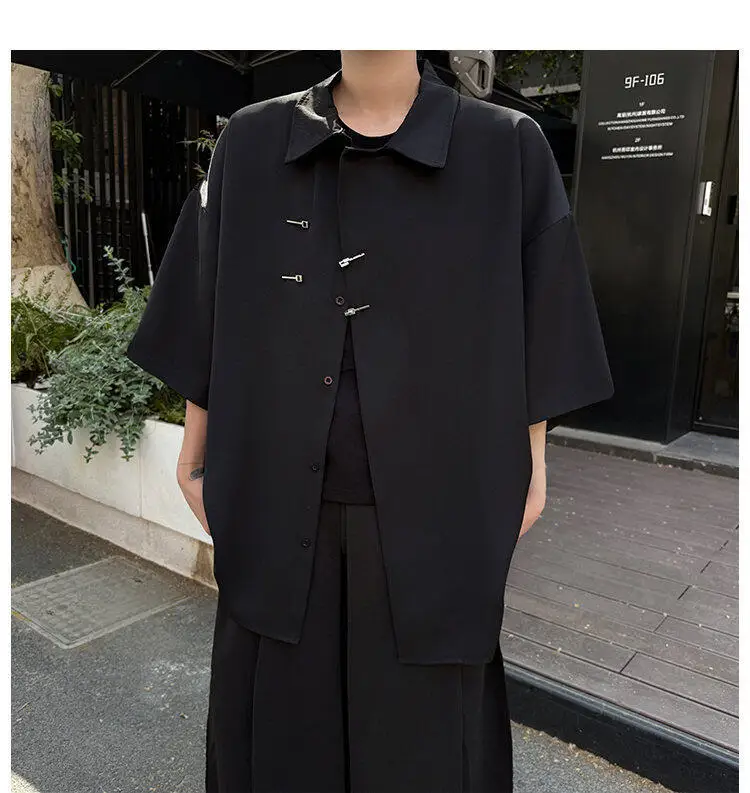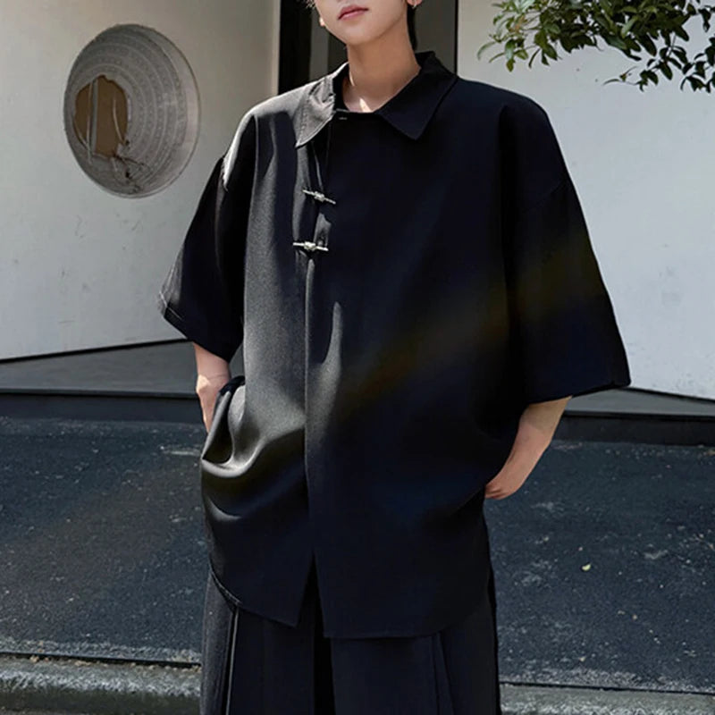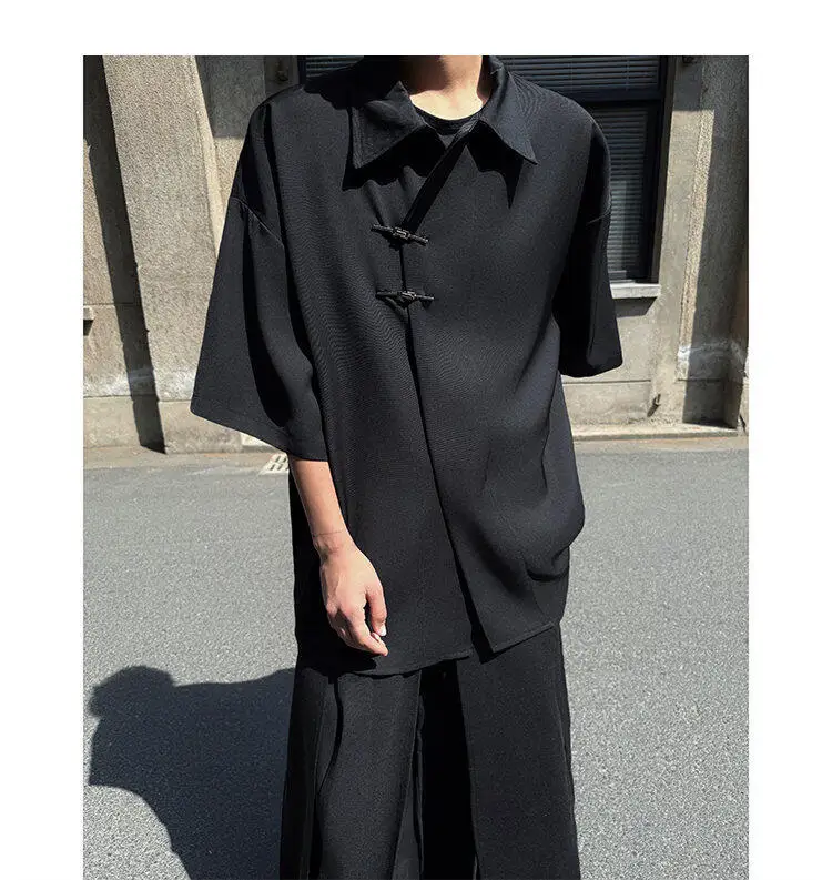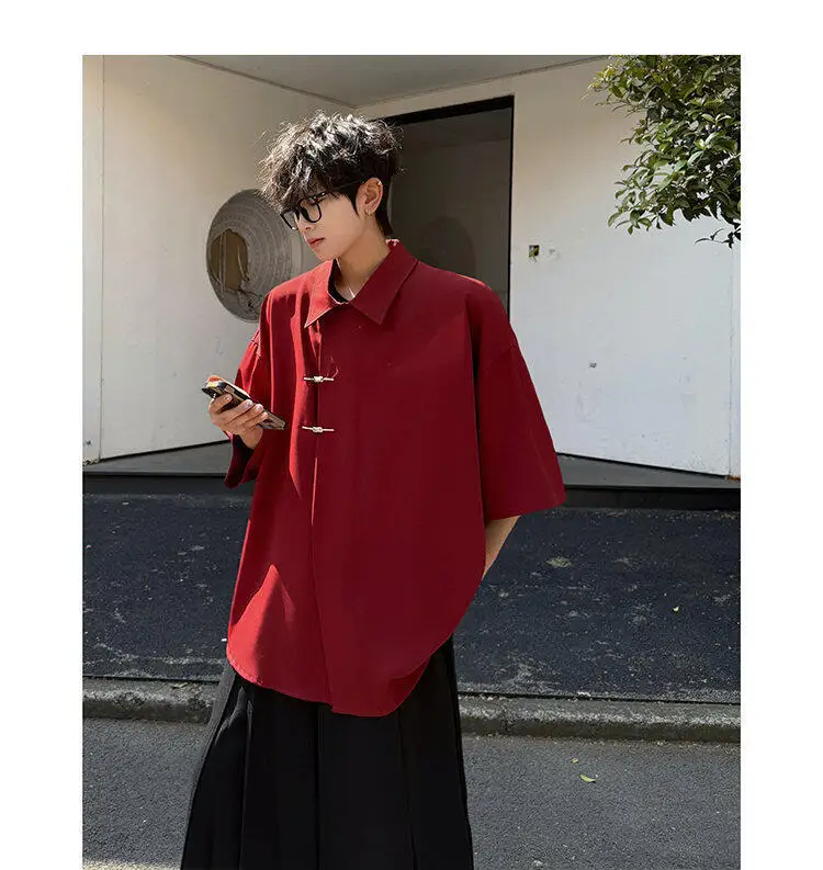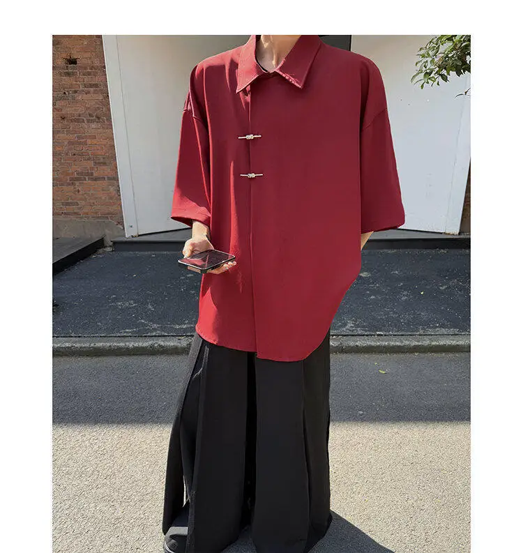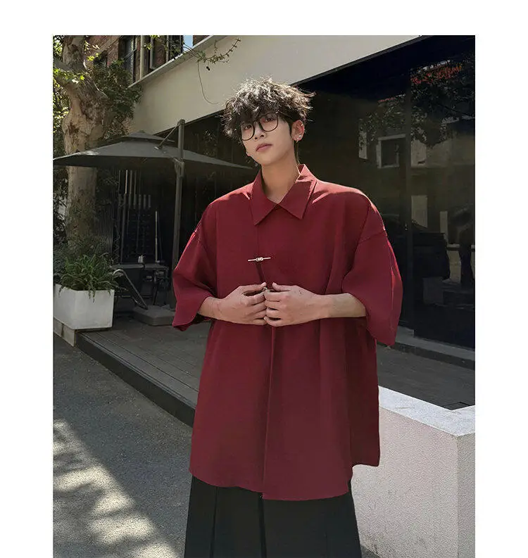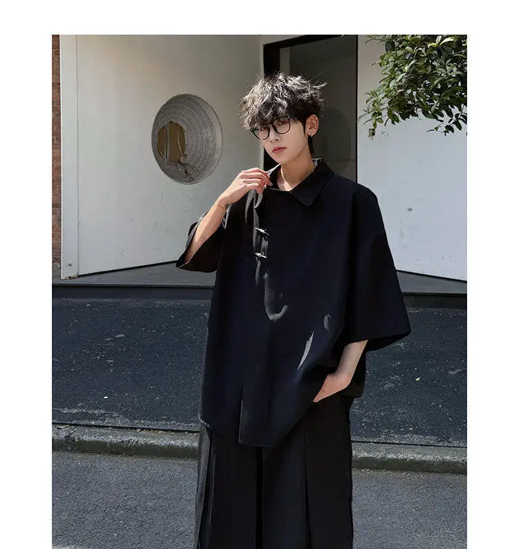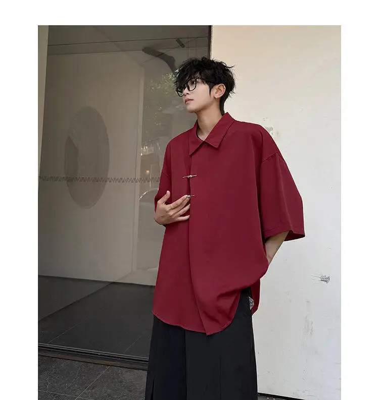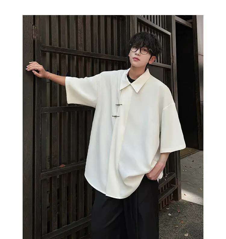 WIAOFELLAS - Chinese Style Ice Silk Short Sleeved Shirts Men's Metal Buckle Solid Color Lapel Oblique Placket Male Loose Cloth
