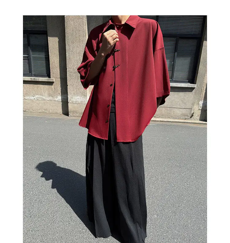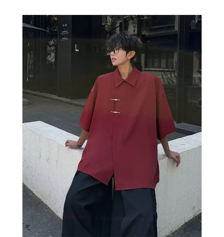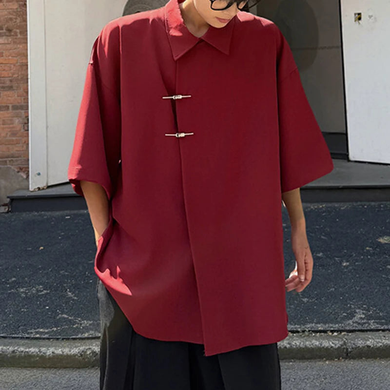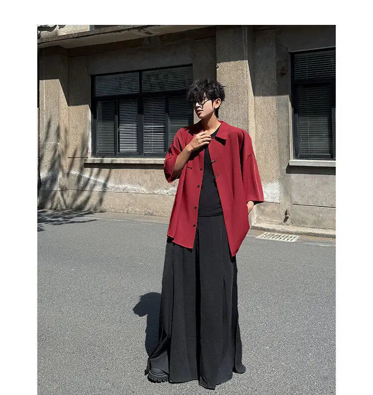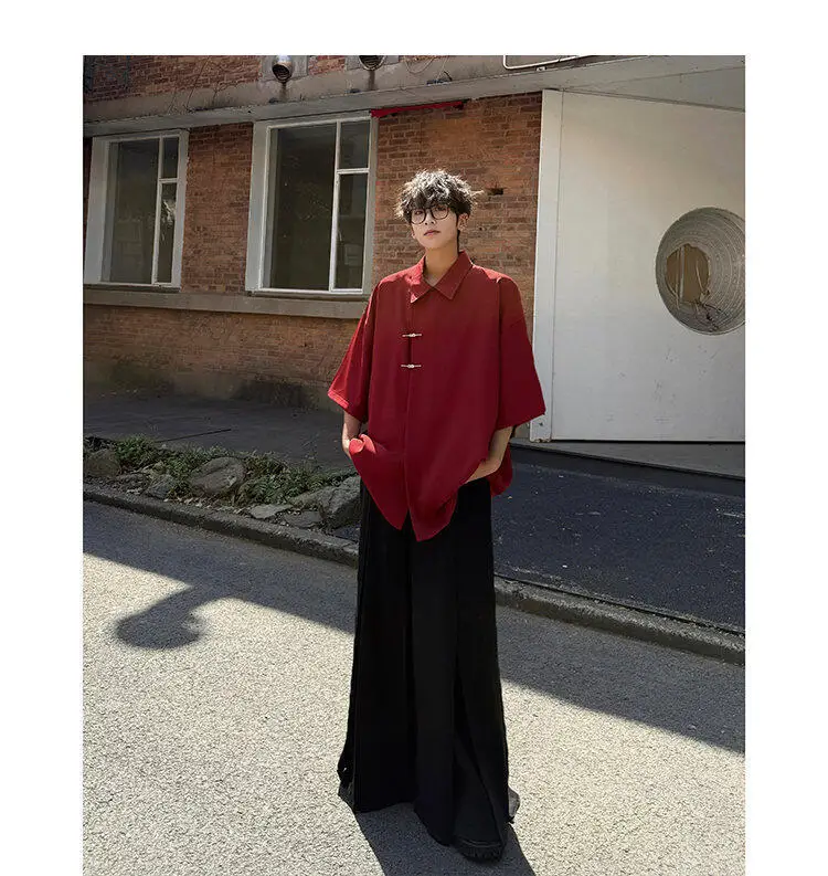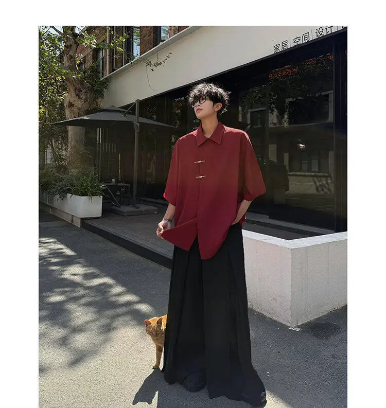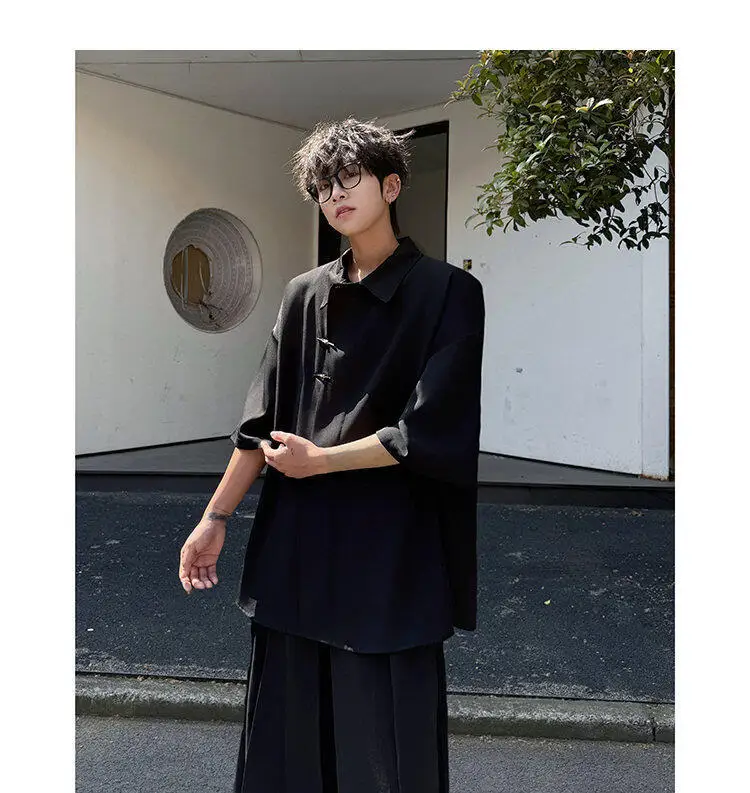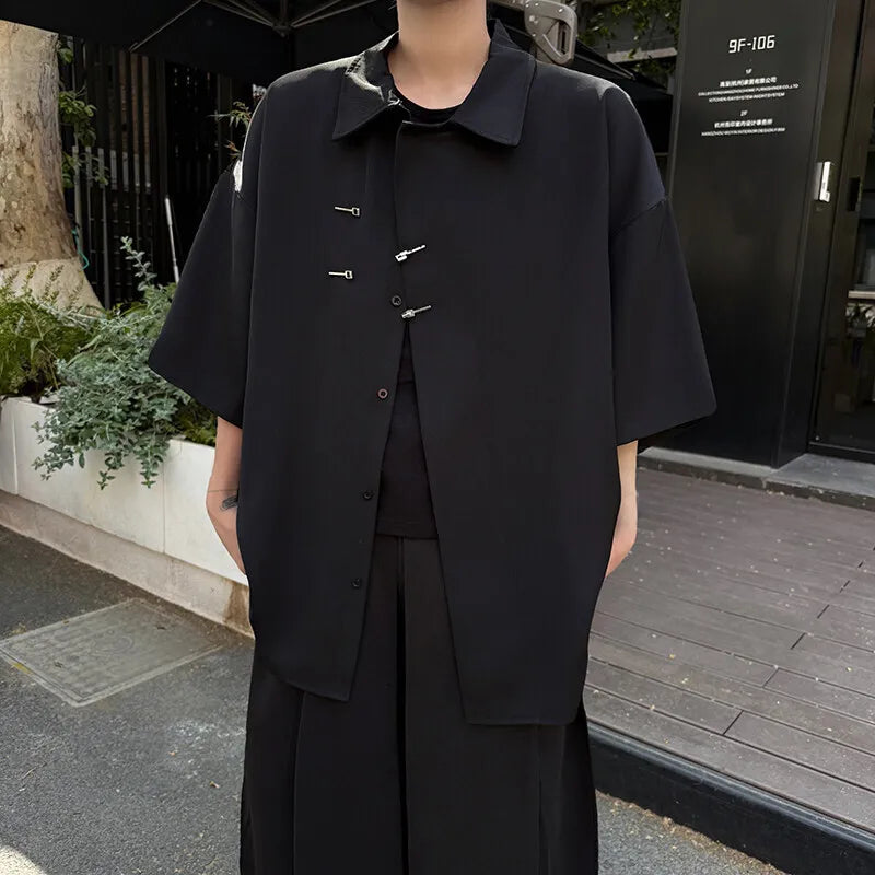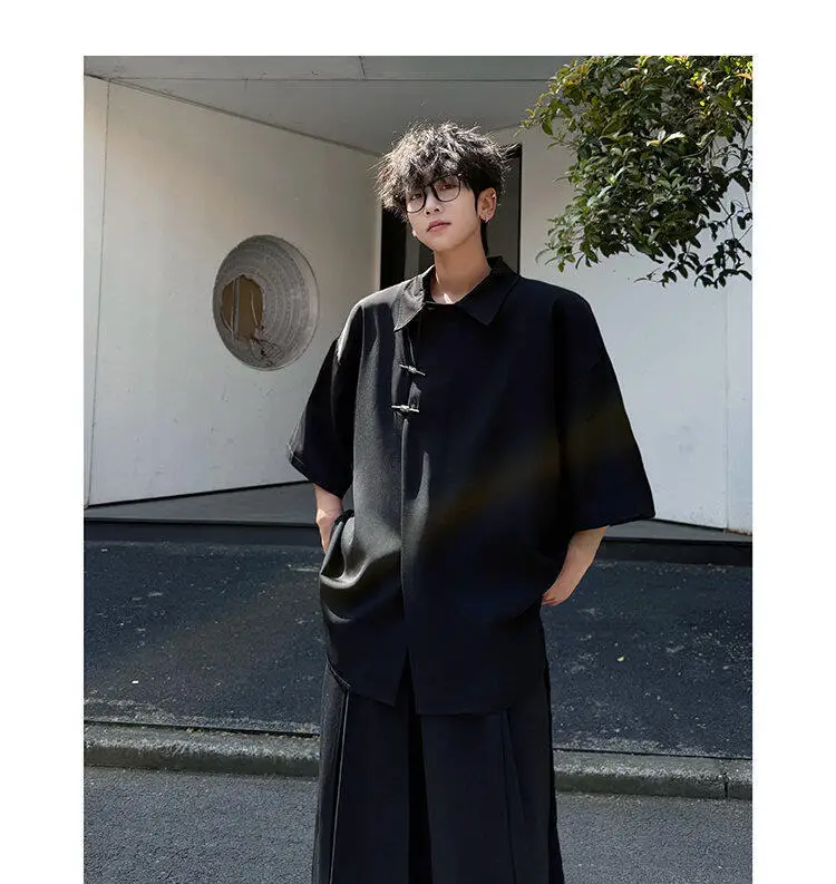 WIAOFELLAS - Chinese Style Ice Silk Short Sleeved Shirts Men's Metal Buckle Solid Color Lapel Oblique Placket Male Loose Cloth