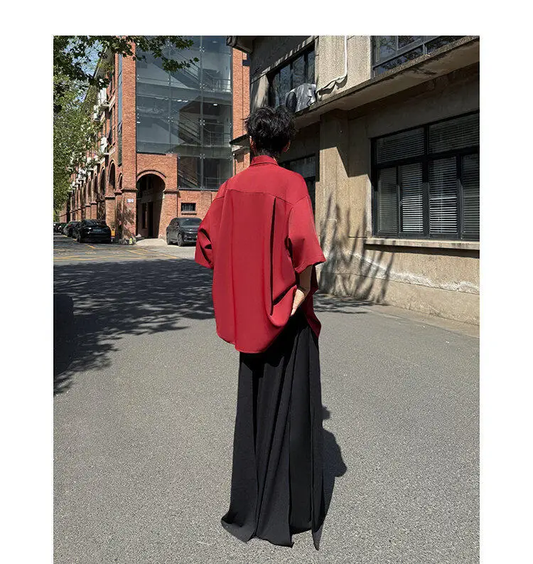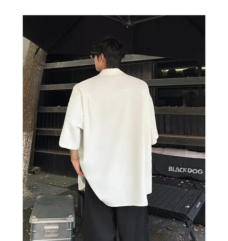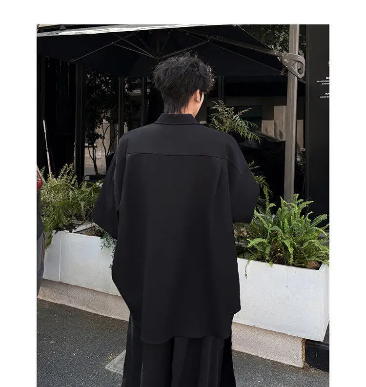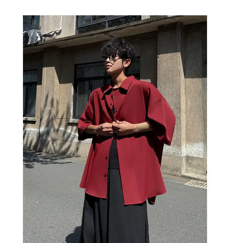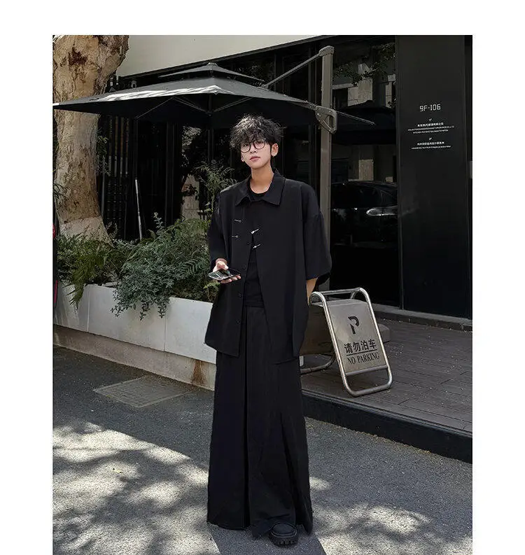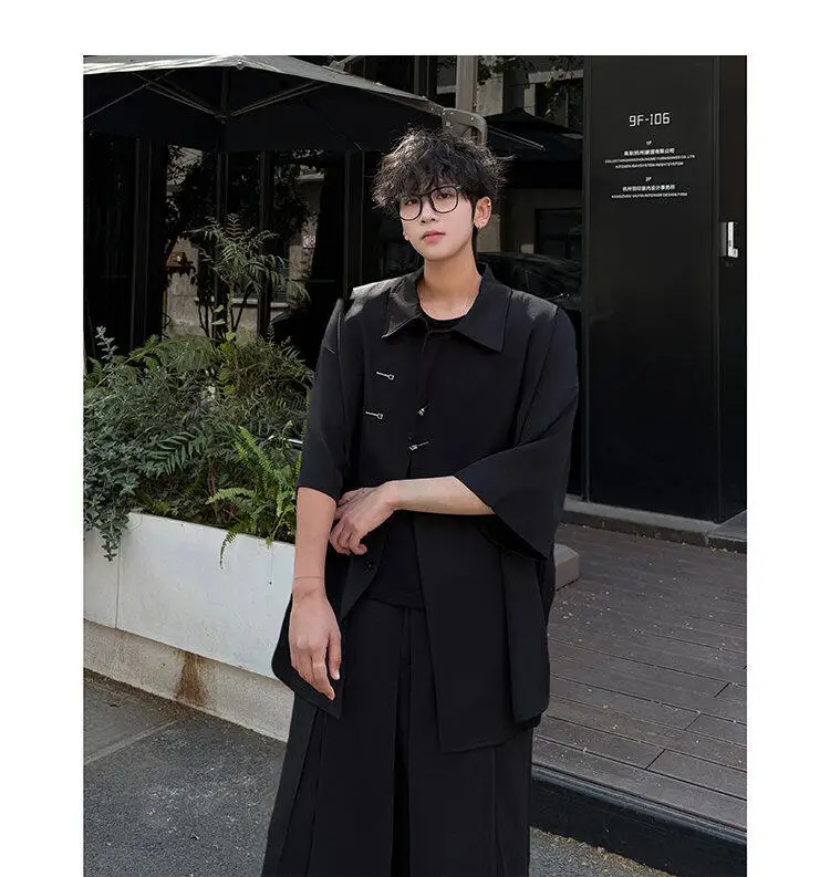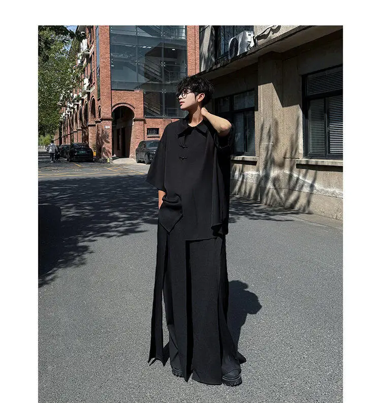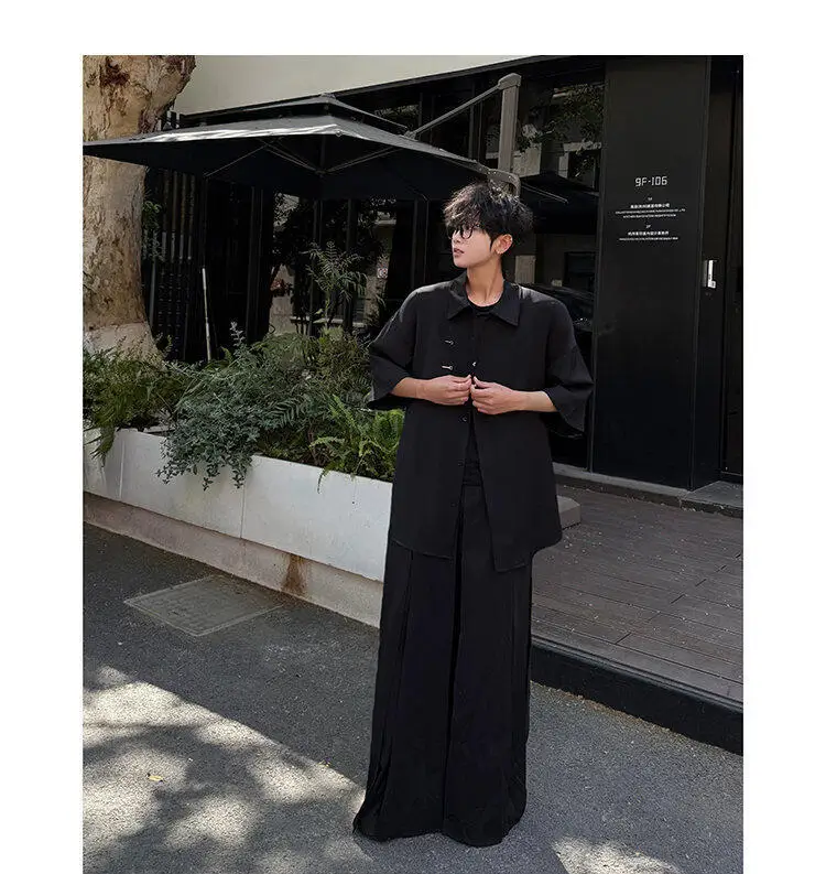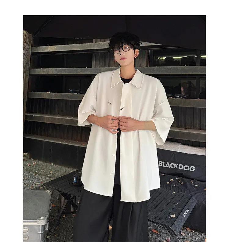 WIAOFELLAS - Chinese Style Ice Silk Short Sleeved Shirts Men's Metal Buckle Solid Color Lapel Oblique Placket Male Loose Cloth