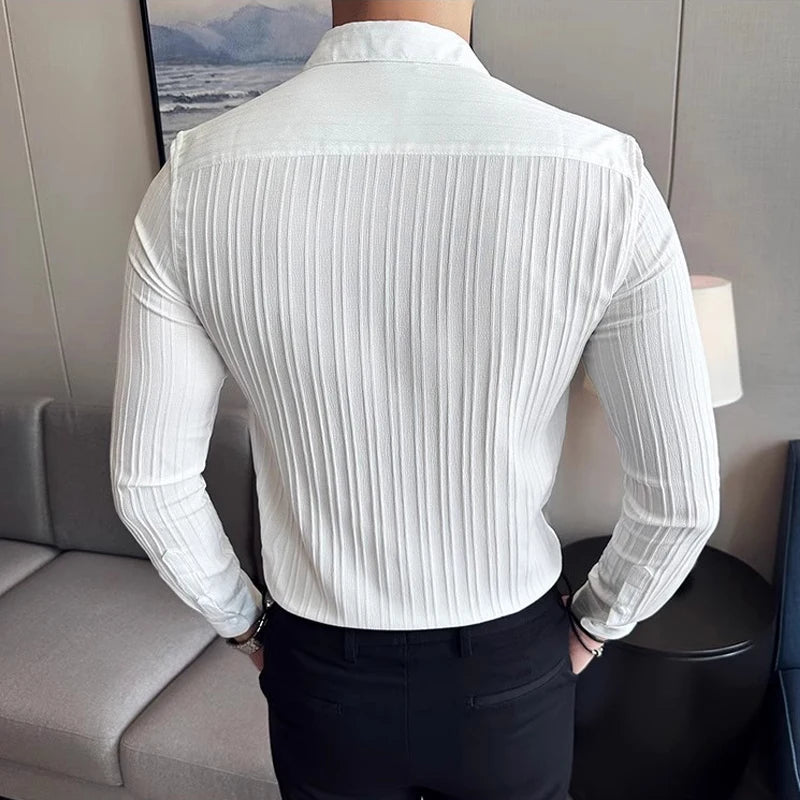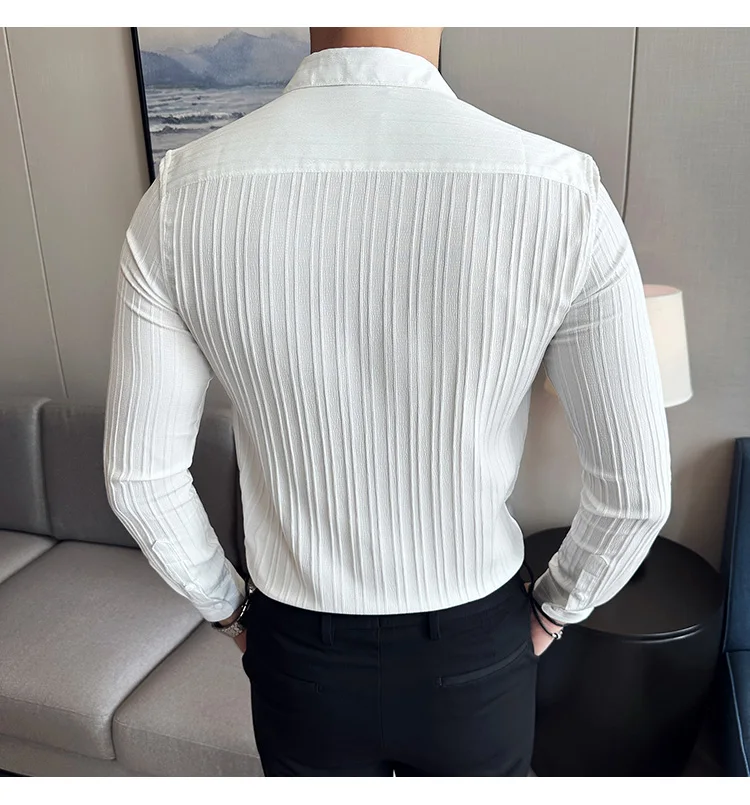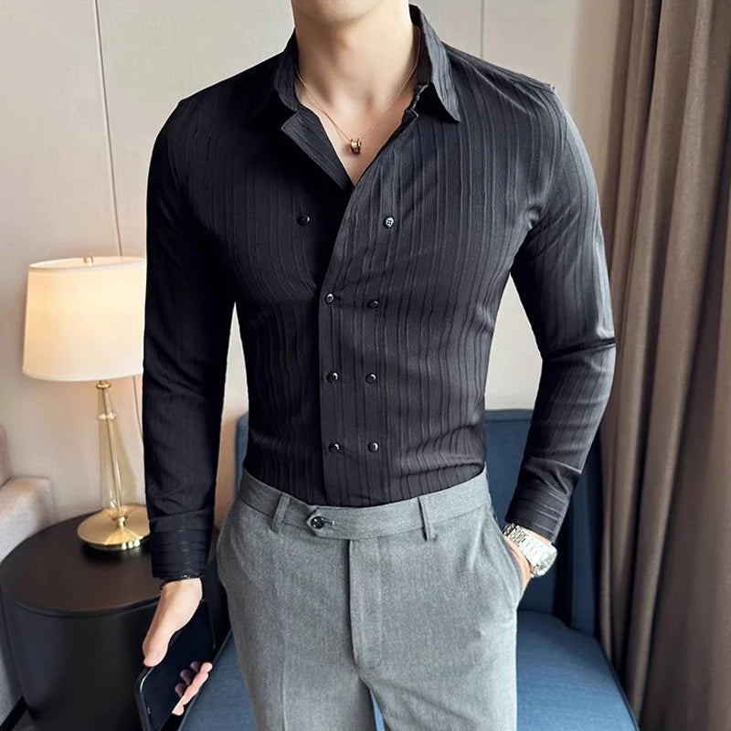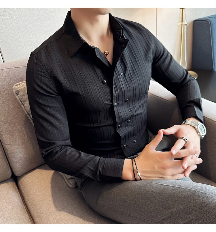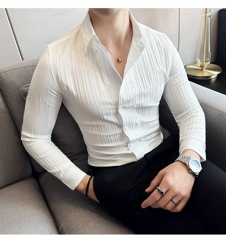 WIAOFELLAS  -  Double-breasted Camisa Masculino De Luxo Autumn Long Sleeve Slim Fit Striped Shirts Men Party Wedding Lapel Men's Dress Shirt