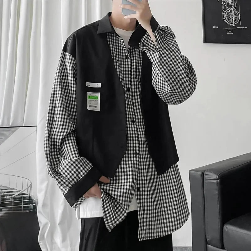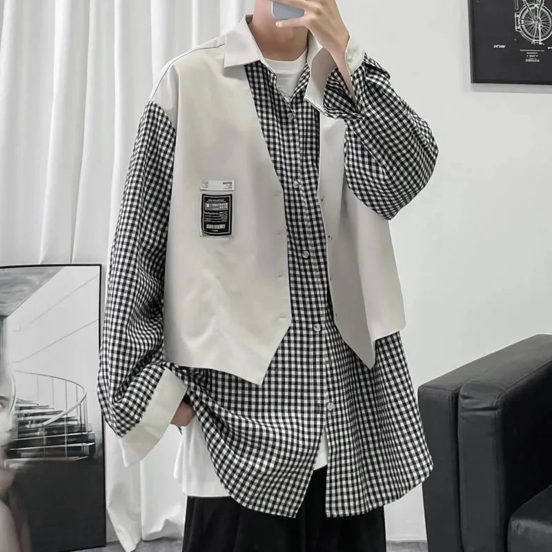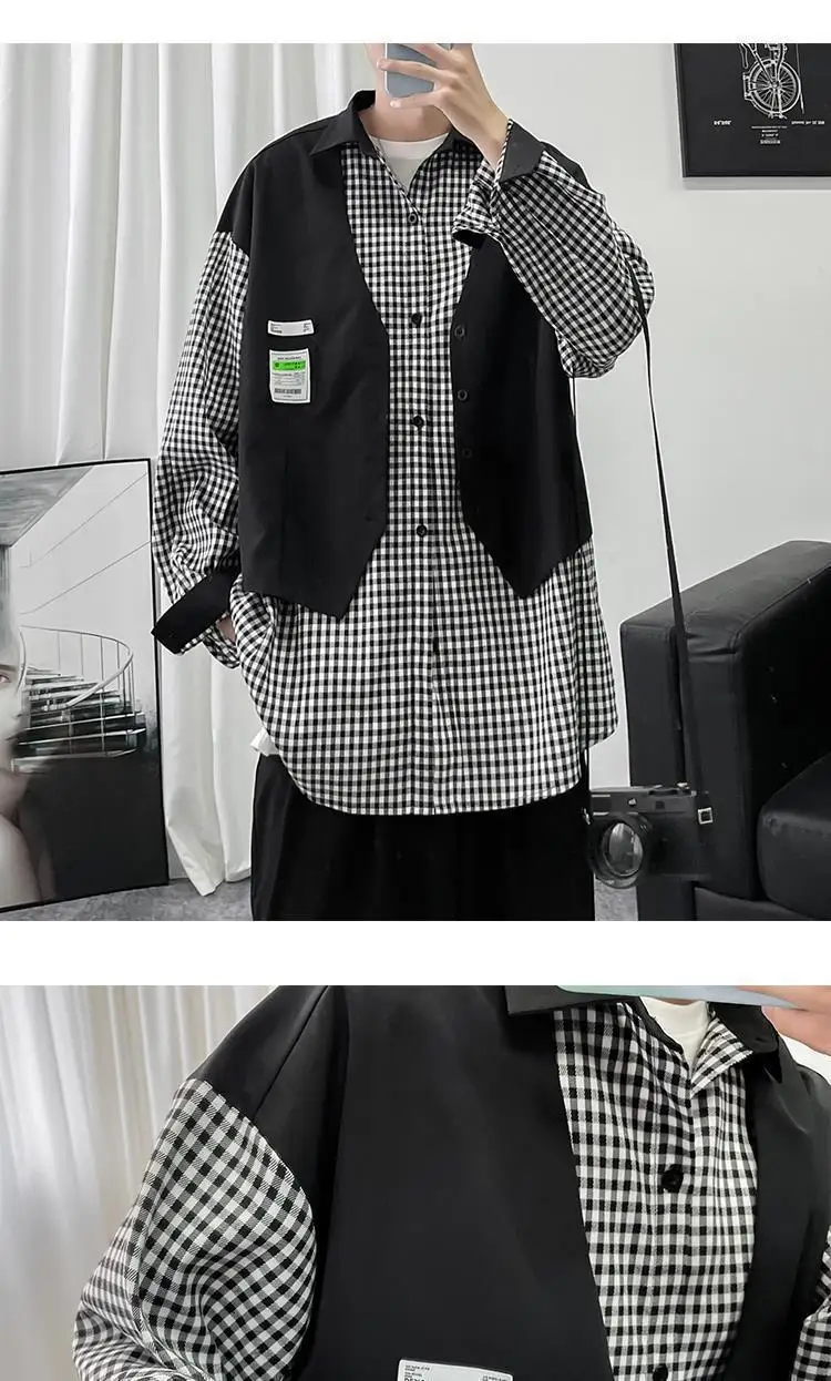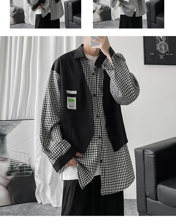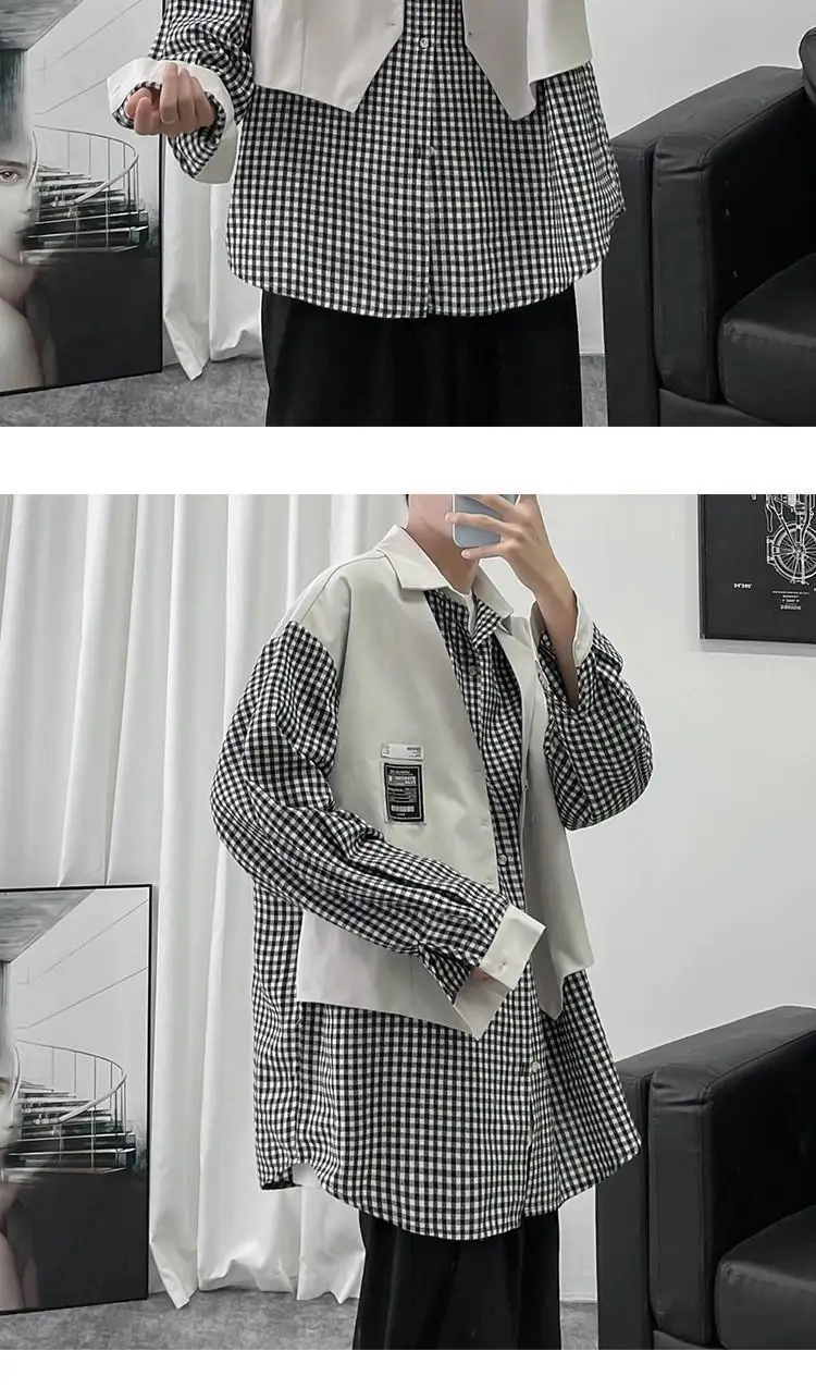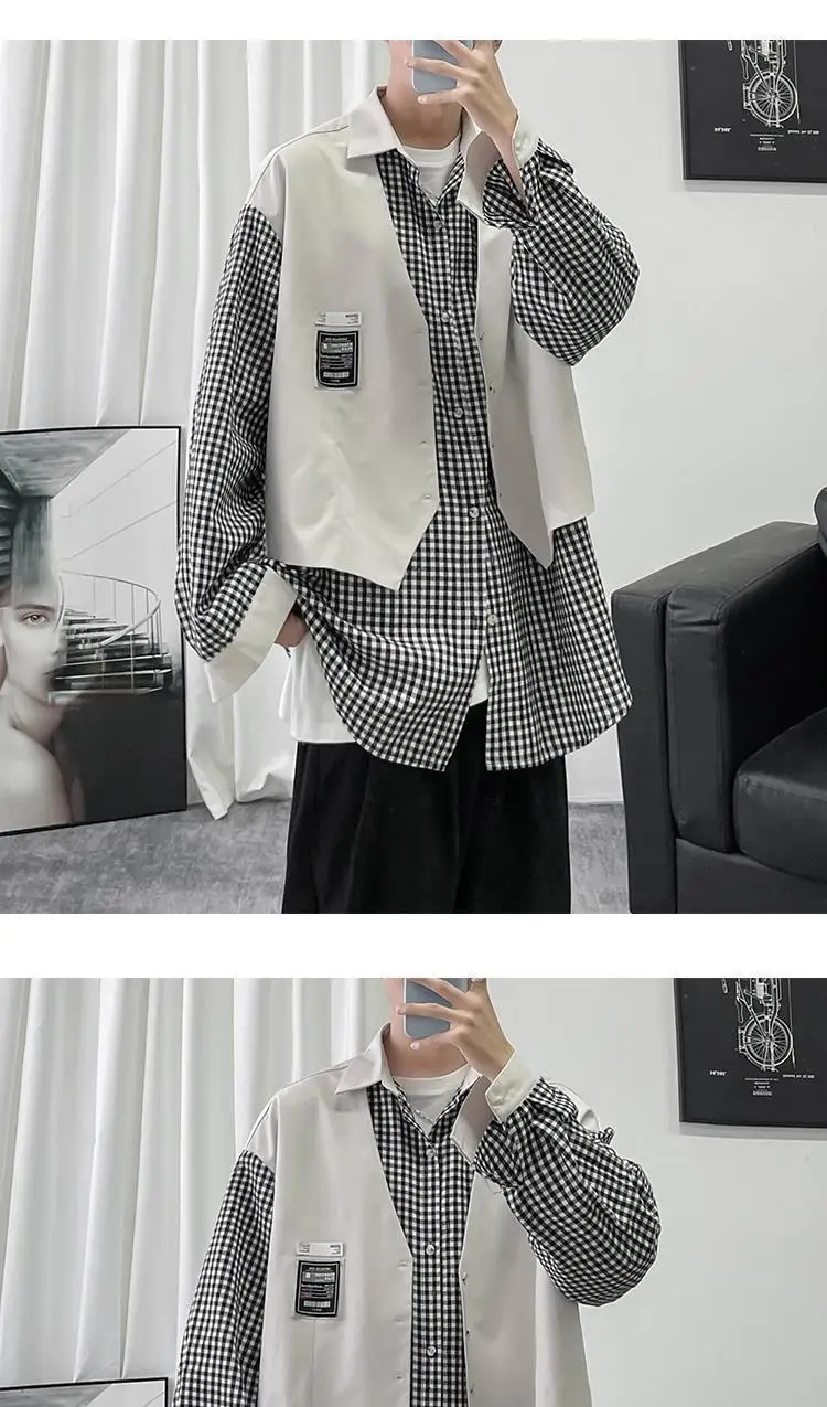 WIAOFELLAS - Fake Two-piece Plaid Spliced long-sleeved Shirt Loose Design Men's Casual Hong Kong Style Jacket Spring and Autumn New Style