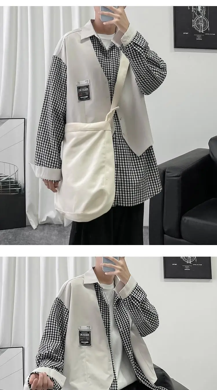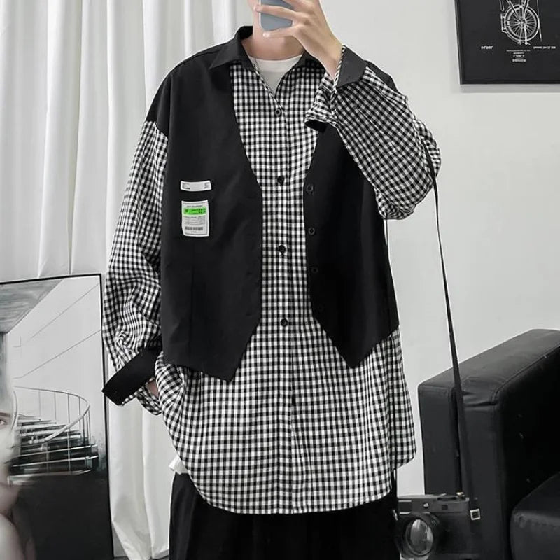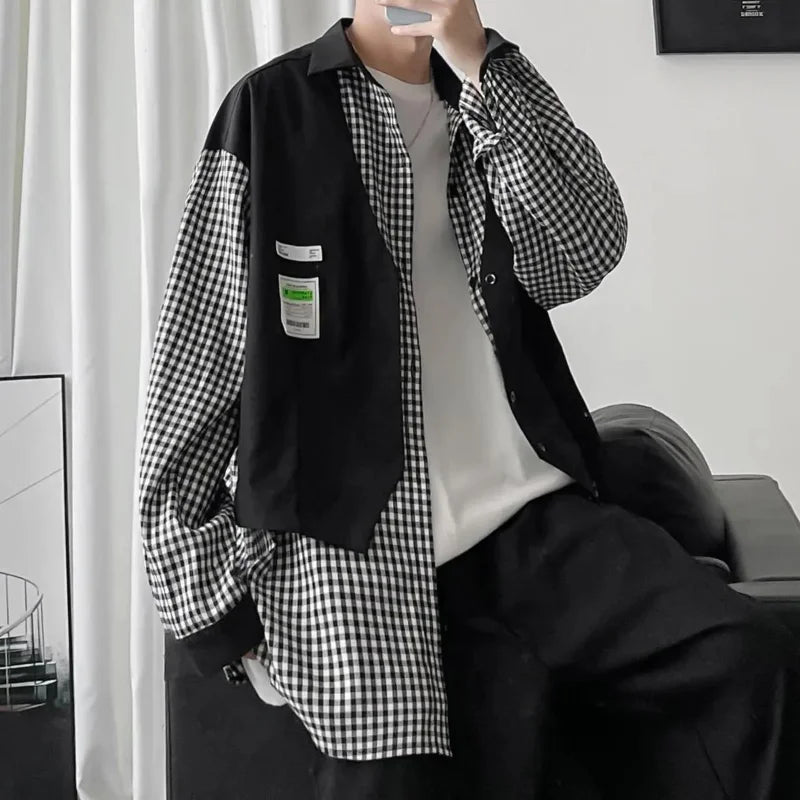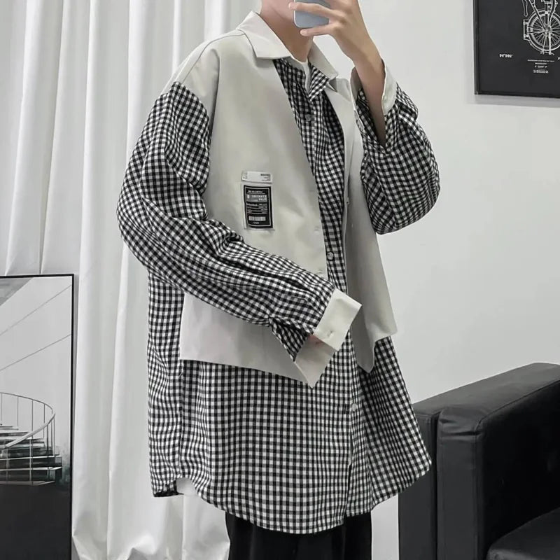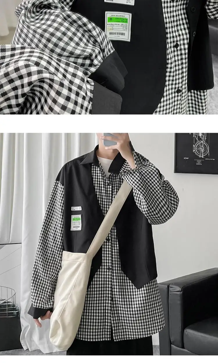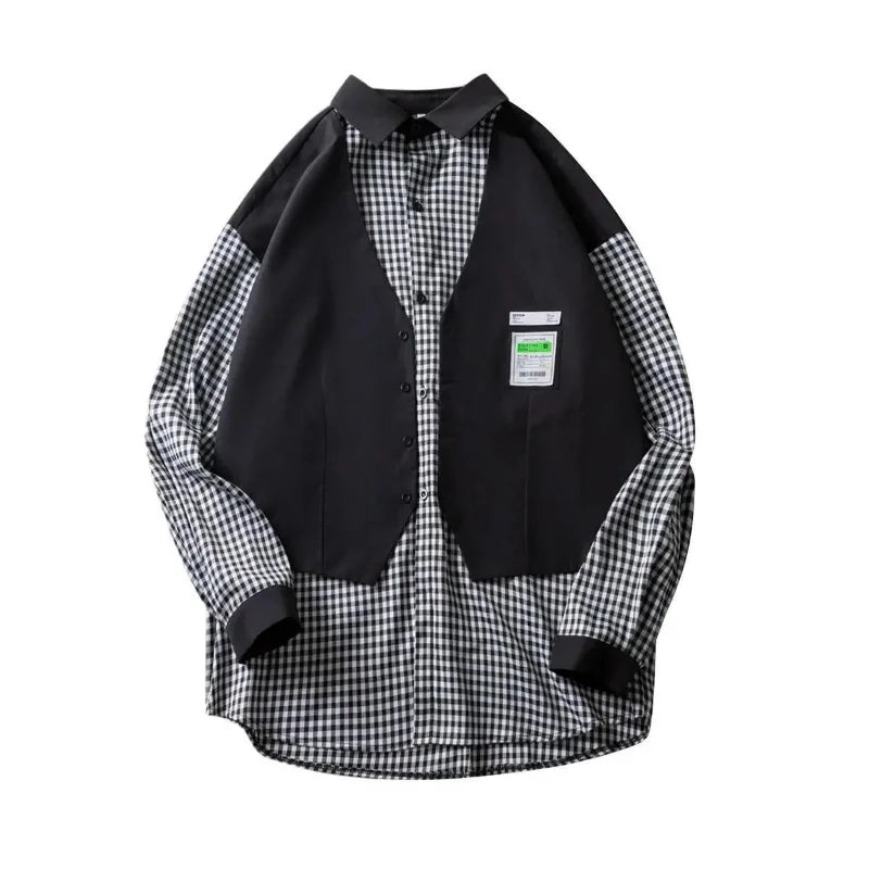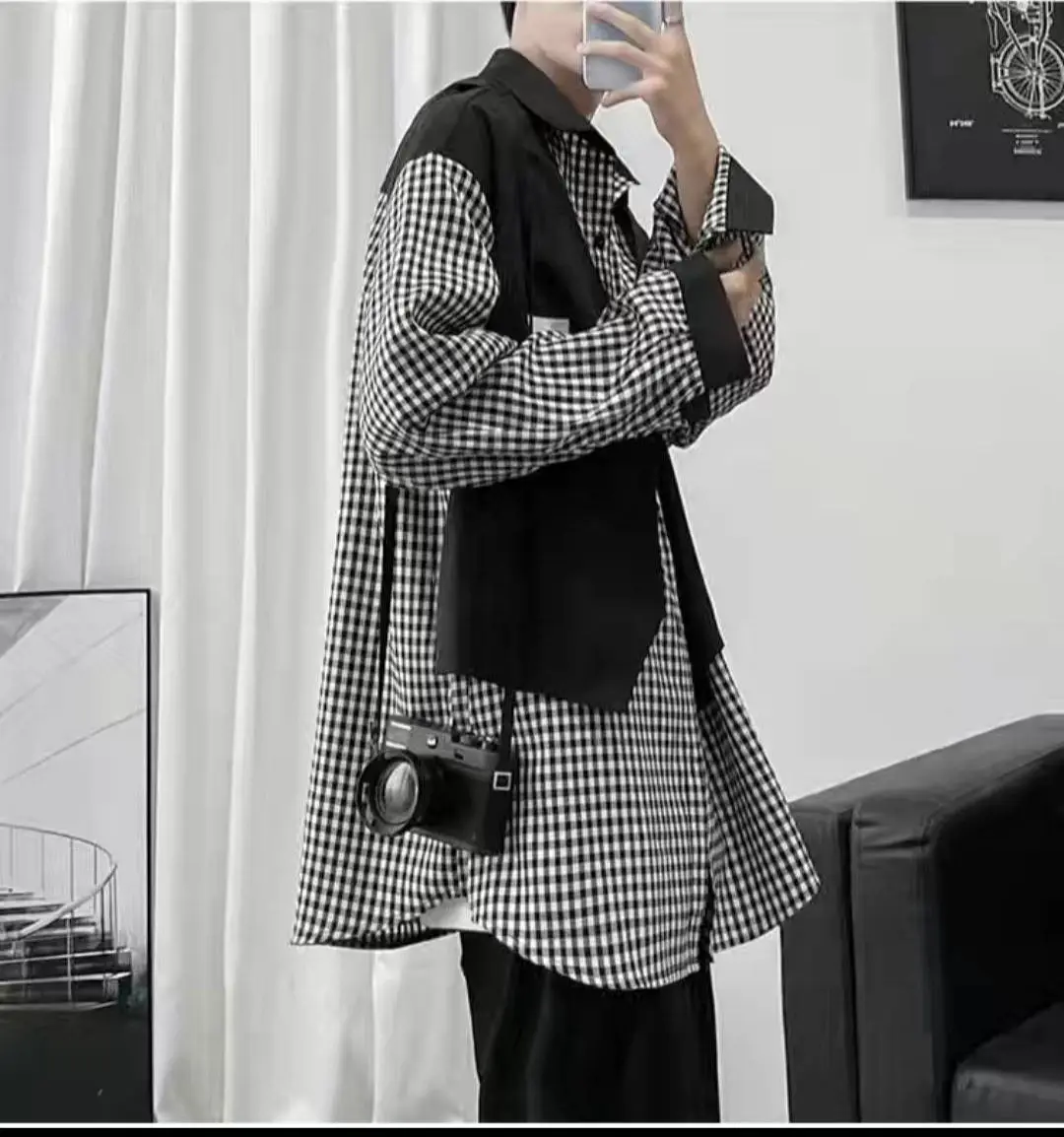 WIAOFELLAS - Fake Two-piece Plaid Spliced long-sleeved Shirt Loose Design Men's Casual Hong Kong Style Jacket Spring and Autumn New Style