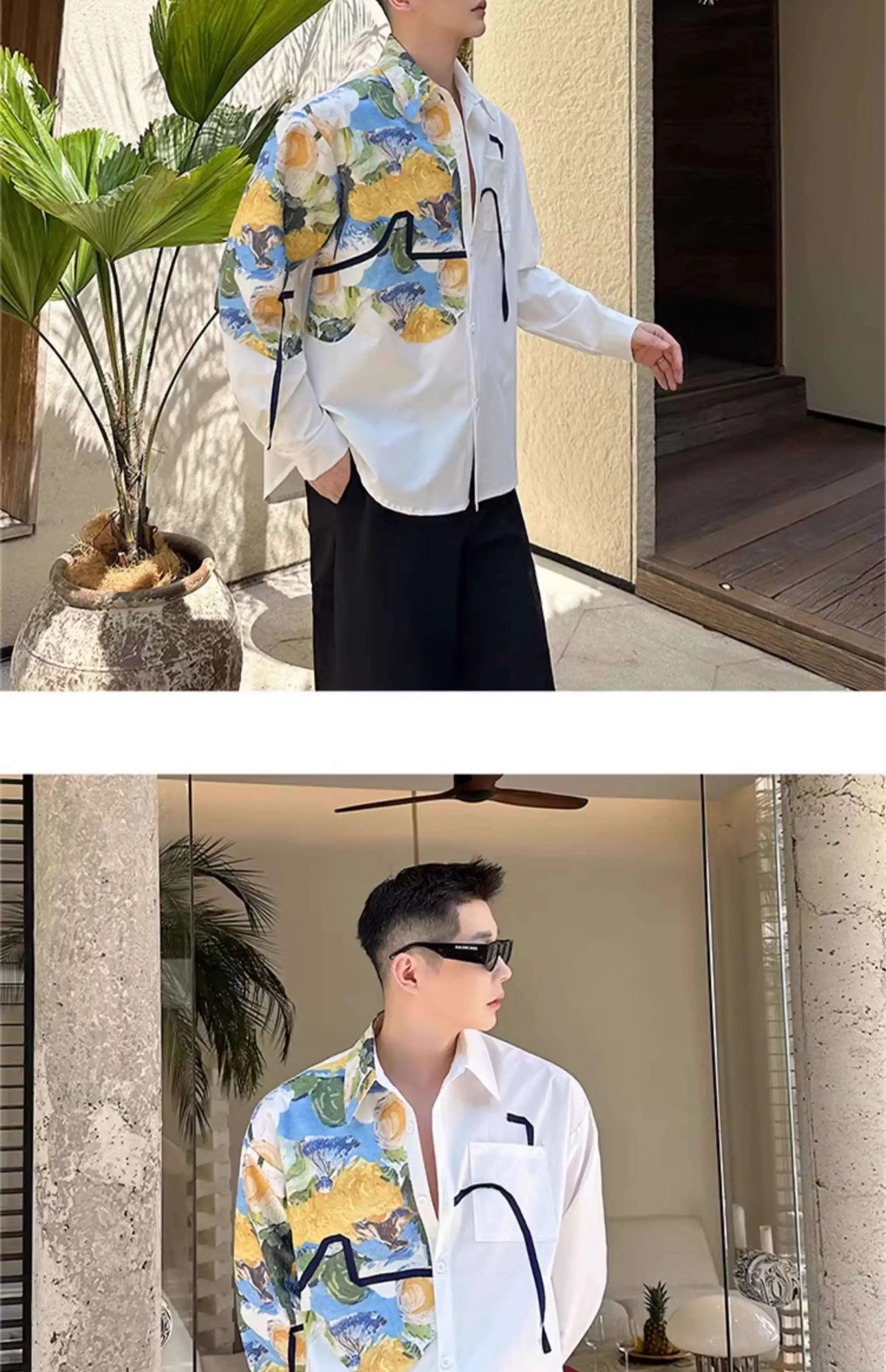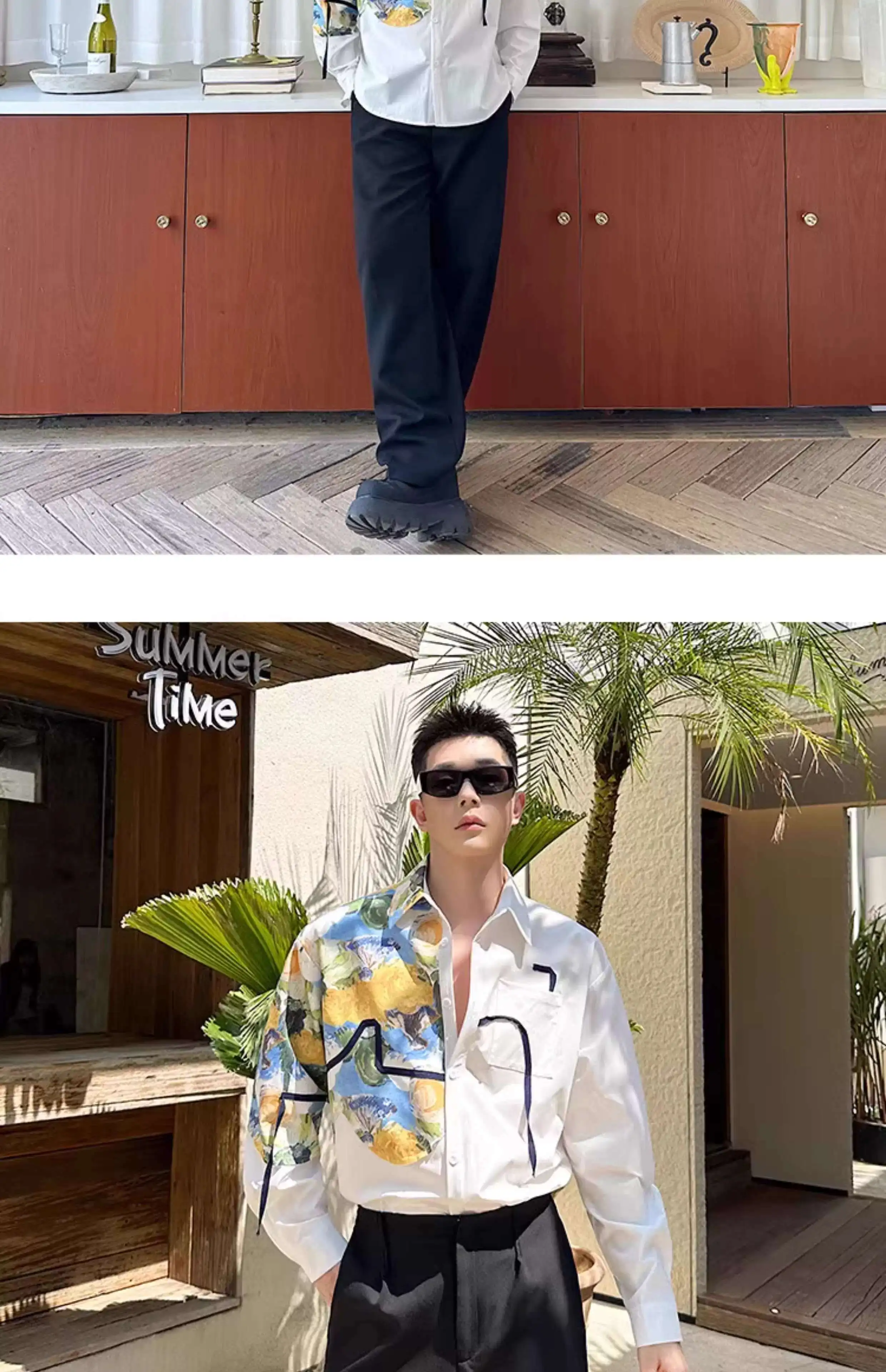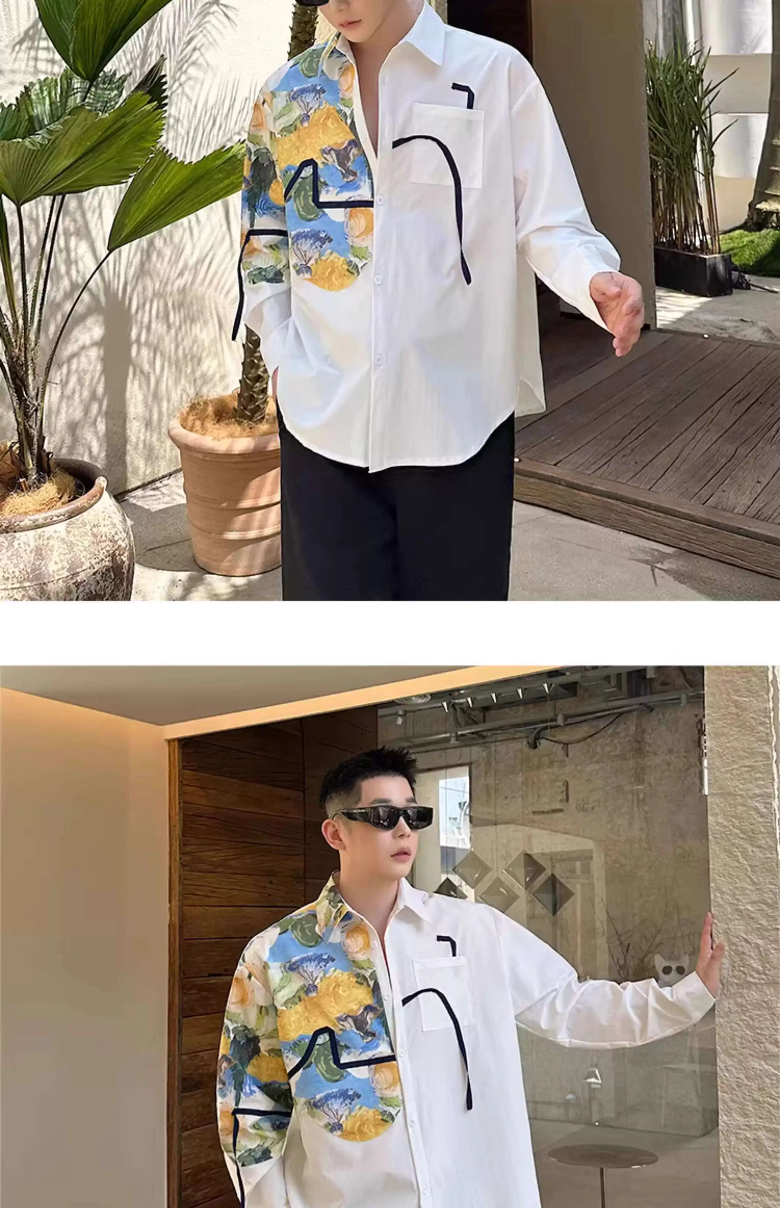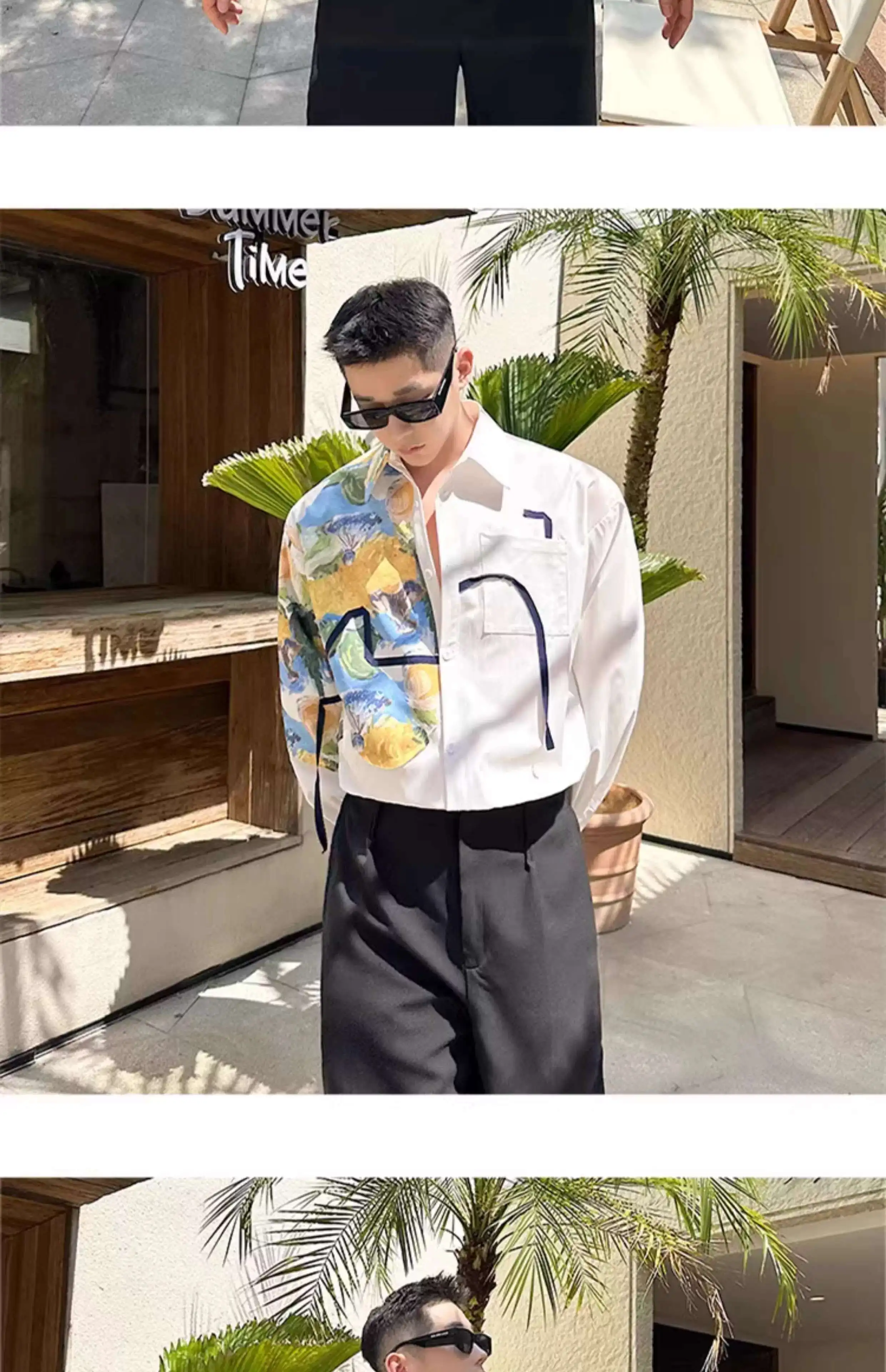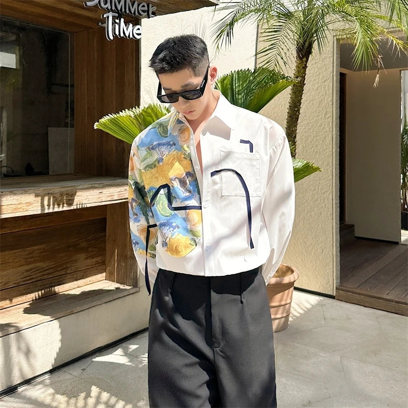 WIAOFELLAS - Fashion 2025 Summer Men‘s Irregular Print Bandage Design Casual Shirts Trendy Single-breasted Long Sleeves Tops Male