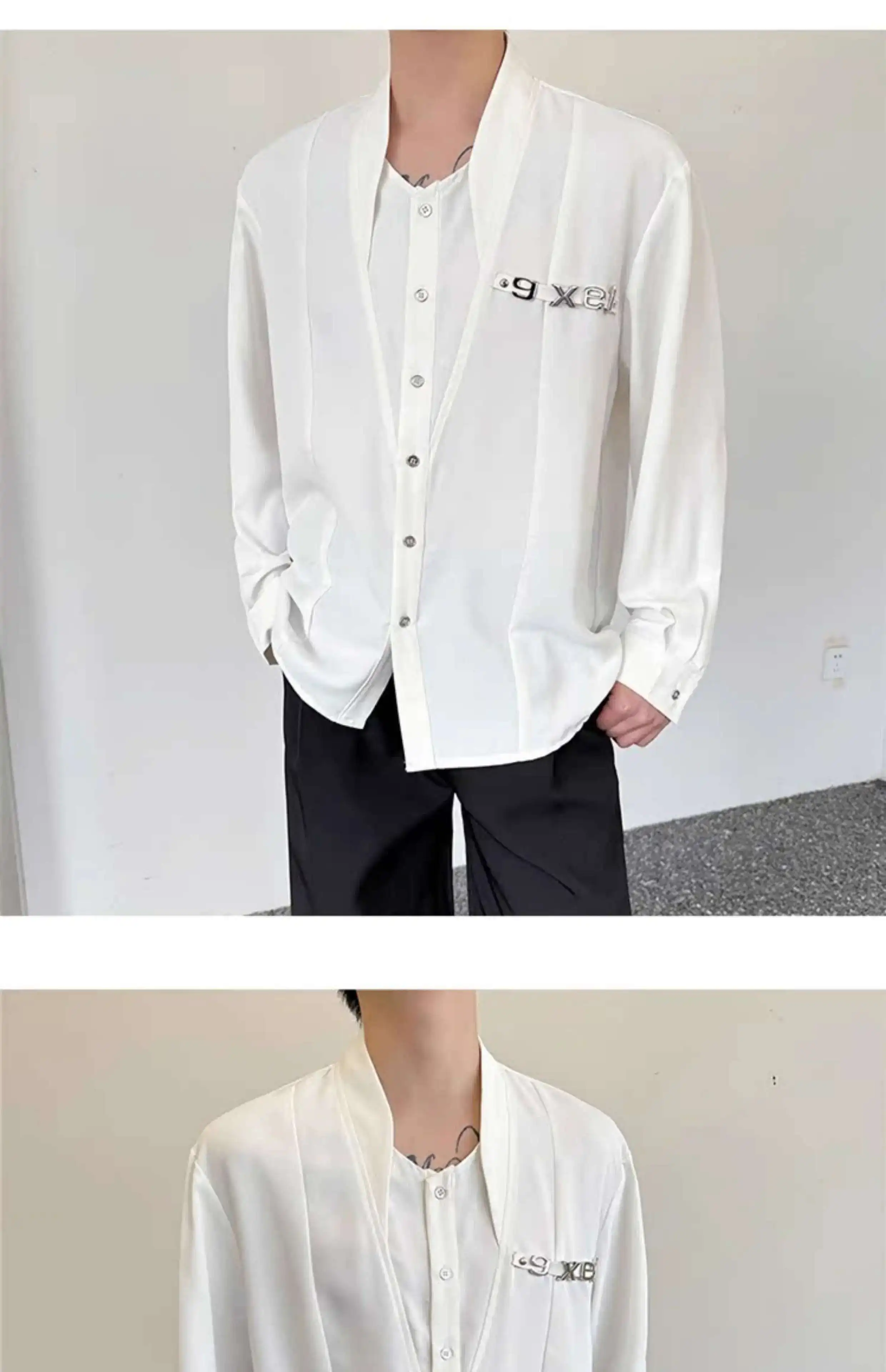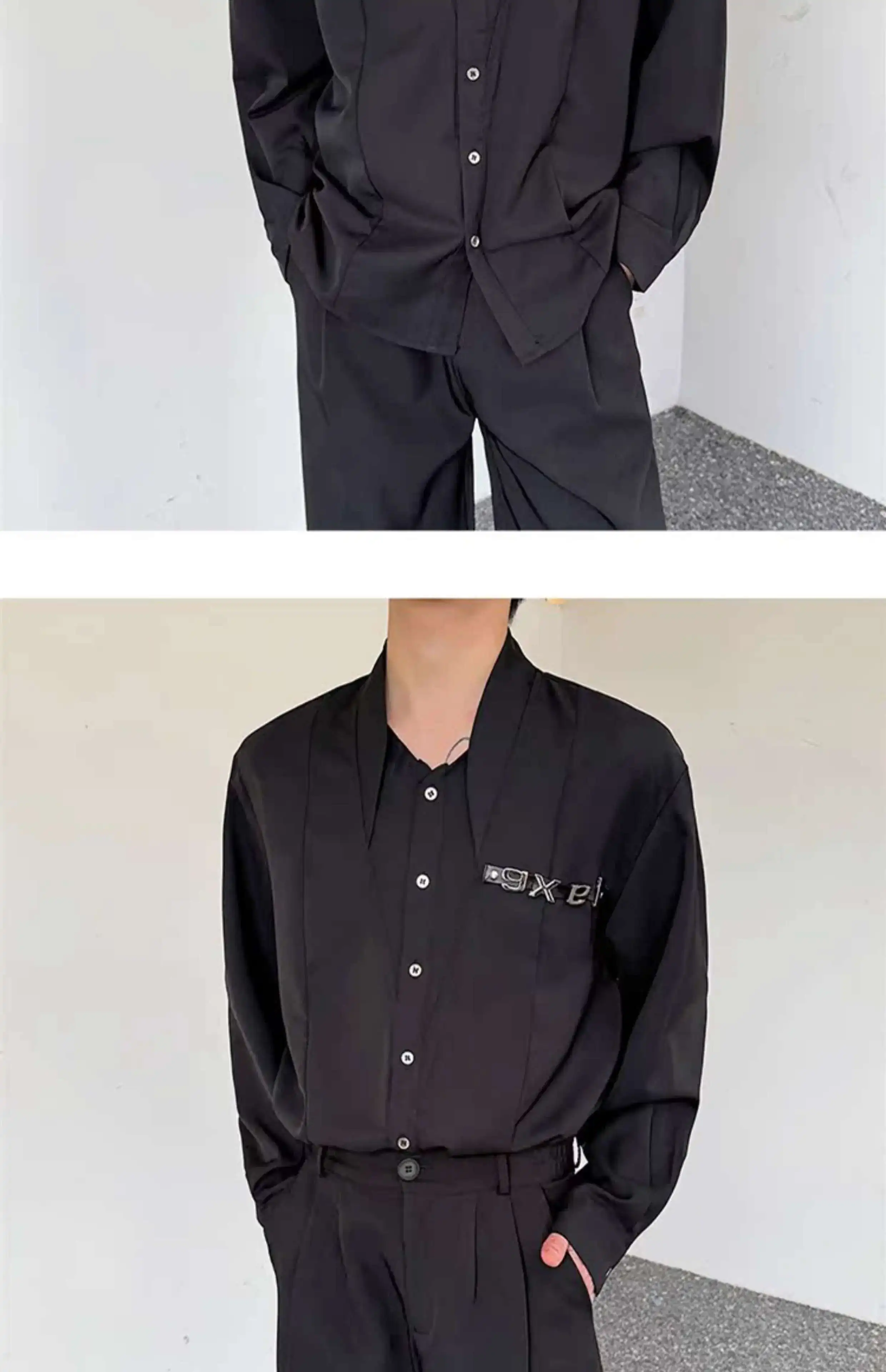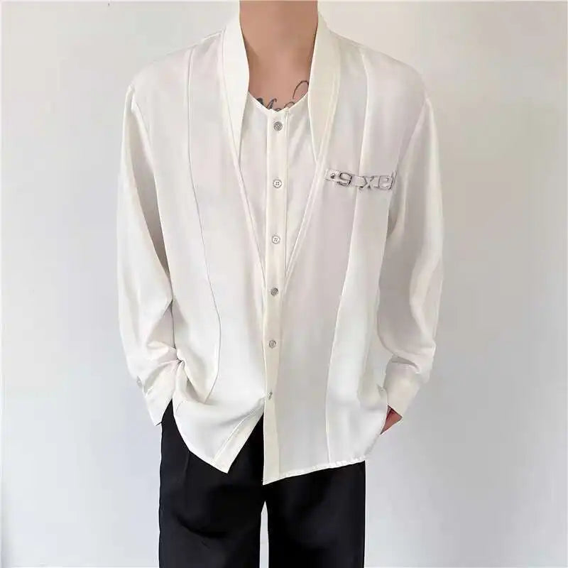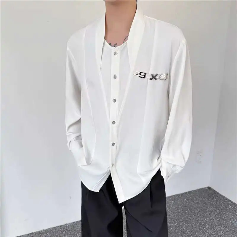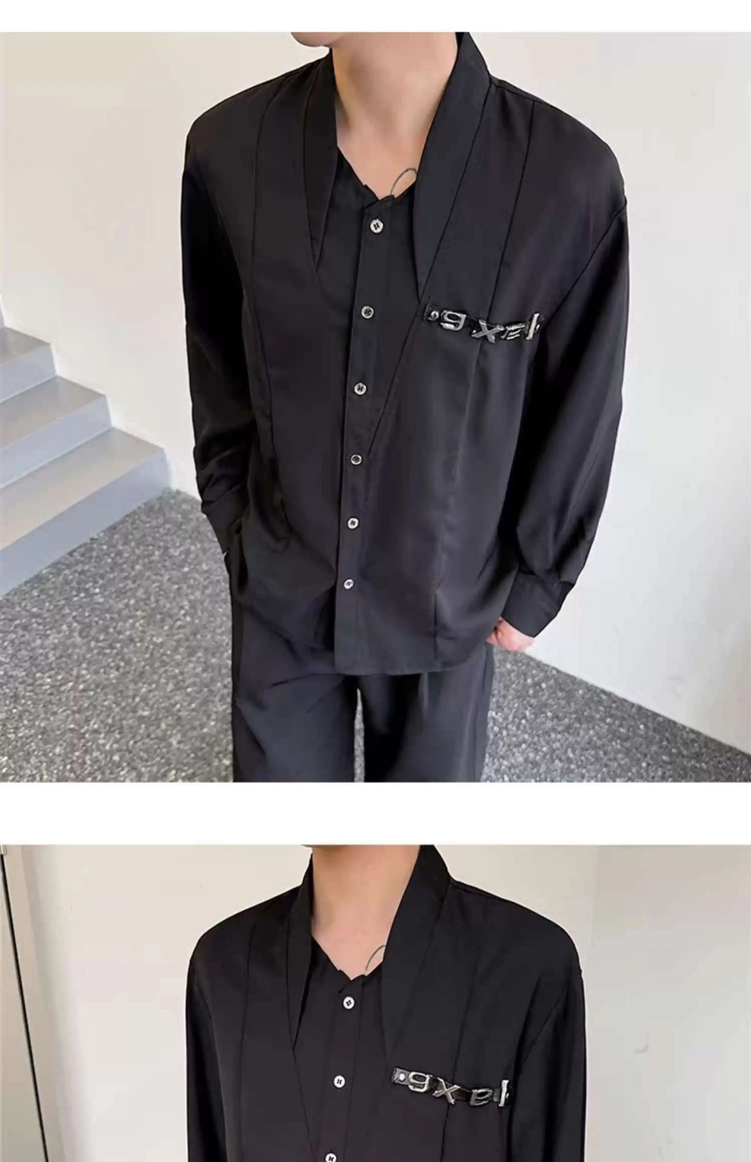 WIAOFELLAS - Fashion Men's Solid Color Patchwork Metals Design Casual Shirts Trendy Stand Collar Long Sleeves Blouses Male Summer