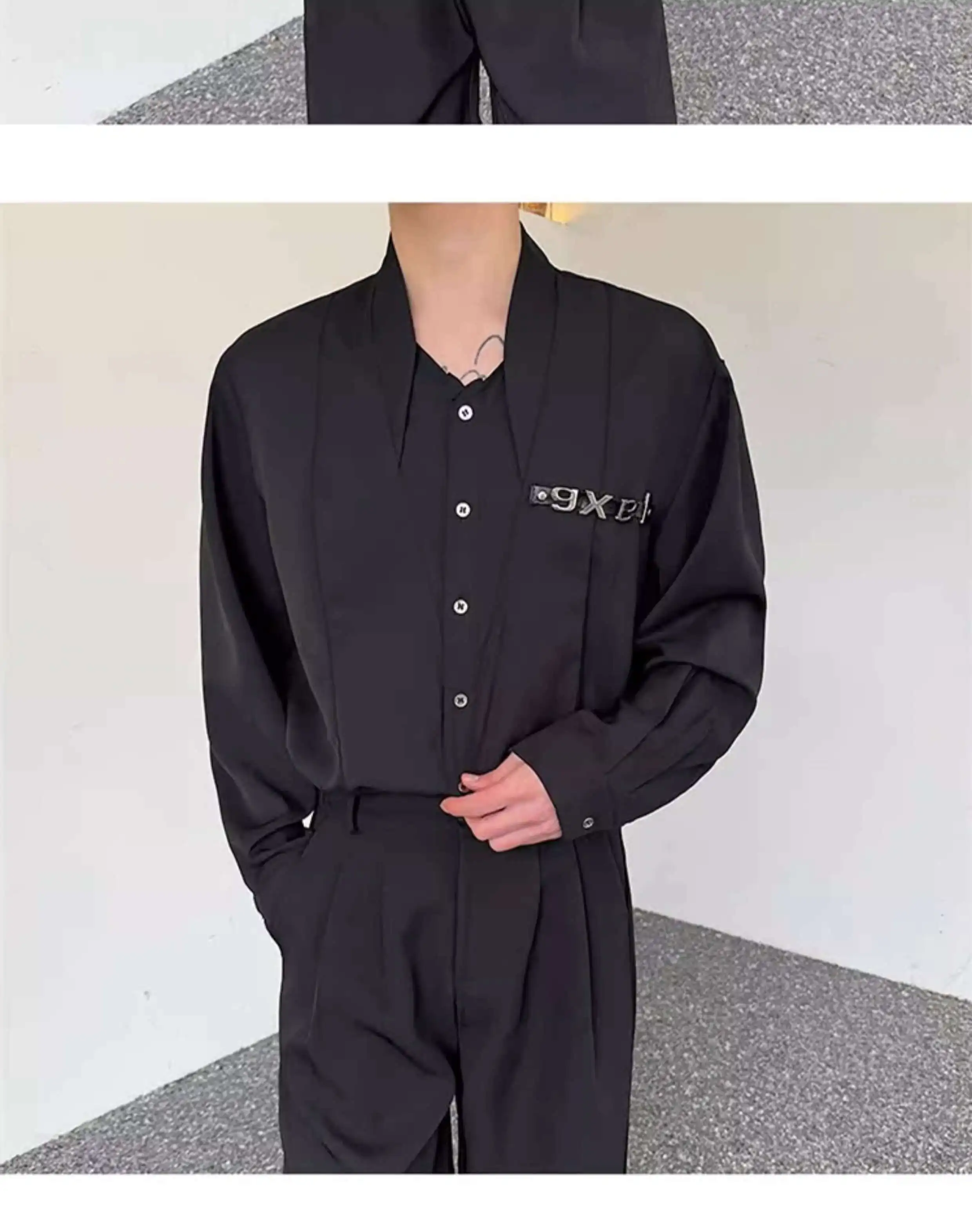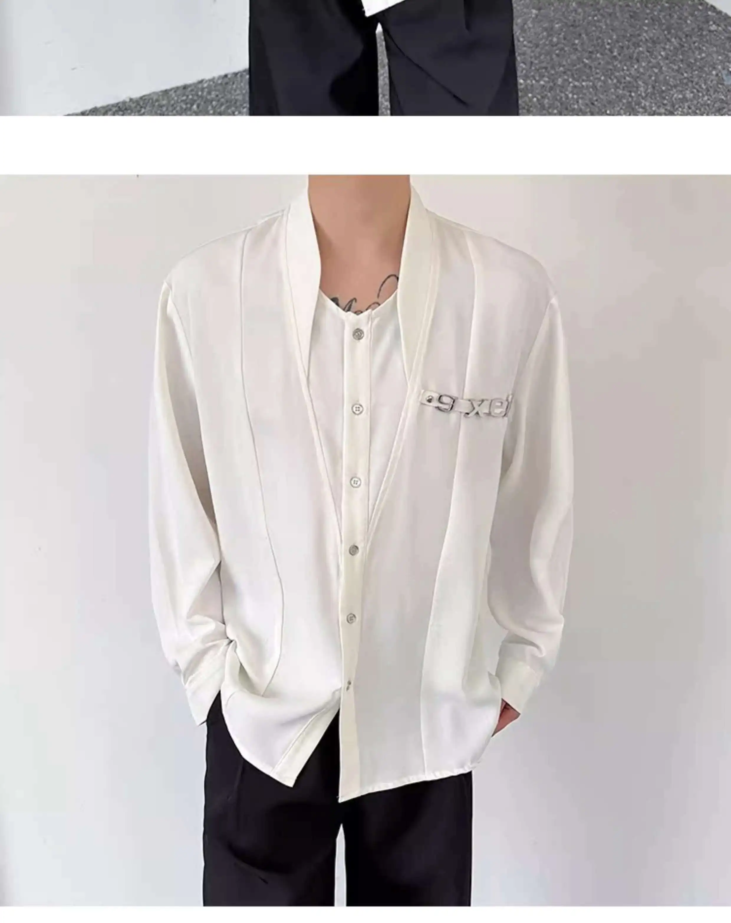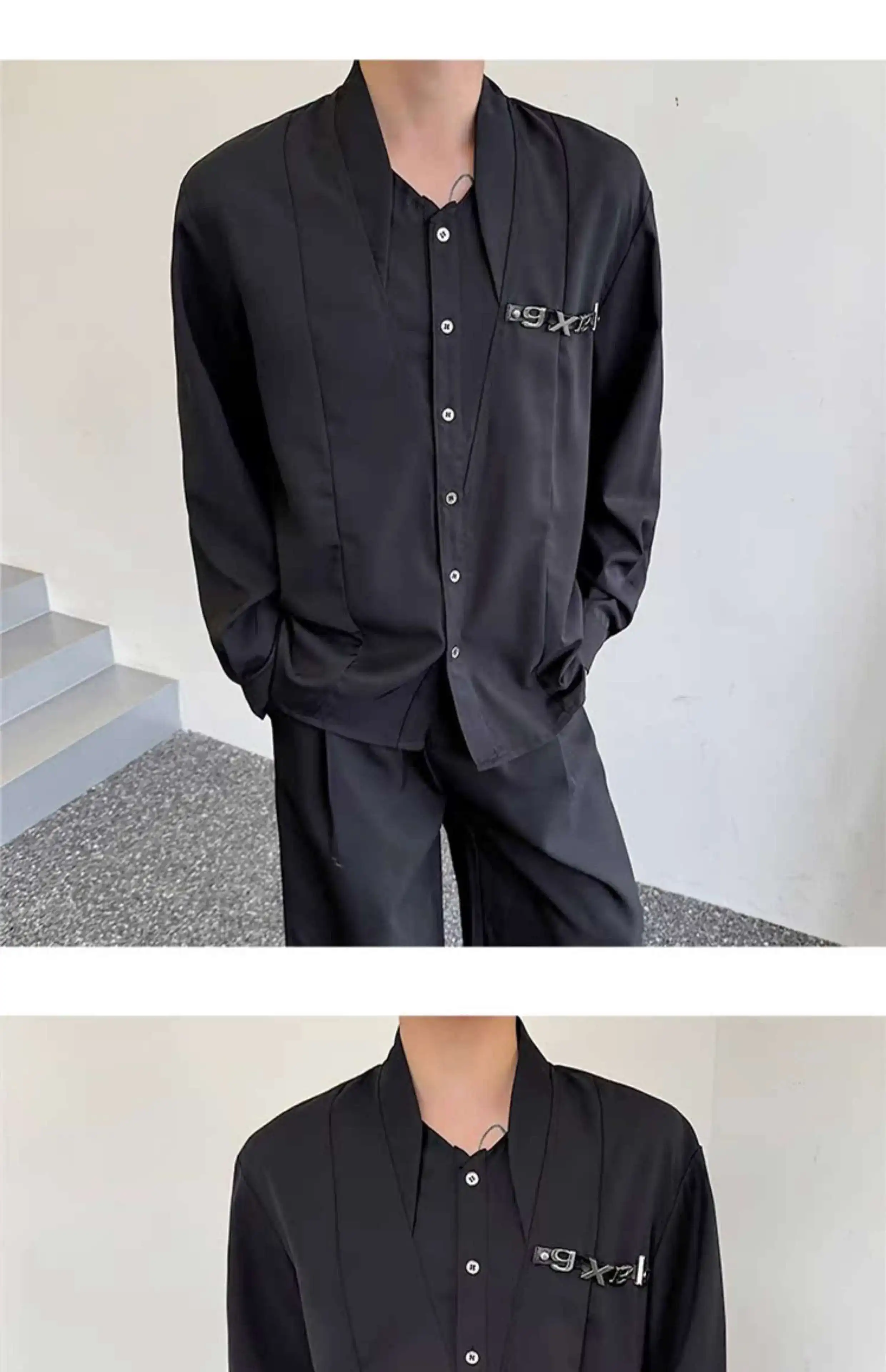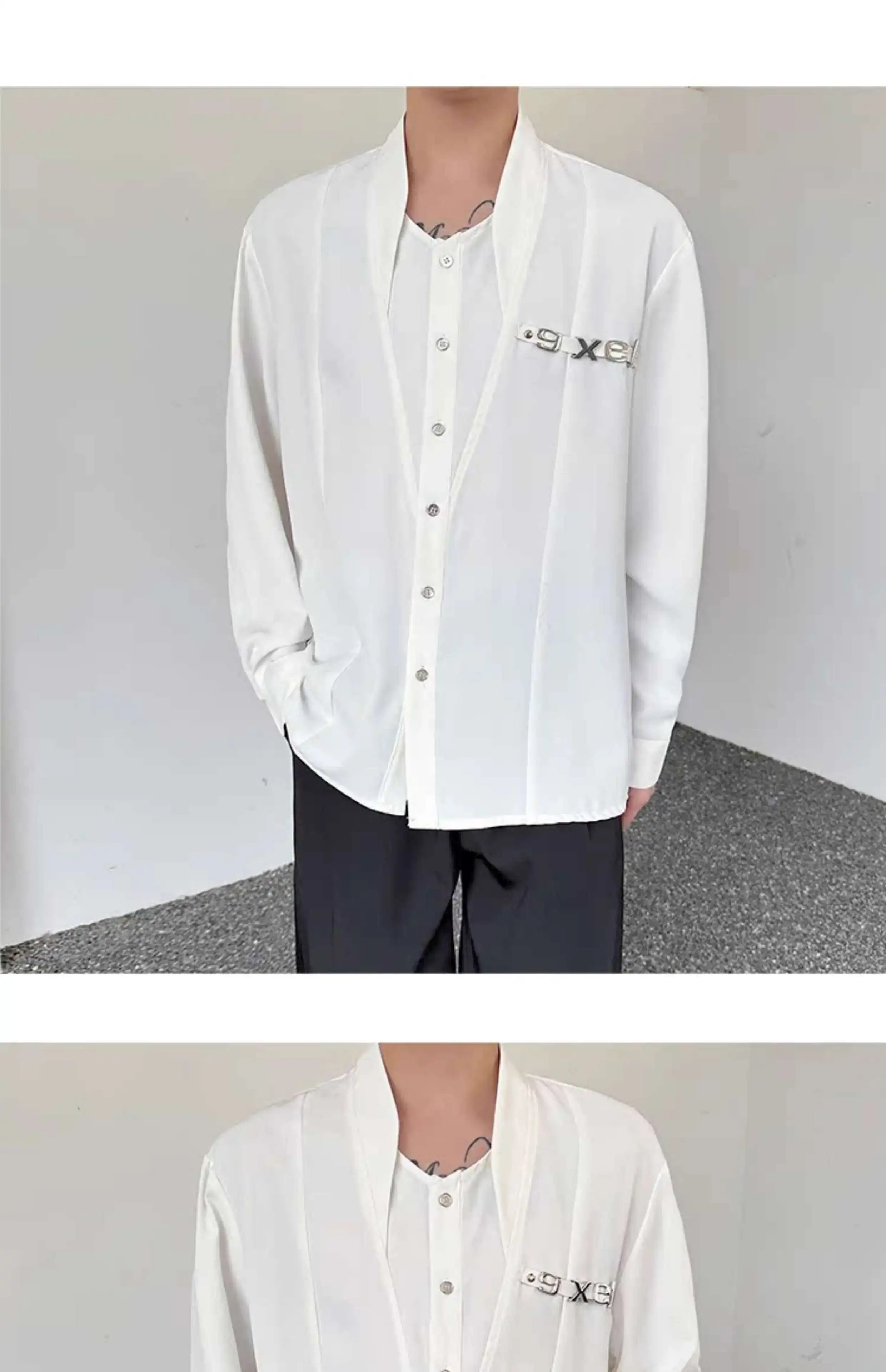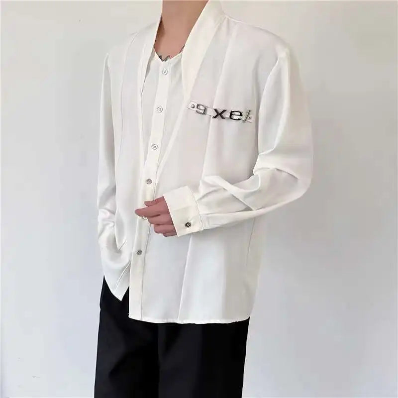 WIAOFELLAS - Fashion Men's Solid Color Patchwork Metals Design Casual Shirts Trendy Stand Collar Long Sleeves Blouses Male Summer