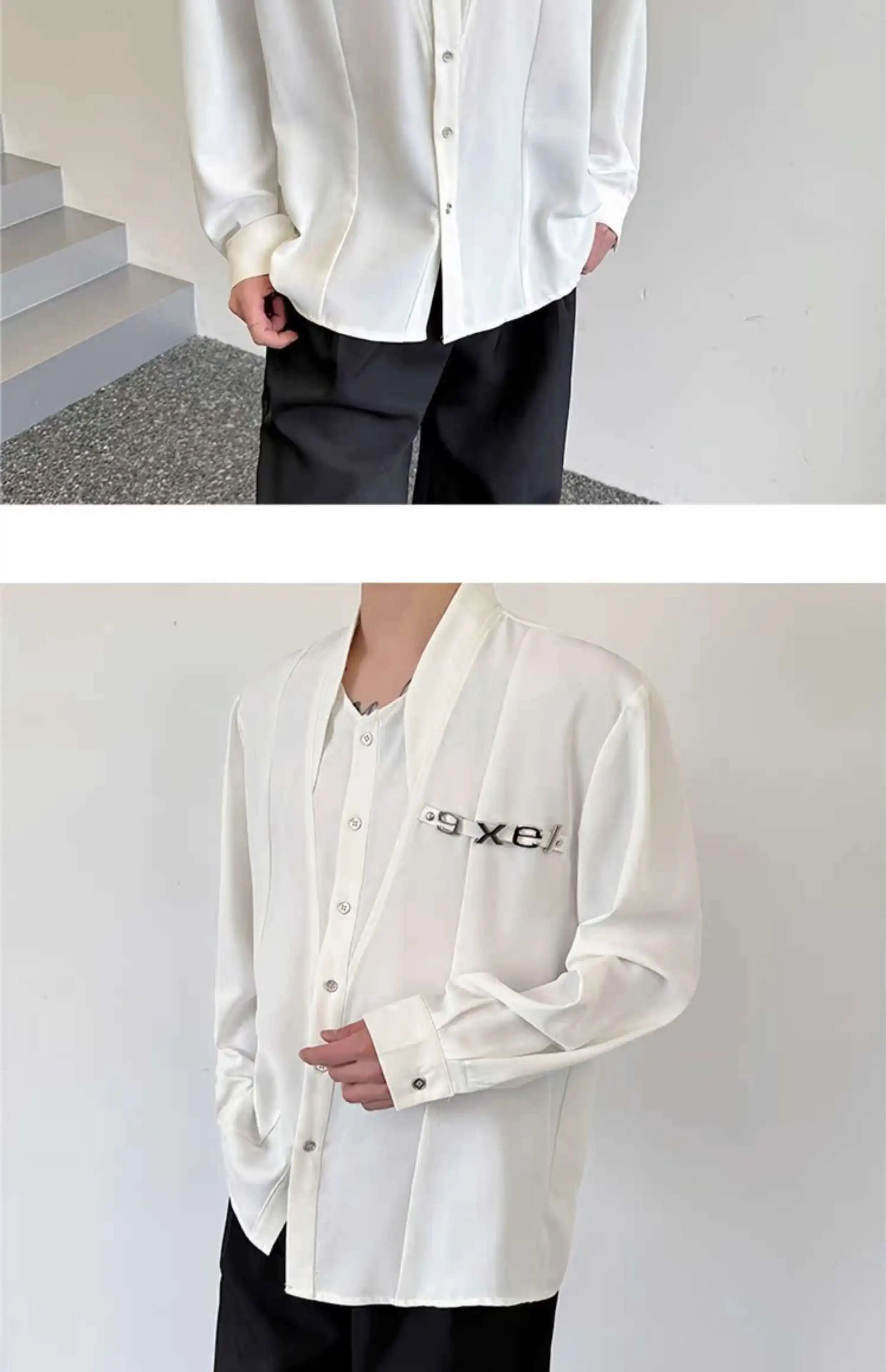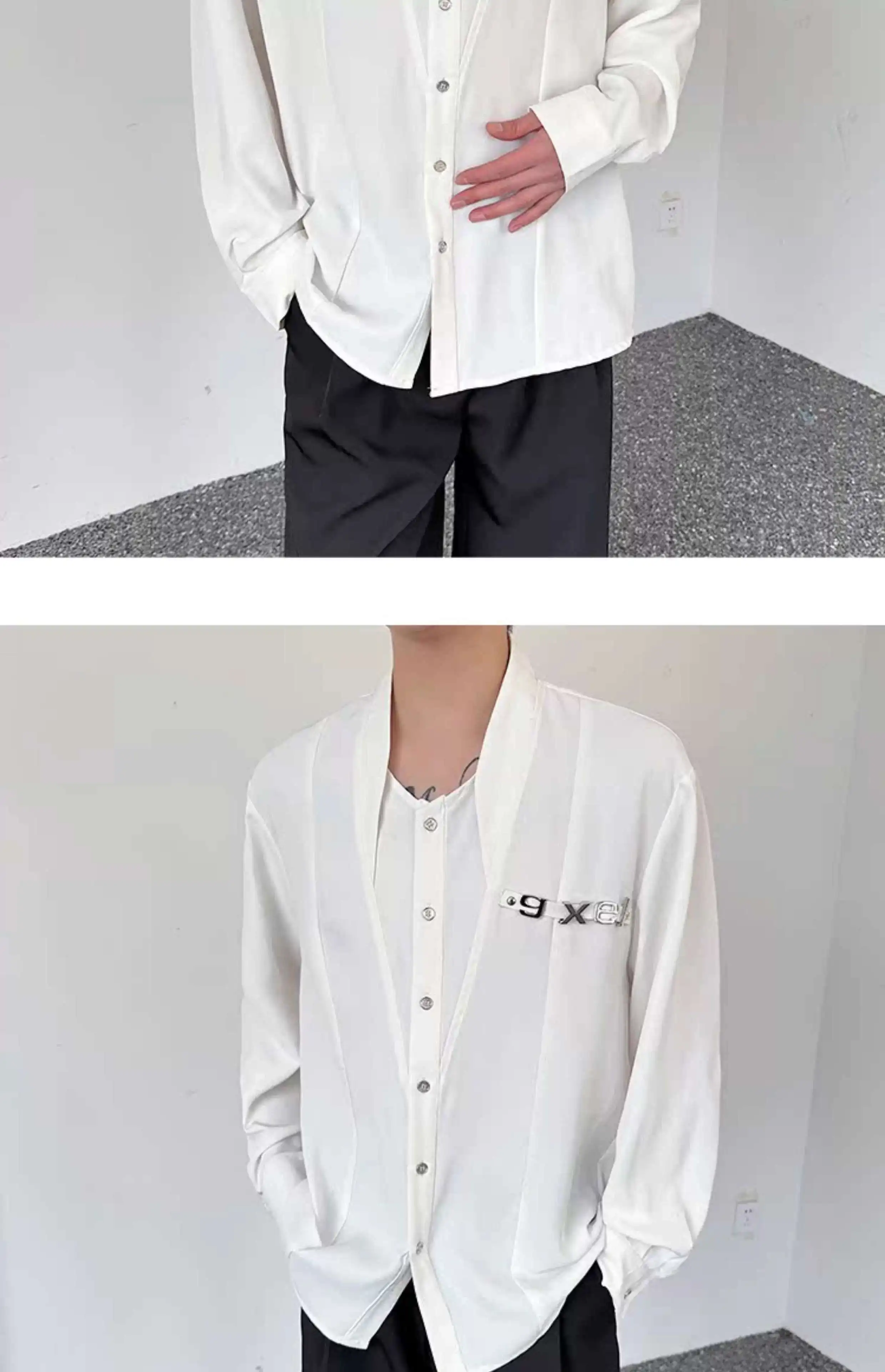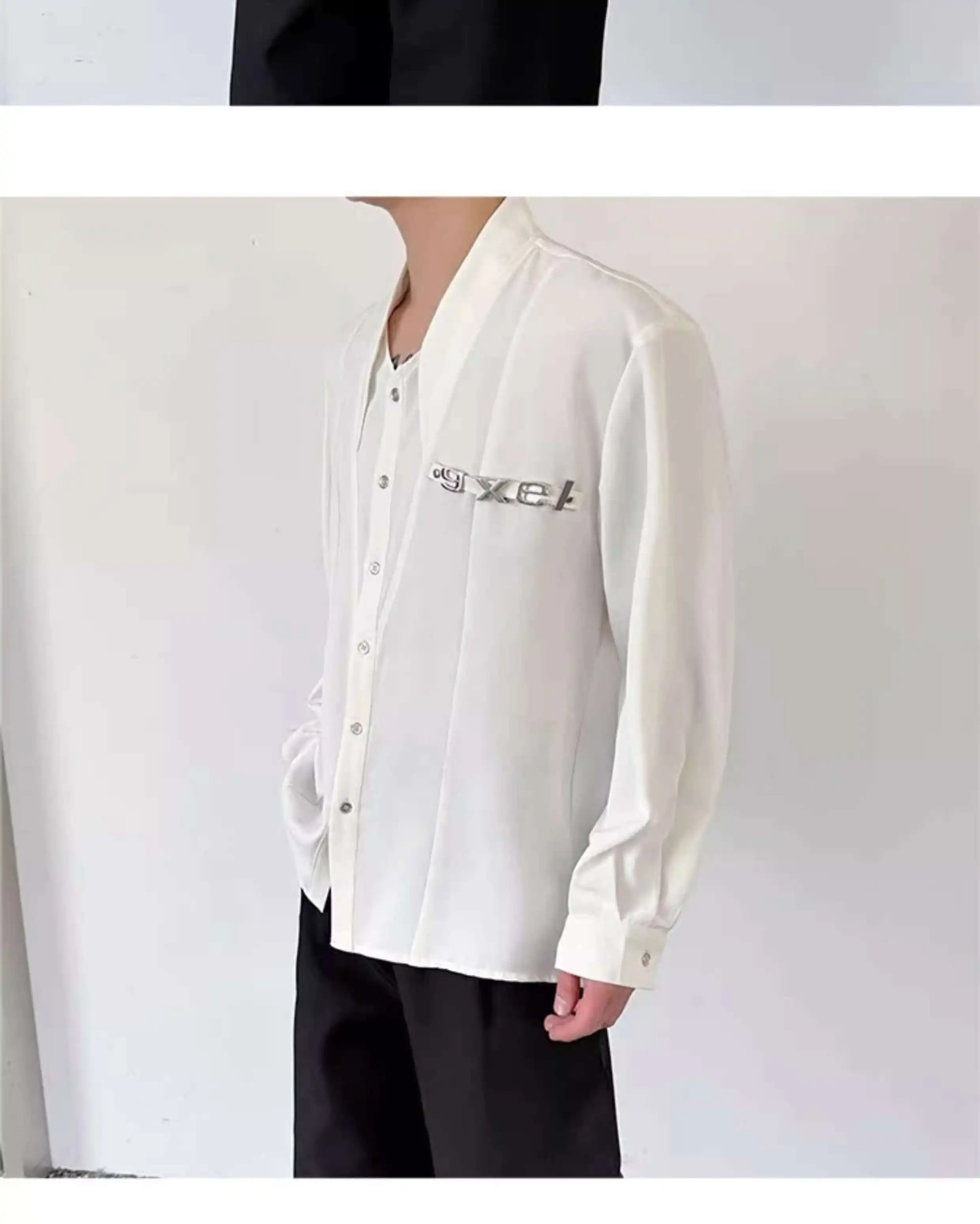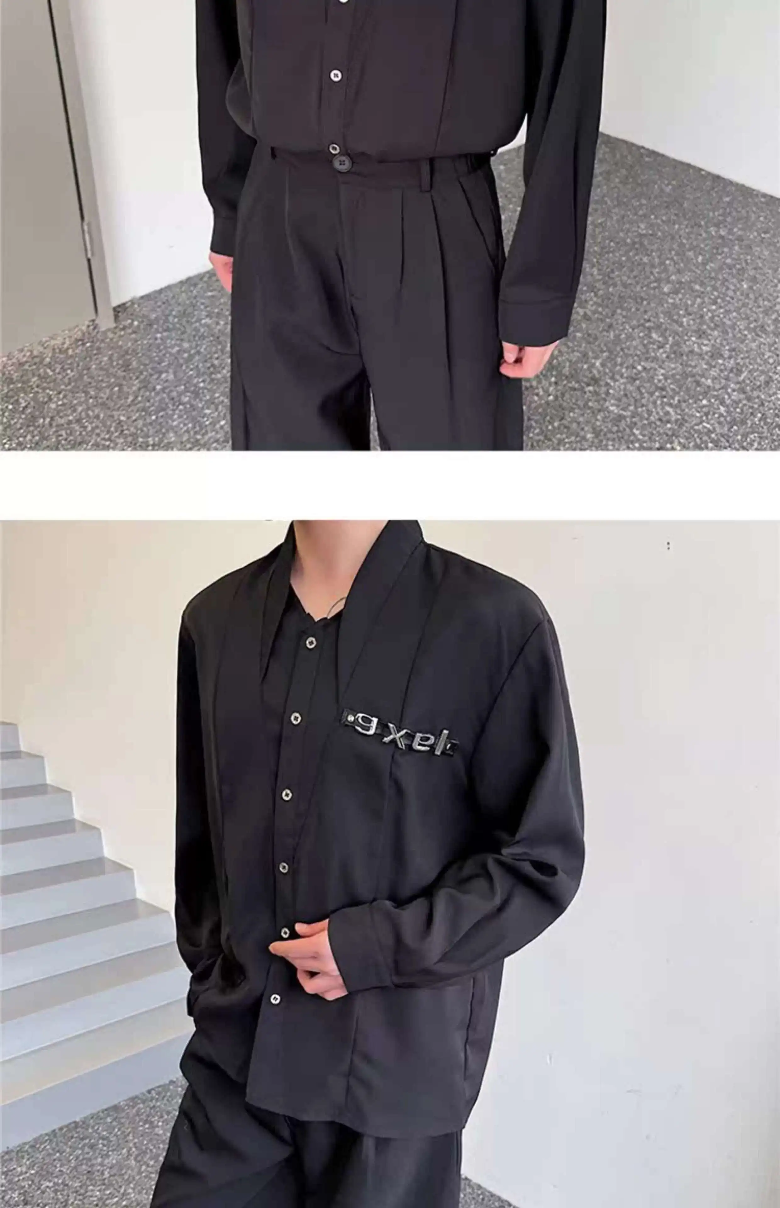 WIAOFELLAS - Fashion Men's Solid Color Patchwork Metals Design Casual Shirts Trendy Stand Collar Long Sleeves Blouses Male Summer